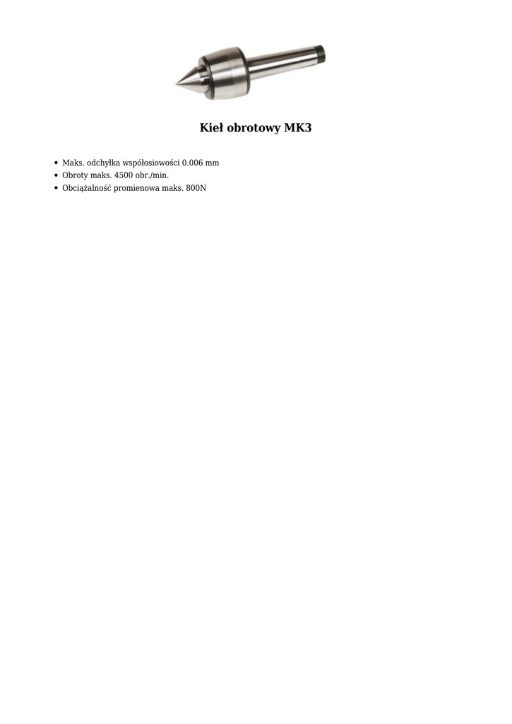 Kieł obrotowy MK3 Maks. odchyłka współosiowości 0.006 mm Obroty maks. 4500 obr./min. Obciążalność promienowa maks. 800N