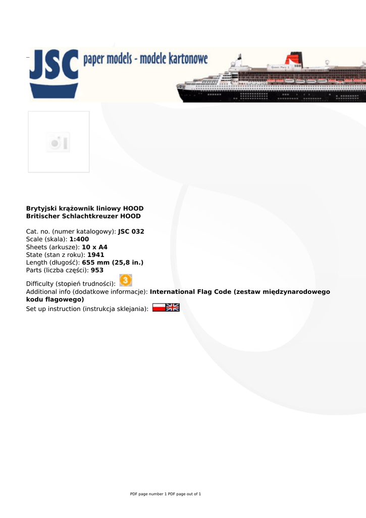 Brytyjski krążownik liniowy HOOD Britischer Schlachtkreuzer HOOD Cat. no. (numer katalogowy): JSC 032 Scale (skala): 1:400 Sheets (arkusze): 10 x A4 State (stan z roku): 1941 Length (długość): 655 mm (25,8 in.) Parts (liczba części): 953 Difficulty (stopień trudności): Additional info (dodatkowe informacje): International Flag Code (zestaw międzynarodowego kodu flagowego) Set up instruction (instrukcja sklejania): PDF page number 1 PDF page out of 1
