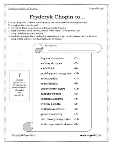 [ Wielcy ludzie – Chopin ] SuperKid.pl Fryderyk Chopin to... Czytając biografie Chopina, spotykamy się z różnymi określeniami tego muzyka. Przejrzyj poniższe określenia i: 1. wykreśl te, które na pewno nie odnoszą się do Chopina. 2. z tych wyrażeo, które zostaną, wypisz jedną literę – cyfry powiedzą ci, którą z kolei literę należy wybrad. 3. składając uzyskane litery po kolei w słowo dowiesz się, jak się nazywa okres w kulturze europejskiej, w której żył i tworzył Fryderyk Chopin. Rozwiązanie: .................................................................................. ! Uważaj na haczyki :) Nie sugeruj się jednym słowem, ale czytaj całe wyrażenie. Paganini fortepianu <11> wybitny skrzypek <7> wielki Polak <8> genialny poeta muzyczny <14> mistrz pędzla <11> poeta dźwięku <5> utalentowany pisarz <13> cudowne dziecko <6> następca Mozarta <4> wybitny pianista <2> następca Mieszka I <3> geniusz muzyczny <7> niezrównany kompozytor <14> mistrz operowania słowem <9> Copyright©SuperKid.pl www.superkid.pl