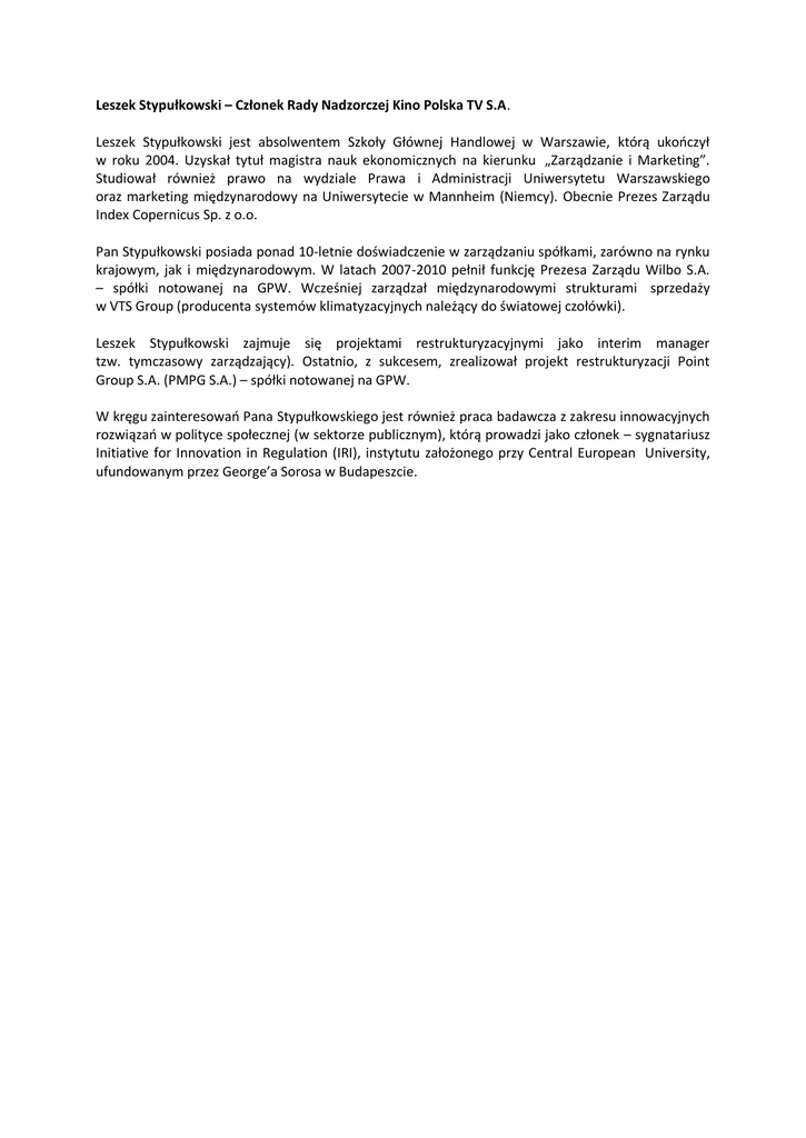 Leszek Stypułkowski – Członek Rady Nadzorczej Kino Polska TV S.A. Leszek Stypułkowski jest absolwentem Szkoły Głównej Handlowej w Warszawie, którą ukończył w roku 2004. Uzyskał tytuł magistra nauk ekonomicznych na kierunku „Zarządzanie i Marketing”. Studiował również prawo na wydziale Prawa i Administracji Uniwersytetu Warszawskiego oraz marketing międzynarodowy na Uniwersytecie w Mannheim (Niemcy). Obecnie Prezes Zarządu Index Copernicus Sp. z o.o. Pan Stypułkowski posiada ponad 10-letnie doświadczenie w zarządzaniu spółkami, zarówno na rynku krajowym, jak i międzynarodowym. W latach 2007-2010 pełnił funkcję Prezesa Zarządu Wilbo S.A. – spółki notowanej na GPW. Wcześniej zarządzał międzynarodowymi strukturami sprzedaży w VTS Group (producenta systemów klimatyzacyjnych należący do światowej czołówki). Leszek Stypułkowski zajmuje się projektami restrukturyzacyjnymi jako interim manager tzw. tymczasowy zarządzający). Ostatnio, z sukcesem, zrealizował projekt restrukturyzacji Point Group S.A. (PMPG S.A.) – spółki notowanej na GPW. W kręgu zainteresowań Pana Stypułkowskiego jest również praca badawcza z zakresu innowacyjnych rozwiązań w polityce społecznej (w sektorze publicznym), którą prowadzi jako członek – sygnatariusz Initiative for Innovation in Regulation (IRI), instytutu założonego przy Central European University, ufundowanym przez George’a Sorosa w Budapeszcie.