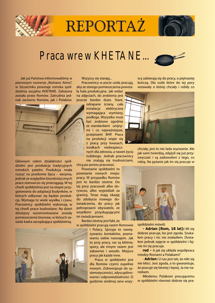 Praca wre w KHETANE... Jak już Państwa informowaliśmy w pierwszym numerze „Romano Atmo”, w Szczecinku powstaje romska spółdzielnia socjalna KHETANE. Założona została przez Romów. Zatrudnia jednak zarówno Romów, jak i Polaków. Głównym celem działalności spółdzielni jest produkcja tradycyjnych romskich patelni. Produkcja miała ruszyć na przełomie lipca – sierpnia, jednak ze względów biurokratycznych prace stanowczo się przeciągają. W tej chwili spółdzielnia jest na etapie przygotowania do adaptacji budynków, w których odbywać się będzie produkcja. Wymaga to wiele wysiłku i czasu. Pracownicy spółdzielni wykonują w tej chwili prace budowlane. Na dzień dzisiejszy wyremontowane zostały pomieszczenia biurowe, w których zasiada kadra zarządzająca spółdzielnią. Wszyscy się starają... Pracownicy w pocie czoła pracują, aby ze starego pomieszczenia powstała hala produkcyjna. Jak widać na zdjęciach, do zrobienia jest jeszcze bardzo dużo. Stare, odrapane ściany, cała instalacja elektryczna wymagająca wymiany, podłoga. Wszystko musi być zrobione zgodnie ze standardami unijnymi i co najważniejsze, przepisami BHP. Praca na produkcji wiąże się z pracą przy kwasach, środkach niebezpiecznych dla zdrowia, a nawet życia ludzkiego. Jednak pracownicy nie zrażają się trudnościami, chcą po prostu pracować. Powstanie spółdzielni to powstanie nowych miejsc pracy. W przypadku Romów jest to bardzo istotne. Do tej pory pracowali albo dorywczo, albo wyjeżdżali za granicę. Teraz mają okazję do zdobycia nowego doświadczenia, do pracy jak pełnoprawni obywatele, ze wszelkimi przysługującymi im świadczeniami. Bardzo istotny jest fakt, że w spółdzielni pracują razem Romowie i Polacy. Sprzyja to nawiązywaniu kontaktów, poznawaniu siebie nawzajem. Jak to przy pracy, raz są kłótnie, spory, ale innym razem jest zabawnie i wesoło. Miejsce pracy jak każde inne. Praca w spółdzielni jest dla Romów czymś zupełnie nowym. Zobowiązuje do systematyczności, zdyscyplinowania i odpowiedzialności. O godzinie siódmej rano wszy- scy zabierają się do pracy, o piętnastej kończą. Dla osób które do tej pory wstawały o której chciały i robiły co chciały, jest to nie lada wyzwanie. Ale jak sami twierdzą, zdążyli się już przyzwyczaić i są zadowoleni z tego, co robią. Na pytanie jak im się pracuje w spółdzielni mówili: - Adrian (Rom, 18 lat): Mi się dobrze pracuje, bo jest zgoda. Szukałem pracy i nic nie znalazłem. Dostałem jednak zajęcie w spółdzielni i fajnie mi się pracuje. red - A jak się układa współpraca miedzy Romami a Polakami? - Adrian: U nas jest tak, że nikt się nie kłóci. Jest zgoda, a to gwarantuje, że pracuje się łatwiej i lepiej. Ja nie narzekam. Młodemu Polakowi pracującemu w spółdzielni również dobrze się pra- Romano Atmo cuje: - Sławek (Polak, 20 lat): Praca w spółdzielni bardzo mi się podoba i jestem z niej bardzo zadowolony. Jest zorganizowana, przestrzegane są zasady bezpieczeństwa (co w tej chwi- li, na etapie prac budowlanych jest bardzo ważne). A co najistotniejsze – jest to praca bezstresowa, w miłej atmosferze. Na pytanie, jak mu się współpracuje z Romami, odpowiedział: - Sławek - Pracuje mi się dobrze, dogaduję się z Romami bez najmniejszych problemów, nie poróżniamy się, nie ma żadnych sporów. Jest wzajemne zrozumienie, pomoc oraz zorganizowanie. Świadczy to tylko o tym, że wbrew opiniom jakie słyszymy na codzień, Romowie to dobrzy i zgodni współpracownicy. Pracę nadzoruje p. Jan Puszczykowski (Polak, 53 lata), który ma doświadczenie w wyrabianiu romskich patelni. red - Co Pan sądzi o idei spółdzielni socjalnych? - p. Jan P. - Oczywiście idea jest wspaniała. Jest to dobry sposób na bezrobocie w Polsce, szczególnie w małych miastach, gdzie niektórzy przez kilka lat nie mogą znaleźć pracę. Jednak z tego co wiem to wciąż niezbyt wiele jest spółdzielni socjalnych w Polsce, być może wiąże się to z tym że jest to bardzo trudne przedsięwzięcie od strony technicznej. Romano Atmo red - Jak obecnie wygląda praca w „Khetane”? - p. Jan P. - Jesteśmy na etapie przygotowywania hali produkcyjnej do produkcji patelni. Praca cały czas posuwa sie do przodu. Tak naprawde to wszyscy nie możemy sie juz doczekać kiedy ruszy produkcja patelni. red - A jak wygląda współpraca Polaków z Romami w „Khetane”? - p. Jan P. - Współpraca idzie bardzo dobrze. Nie ma żadnych konfliktów jeżeli chodzi o narodowość. Wszystkim bardzo zależy na tej pracy i na tym aby ta spółdzielnia prężnie działała. Po cześci bierze się to też z tego że większośc osób od długiego czasu było bez pracy i teraz doceniają ta pracę w naszej spółdzielni. O przedsięwzięciu opowiedzą nam wice prezes – Pani Wioleta Bania i pełnomocnik do spraw zarządu, Pani Żaneta Niedzielin. red - Jak na dzień dzisiejszy wyglądają prace w spółdzielni? - Zarząd Khetane Obecnie skupiamy się przede wszystkim na przeprowadzeniu niezbędnych prac adaptacyjnych dzierżawionych pomieszczeń. Remont lokalu przeznaczonego na biuro został już wykonany przez pracowników spółdzielni. Z otrzymanych środków, w ramach projektu „Partnerstwo dla aktywizacji zawodowej Romów poprzez narzędzia gospodarki społecznej” zostały zakupione meble do biura oraz komputery. Natomiast w hali, w której zostanie uruchomiona w późniejszym czasie produkcja patelni romskich, odbywają się prace przygotowawcze do remontu. red - Co było przyczyną takiego opóźnienia w produkcji? - Zarząd Khetane - Spółdzielnia została zarejestrowana 12 lipca br. i dopiero po tej dacie mogliśmy podjąć działania, które miały na celu uruchomienie produkcji. Pojawiło się wiele kwestii, które należało kolejno rozwiązać, tj. wszelkiego rodzaju pozwolenia, pisma do urzędów, znalezienie projektanta budowlanego, który podjąłby się wykonania projektu 