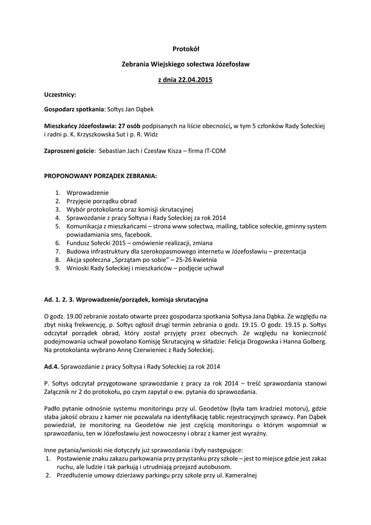 Protokół Zebrania Wiejskiego sołectwa Józefosław z dnia 22.04.2015