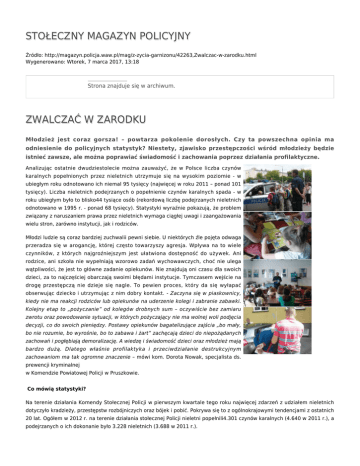 STOŁECZNY MAGAZYN POLICYJNY Źródło: http://magazyn.policja.waw.pl/mag/z-zycia-garnizonu/42263,Zwalczac-w-zarodku.html Wygenerowano: Wtorek, 7 marca 2017, 13:18 Strona znajduje się w archiwum. ZWALCZAĆ W ZARODKU Młodzież jest coraz gorsza! – powtarza pokolenie dorosłych. Czy ta powszechna opinia ma odniesienie do policyjnych statystyk? Niestety, zjawisko przestępczości wśród młodzieży będzie istnieć zawsze, ale można poprawiać świadomość i zachowania poprzez działania profilaktyczne. Analizując ostatnie dwudziestolecie można zauważyć, że w Polsce liczba czynów karalnych popełnionych przez nieletnich utrzymuje się na wysokim poziomie - w ubiegłym roku odnotowano ich niemal 95 tysięcy (najwięcej w roku 2011 – ponad 101 tysięcy). Liczba nieletnich podejrzanych o popełnienie czynów karalnych spada - w roku ubiegłym było to blisko44 tysiące osób (rekordową liczbę podejrzanych nieletnich odnotowano w 1995 r. - ponad 68 tysięcy). Statystyki wyraźnie pokazują, że problem związany z naruszaniem prawa przez nieletnich wymaga ciągłej uwagi i zaangażowania wielu stron, zarówno instytucji, jak i rodziców. Młodzi ludzie są coraz bardziej zuchwalii pewni siebie. U niektórych źle pojęta odwaga przeradza się w arogancję, której często towarzyszy agresja. Wpływa na to wiele czynników, z których najgroźniejszym jest ułatwiona dostępność do używek. Ani rodzice, ani szkoła nie wypełniają wzorowo zadań wychowawczych, choć nie ulega wątpliwości, że jest to główne zadanie opiekunów. Nie znajdują oni czasu dla swoich dzieci, za to najczęściej obarczają swoimi błędami instytucje. Tymczasem wejście na drogę przestępczą nie dzieje się nagle. To pewien proces, który da się wyłapać obserwując dziecko i utrzymując z nim dobry kontakt. - Zaczyna się w piaskownicy, kiedy nie ma reakcji rodziców lub opiekunów na uderzenie kolegi i zabranie zabawki. Kolejny etap to „pożyczanie” od kolegów drobnych sum – oczywiście bez zamiaru zwrotu oraz powodowanie sytuacji, w których pożyczający nie ma wolnej woli podjęcia decyzji, co do swoich pieniędzy. Postawy opiekunów bagatelizujące zajścia „bo mały, bo nie rozumie, bo wyrośnie, bo to zabawa i żart” zachęcają dzieci do niepożądanych zachowań i pogłębiają demoralizację. A wiedzę i świadomość dzieci oraz młodzież mają bardzo dużą. Dlatego właśnie profilaktyka i przeciwdziałanie destrukcyjnym zachowaniom ma tak ogromne znaczenie – mówi kom. Dorota Nowak, specjalista ds. prewencji kryminalnej w Komendzie Powiatowej Policji w Pruszkowie. Co mówią statystyki? Na terenie działania Komendy Stołecznej Policji w pierwszym kwartale tego roku najwięcej zdarzeń z udziałem nieletnich dotyczyło kradzieży, przestępstw rozbójniczych oraz bójek i pobić. Pokrywa się to z ogólnokrajowymi tendencjami z ostatnich 20 lat. Ogółem w 2012 r. na terenie działania stołecznej Policji nieletni popełnili4.301 czynów karalnych (4.640 w 2011 r.), a podejrzanych o ich dokonanie było 3.228 nieletnich (3.688 w 2011 r.). CZYNY ZABRONIONE NIELETNICH - KOMENDA STOŁECZNA POLICJI I kwartał I kwartał 2013 2012 Kradzież 169 210 Przestępstwa 115 124 rozbójnicze Udział w bójce lub 70 73 pobiciu Uszkodzenie rzeczy 69 72 Kradzież z włamaniem 56 62 Uszczerbek 46 50 Na podstawie analizy danych statystycznych można zauważyć również, że na terenie podległym Komendzie Stołecznej Policji na wysokim poziomie utrzymuje się przestępczość narkotykowa wśród nieletnich. W pierwszym kwartale tego roku stwierdzono 316 takich czynów karalnych, natomiast w analogicznym okresie roku ubiegłego - 314 czynów.- Używanie narkotyków przez młodych ludzi niesie ze sobą wielkie szkody dla ich organizmu - zarówno w sferze fizycznej, jak i psychicznej, dlatego też kwestia przeciwdziałania temu zjawisku jest jednym z priorytetów Wydziału Prewencji KSP, który przygotował projektw ramach programów UE pod nazwą: „Współpraca policji i organizacji pozarządowych jako warunek sukcesu zapobiegania narkomanii 2014-2015”. Projekt ten w szczególności ma objąć swoim zakresem młodzież gimnazjalną – mówi mł. insp. Piotr Idzikowski, Naczelnik Wydziału Prewencji Komendy Stołecznej Policji. Jakie podejmuje się działania? Policyjne programy prewencyjne to przedsięwzięcia długofalowe, obejmujące swoim zasięgiem teren całego garnizonu stołecznego. Wdrażane programy spowodowały nawiązanie przez jednostki Policji współpracy z szeregiem pozapolicyjnych instytucji, organizacji i innych podmiotów, dla których podniesienie bezpieczeństwa i minimalizacja przestępczości są celami priorytetowymi. W oparciu o analizy dotychczasowych efektów policyjnej działalności w ramach prewencji kryminalnej oraz analizy społecznych potrzeb i oczekiwań opracowano, a także wdrożono programy prewencyjne, nad których przebiegiem czuwa Wydział Prewencji KSP: ● REAGUJ. POWIADOM. NIE TOLERUJ - program realizowany na terenie podległym Komendzie Stołecznej Policji od 2005 roku, wpisany w rządowy program ograniczania przestępczości i aspołecznych zachowań „Razem Bezpieczniej”. ● STOP PRZEMOCY W SZKOŁACH - w celu przeciwdziałania przejawom przemocy i innym niebezpiecznym zachowaniom na terenie szkół, w roku 2007 w Wydziale Prewencji KSP uruchomiono specjalne numery telefonów 022 603-68-48, 022 603-67-95, 022 603-76-09 oraz jako nową formę komunikacji społeczeństwa z Policją serwis internetowy „Gadu-Gadu” nr 100997, służące przede wszystkim odbieraniu wiadomości o niepokojących zjawiskach mających miejsce na terenie szkół. ● KIBIC - program profilaktyczno-edukacyjny adresowany do uczniów szkół gimnazjalnych, realizowany od 2008 roku. Program dotyczy realizacji zagadnień z zakresu propagowania właściwego zachowania się młodych osób podczas imprez sportowych, jak również odpowiednich form postępowania w