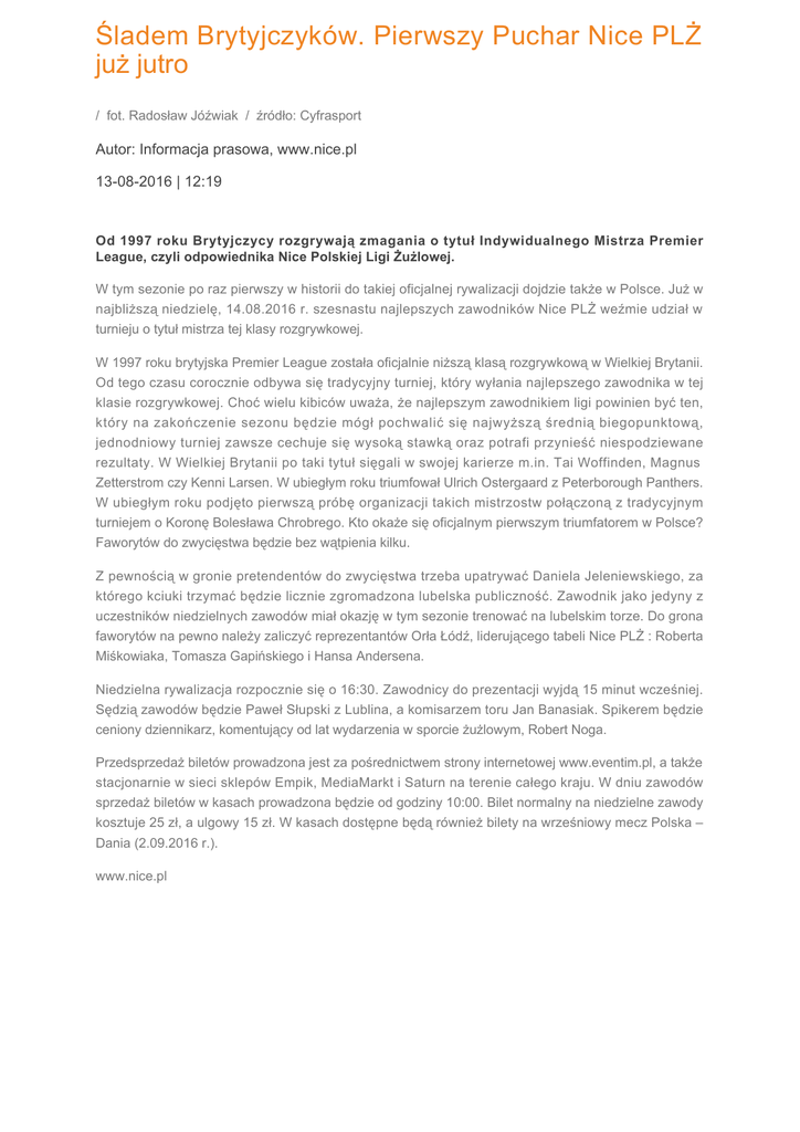 Śladem Brytyjczyków. Pierwszy Puchar Nice PLŻ już jutro / fot. Radosław Jóźwiak / źródło: Cyfrasport Autor: Informacja prasowa, www.nice.pl 13-08-2016 | 12:19 Od 1997 roku Brytyjczycy rozgrywają zmagania o tytuł Indywidualnego Mistrza Premier League, czyli odpowiednika Nice Polskiej Ligi Żużlowej. W tym sezonie po raz pierwszy w historii do takiej oficjalnej rywalizacji dojdzie także w Polsce. Już w najbliższą niedzielę, 14.08.2016 r. szesnastu najlepszych zawodników Nice PLŻ weźmie udział w turnieju o tytuł mistrza tej klasy rozgrywkowej. W 1997 roku brytyjska Premier League została oficjalnie niższą klasą rozgrywkową w Wielkiej Brytanii. Od tego czasu corocznie odbywa się tradycyjny turniej, który wyłania najlepszego zawodnika w tej klasie rozgrywkowej. Choć wielu kibiców uważa, że najlepszym zawodnikiem ligi powinien być ten, który na zakończenie sezonu będzie mógł pochwalić się najwyższą średnią biegopunktową, jednodniowy turniej zawsze cechuje się wysoką stawką oraz potrafi przynieść niespodziewane rezultaty. W Wielkiej Brytanii po taki tytuł sięgali w swojej karierze m.in. Tai Woffinden, Magnus Zetterstrom czy Kenni Larsen. W ubiegłym roku triumfował Ulrich Ostergaard z Peterborough Panthers. W ubiegłym roku podjęto pierwszą próbę organizacji takich mistrzostw połączoną z tradycyjnym turniejem o Koronę Bolesława Chrobrego. Kto okaże się oficjalnym pierwszym triumfatorem w Polsce? Faworytów do zwycięstwa będzie bez wątpienia kilku. Z pewnością w gronie pretendentów do zwycięstwa trzeba upatrywać Daniela Jeleniewskiego, za którego kciuki trzymać będzie licznie zgromadzona lubelska publiczność. Zawodnik jako jedyny z uczestników niedzielnych zawodów miał okazję w tym sezonie trenować na lubelskim torze. Do grona faworytów na pewno należy zaliczyć reprezentantów Orła Łódź, liderującego tabeli Nice PLŻ : Roberta Miśkowiaka, Tomasza Gapińskiego i Hansa Andersena. Niedzielna rywalizacja rozpocznie się o 16:30. Zawodnicy do prezentacji wyjdą 15 minut wcześniej. Sędzią zawodów będzie Paweł Słupski z Lublina, a komisarzem toru Jan Banasiak. Spikerem będzie ceniony dziennikarz, komentujący od lat wydarzenia w sporcie żużlowym, Robert Noga. Przedsprzedaż biletów prowadzona jest za pośrednictwem strony internetowej www.eventim.pl, a także stacjonarnie w sieci sklepów Empik, MediaMarkt i Saturn na terenie całego kraju. W dniu zawodów sprzedaż biletów w kasach prowadzona będzie od godziny 10:00. Bilet normalny na niedzielne zawody kosztuje 25 zł, a ulgowy 15 zł. W kasach dostępne będą również bilety na wrześniowy mecz Polska – Dania (2.09.2016 r.). www.nice.pl