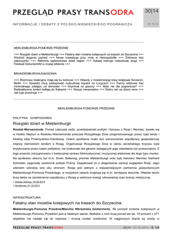 PRZEGLĄD PRASY TRANSODRA INFORMACJE I DEBAT Y Z POLSKO-NIEMIECKIEGO POGRANICZA 30|14 07.10.14 MEKLEMBURGIA-POMORZE PRZEDNIE +++ Rosyjski dzień w Meklemburgii +++ Fatalny stan mostów kolejowych na trasach do Szczecina +++ Wschód dogania zachód +++ Nowe inwestycje przy molo w Heringsdorfie +++ Żołnierze bez odpoczynku +++ Reforma sądownictwa dzieli region +++ Azbest hamuje rozbudowę drogi +++ Festiwal DokumentArt w nowej odsłonie +++ BRANDENBURGIA/SAKSONIA +++ Rozmowy koalicyjne mają się ku końcowi +++ Kłopoty z modernizacją trasy kolejowej SzczecinBerlin +++ Szwedzi chcą zastopować rozbudowę kopalni na Łużycach +++ Farmy wiatrowe bez minimalnego odstępu od domostw +++ Kryminał na granicy +++ Myto nie dla pogranicza? +++ Radioaktywne śmieci trafiają do Saksonii +++ Wysyp mecenasów +++ Dobry rok na zbiory wina +++ Jak żyje prowincja +++ MEKLEMBURGIA-POMORZE PRZEDNIE POLITYKA GOSPODARKA Rosyjski dzień w Meklemburgii Rostok-Warnemünde. Ponad czterysta osób, przedstawicieli polityki i biznesu z Rosji i Niemiec, bawiło się w Hotelu Neptun w Rostoku-Warnemünde podczas Rosyjskiego Dnia zorganizowanego przez rząd landu i lokalną Izbę Przemysłowo-Handlową. Celem spotkania miało być wzmocnienie współpracy gospodarczej między niemieckim landem a Rosją. Organizacja Rosyjskiego Dnia w cieniu ukraińskiego kryzysu była krytykowana przez część polityków, nie brakowało też głosów żadających jego odwołania lub przesunięcia. Z tego powodu zrezygnowano z tradycyjnej oprawy foklorystycznej i muzycznej właściwej dla tego typu imprez. Na spotkaniu obecny był m.in. Erwin Sellering, premier Meklemburgii oraz były kanclerz Niemiec Gerhard Schröder, zagorzały zwolennik polityki Putina. Zaapelował on o złagodzenie sankcji względem Rosji. Jego zdaniem szkodzą one obu stronom. Rosja jest jednym z najważniejszych partnerów gospodarczych Meklemburgii-Pomorza Przedniego, w rosyjskich rękach znajdują się m.in. tamtejsze stocznie. Władze landu liczą także na zacieśnienie współpracy z Rosją w sektorze energii odnawialnej oraz branży medycznej. » Ostsee Zeitung, 30.09.2014 » Nordkurier, 01.10.2014 INFRASTRUKTURA Fatalny stan mostów kolejowych na trasach do Szczecina Meklemburgia-Pomorze Przednie/Marchia Wkrzańska (Uckermark). 56 procent mostów kolejowych w Meklemburgii-Pomorzu Przednim jest w fatalnym stanie. Niektóre z nich liczą ponad sto lat. 15 procent z 271 objektów nie nadaje się do naprawy i muszą zostać rozebrane. W najgorszym stanie są mosty w PRZ EGL ĄD PRAS Y T RANS ODRA 30|14 · 07.10.2014 · S. 1/8 PRZEGLĄD PRASY TRANSODRA INFORMACJE I DEBAT Y Z POLSKO-NIEMIECKIEGO POGRANICZA 30|14 07.10.14 Stavenhagen, Altentreptow oraz na trasie kolejowej Szczecin-Pasewalk, które w najbliższych latach mają zostać zburzone i zastąpione przez nowe obiekty. Niewiele lepiej jest w sąsiedniej Brandenburgii, gdzie do pilnego remontu nadaje się jedna trzecia mostów, w tym także mosty między Angermünde a Szczecinem. Kolej zapewnia, że obiekty są bezpieczne, ale pasażerowie muszą liczyć się z redukcją prędkości pociągów na poszczególnych trasach. » Nordkurier, 03.10.2014 SPOŁECZEŃSTWO Wschód dogania zachód Meklemburgia/Brandenburgia/Saksonia. 25 lat po upadku Muru Berlińskiego Niemcy ze wschodnich landów są coraz bardziej zadowoleni z poziomu życia – tak wynika z badania przeprowadzonego przez Instytut Allensbach na zlecenie czternastu wschodnioniemieckich gazet. 3 października Niemcy obchodzili Dzień Niemieckiej Jedności. Poziom satysfakcji mieszkańców wschodu jeszcze nigdy w historii nie był tak wysoki. Na skali od 0 do 10 przypisali oni zadowoleniu z życia wartość „siódemki“. Obywatele z zachodu Niemiec określili zaś swój poziom zadowolenia na 7,3. Landy byłej NRD powoli doganiają zachód kraju także pod względem gospodarczym. Pracownicy wschodu wciąż są jednak gorzej wynagradzani, ich pensja stanowi średnio 83 procent sumy, którą zarabiają ich koledzy po fachu z zachodu. Na niższym poziomie jest jednak produktywność wschodnich pracowników. » Ostsee Zeitung, 02.10.2014 » Ostsee Zeitung, 02.10.2014 TURYSTYKA Nowe inwestycje przy molo w Heringsdorfie Heringsdorf. W lutym przyszłego roku rozpoczną się prace budowlane w rejonie mola w Heringsdorfie na wyspie Uznam. Za 6,5 mln euro powstaną tu dwa luksusowe apartamentowce oraz sklepy. Wejście do nich znajdować się będzie tuż przy wejściu na molo. „Pierwsze apartamenty mają być gotowe do zamieszkania już w końcu 2015 roku“ – informuje Friedrich Münzel, prezes i udziałowiec spółki zarządzającej molem. „Są też już pierwsi chętni na powierzchnie sklepowe. » Fot. Molo w Heringsdorfie na wyspie Uznam. Autor: Niteshift. Źródło: Wikimedia Commons. Licencja: CC-BY-SA-3.0 » Ostsee Zeitung, 30.09.2014 PRZ EGL ĄD PRAS Y T RANS ODRA 30|14 · 07.10.2014 · S. 2/8 PRZEGLĄD PRASY TRANSODRA 30|14 07.10.14 INFORMACJE I DEBAT Y Z POLSKO-NIEMIECKIEGO POGRANICZA WOJSKO Żołnierze bez odpoczynku Sanitz. Co czwarty żołnierz Bundeswehry uczestniczący w misji „Patriot“ na turecko-syryjskiej granicy wysyłany jest na misję częściej niż przewidują to przepisy. Zgodnie z nimi, przed kolejnymi wyjazdami zagranicznymi, żołnierzom przysługuje co najmniej 20 miesięcy przerwy. Większość niemieckiego kontynentu, mającego chronić ludność Turcji przed rakietami z Syrii, stanowią żołnierze z MeklemburgiiPomorza Przedniego, głównie specjaliści sił powietrznych z Sanitz (Powiat Rostocki) oraz Bad Sülze (powiat Pomorze Przednie-Rugia). By zmniejszyć objawy stresu bojowego, żołnierzom proponowane są seminaria relaksacyjne oraz grupy wsparcia. » Ostsee Zeitung, 01.10.2014 SPOŁECZEŃSTWO Reforma sądownictwa dzieli region Anklam. Przeciwnikom reformy sądownictwa w Meklemburgii-Pomorzu Przednim udało się zdobyć wymagane 120 tysięcy podpisów pod wnioskiem o przeprowadzenie referendum za odst