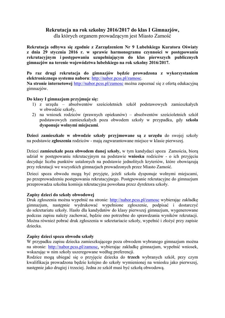 Rekrutacja na rok szkolny 2016/2017 do klas I Gimnazjów, dla