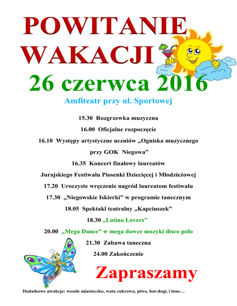 POWITANIE WAKACJI 26 czerwca 2016 Amfiteatr przy ul. Sportowej 15.30 Rozgrzewka muzyczna 16.00 Oficjalne rozpoczęcie 16.10 Występy artystyczne uczniów „Ogniska muzycznego przy GOK Niegowa” 16.35 Koncert finałowy laureatów Jurajskiego Festiwalu Piosenki Dziecięcej i Młodzieżowej 17.20 Uroczyste wręczenie nagród laureatom festiwalu 17.30 „Niegowskie Iskierki” w programie tanecznym 18.05 Spektakl teatralny „Kapciuszek” 18.30 „Latino Lovers” 20.00 „Mega Dance” w mega dawce muzyki disco polo 21.30 Zabawa taneczna 24.00 Zakończenie Zapraszamy Dodatkowe atrakcje: wesołe miasteczko, wata cukrowa, piwo, hot-dogi, i inne…