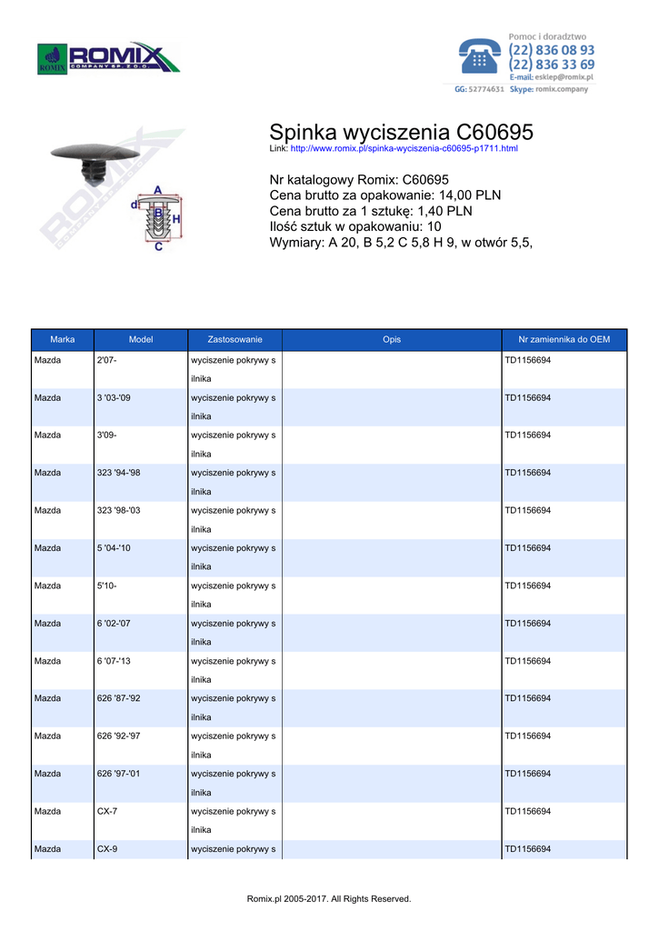 Spinka wyciszenia C60695 Link: http://www.romix.pl/spinka-wyciszenia-c60695-p1711.html Nr katalogowy Romix: C60695 Cena brutto za opakowanie: 14,00 PLN Cena brutto za 1 sztukę: 1,40 PLN Ilość sztuk w opakowaniu: 10 Wymiary: A 20, B 5,2 C 5,8 H 9, w otwór 5,5, Marka Mazda Model 2'07- Zastosowanie Opis wyciszenie pokrywy s Nr zamiennika do OEM TD1156694 ilnika Mazda 3 '03-'09 wyciszenie pokrywy s TD1156694 ilnika Mazda 3'09- wyciszenie pokrywy s TD1156694 ilnika Mazda 323 '94-'98 wyciszenie pokrywy s TD1156694 ilnika Mazda 323 '98-'03 wyciszenie pokrywy s TD1156694 ilnika Mazda 5 '04-'10 wyciszenie pokrywy s TD1156694 ilnika Mazda 5'10- wyciszenie pokrywy s TD1156694 ilnika Mazda 6 '02-'07 wyciszenie pokrywy s TD1156694 ilnika Mazda 6 '07-'13 wyciszenie pokrywy s TD1156694 ilnika Mazda 626 '87-'92 wyciszenie pokrywy s TD1156694 ilnika Mazda 626 '92-'97 wyciszenie pokrywy s TD1156694 ilnika Mazda 626 '97-'01 wyciszenie pokrywy s TD1156694 ilnika Mazda CX-7 wyciszenie pokrywy s TD1156694 ilnika Mazda CX-9 wyciszenie pokrywy s Romix.pl 2005-2017. All Rights Reserved. TD1156694 ilnika Mazda Xedos-6 wyciszenie pokrywy s TD1156694 ilnika Mazda Xedos-9 wyciszenie pokrywy s ilnika Romix.pl 2005-2017. All Rights Reserved. TD1156694