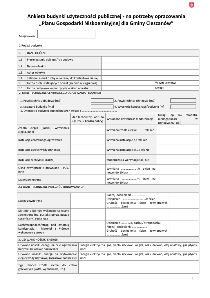 Ankieta budynki użyteczności publicznej - na potrzeby opracowania „Planu Gospodarki Niskoemisyjnej dla Gminy Cieszanów” Miejscowość 1.Rodzaj budynku 1. DANE OGÓLNE 1.1 Przeznaczenie obiektu /rok budowy 1.2 Nazwa obiektu 1.3 Adres obiektu 1.4 Telefon i e-mail osoby wskazanej do kontaktowania się 1.5 Liczba osób użytkujących obiekt (średnio w ciągu dnia) W tym uczniów: Uwagi: 1.6 Liczba budynków wchodzących w skład obiektu 2. DANE TECHNICZNE CENTRALNEGO OGRZEWANIA I BUDYNKU 1. Powierzchnia zabudowy [m2] 2. Powierzchnia użytkowa [m2] 3. Kubatura budynku [m3] 4. Wysokość kondygnacji/budynku [m] 5. Orientacja budynku względem stron świata : ………………………………………… Uwagi (np. rok Stan techniczny - od 1 do Wykonane dotychczas modernizacje niedogodności 5 (1-zły, 5-bardzo dobry) użytkowaniu, itp.) Źródło ciepła ciepła, inne) (kocioł, wymiennik Wymiana źródła ciepła: remontu, w tak, nie Instalacja centralnego ogrzewania Wymiana instalacji c.o.: tak, nie Instalacja ciepłej wody użytkowej Wymiana instalacji c.w.u.: tak,nie Instalacja wentylacji /rodzaj Modernizacja wentylacji: tak, nie Okna zewnętrzne : drewniane , PCV, inne Wymiana …………………..% okien na nowe (do 10 lat) Drzwi zewnętrzne Wymiana …...…………...% drzwi na nowe (do 10 lat) 2.1 DANE TECHNICZNE PRZEGRÓD BUDOWLANYCH Rodzaj docieplenia ………………… Ocieplenie ………………............% ścian Grubość docieplenia ścian zewnętrznych …………………[cm] Ściany zewnętrzne Materiał z którego wykonane są ściany zewnętrzne (np. pustak siporex, pustak ceramiczny, cegła itp.) Ocieplenie ………....% dachu / stropodachu Rodzaj docieplenia ………………… Grubość docieplenia ścian zewnętrznych …………………[cm] Dach/stropodach/strop nad ostatnią kondygnacją. Materiał z którego wykonane są stropy 3. UŻYWANE NOŚNIKI ENERGII Używane nośniki energii na cele ogrzewania Energia elektryczna, gaz, ciepło sieciowe, węgiel, koks, drewno, olej opałowy, gaz płynny, budynku (właściwe podkreślić) inne: Używane nośniki energii na wytworzenie Energia elektryczna, gaz, ciepło sieciowe, węgiel, koks, drewno, olej opałowy, gaz płynny, ciepłej wody użytkowej (właściwe podkreślić) inne: Typ, model źródła ciepła do grzewczych (kotła, wymiennika, itp.) celów 1 Moc zainstalowana źródeł ciepła, kW (szukać na tabliczce kotła, w dokumentacji) Zaobserwowane problemy podczas użytkowania obiektu (niedogrzane/przegrzane pomieszczenia, niedostateczna wentylacja pomieszczeń): 4. Roczne zużycia i koszty nośników energii energia elektryczna rok gaz ziemny zużycie [kWh/rok] koszt faktur [zł/rok] wg rok zużycie [m3/rok] grupa taryfowa np. C11 (szukać na fakturach lub w umowie) grupa taryfowa np.. W3.1 (szukać na fakturach lub w umowie) 2012 2012 2013 2013 drewno i odpady drzewne ciepło sieciowe rok zużycie [t/rok], [m3/rok] koszt faktur [zł/rok] wg rok 2008 – rok bazowy 2008 – rok bazowy 2012 2012 2013 2013 węgiel olej opałowy rok zużycie [t/rok] koszt faktur [zł/rok] wg rok 2008 – rok bazowy 2008 – rok bazowy 2012 2012 2013 2013 inne, jakie ……………………………………………. rok zużycie […..…./rok] koszt wg faktur [zł/rok] zużycie [GJ/rok] koszt wg faktur [zł/rok] zużycie [l/rok], [m3/rok] koszt wg faktur [zł/rok] zużycie [………../rok] koszt wg faktur [zł/rok] inne, jakie ……………………………………………. koszt faktur [zł/rok] wg rok 2008 – rok bazowy 2008 – rok bazowy 2012 2012 2013 2013 5. URZĄDZENIA WYKORZYSTUJĄCE ENERGIĘ ODNAWIALNĄ Czy w obiekcie występują urządzenia wykorzystujące energię odnawialną? Np. Kotły na biomasę moc zainstalowana. Kolektory słoneczne (łączna powierzchni, liczba, rodzaj); pompy ciepła (rodzaj, moc cieplna), inne jakie, moc zainstalowana. W razie pytań lub wątpliwości prosimy o kontakt z Wykonawcą –Bio-San Adam Czekański tel. 509 793 106 Ankiety można wypełniać w wersji papierowej – wypełnione ankiety należy składać w terminie do 31 października 2014 roku w Punkcie podawczym Urzędu Gminy w Cieszanowie. Ankiety w wersji elektronicznej należy wysyłać na e-mail: [email protected] w terminie do 31 października 2014 roku. 2