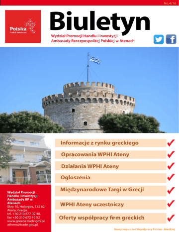 Biuletyn No.4/16 Wydział Promocji Handlu i Inwestycji Ambasady Rzeczpospolitej Polskiej w Atenach Informacje z rynku greckiego erownik WPHI Ateny Opracowania WPHI Ateny Działania WPHI Ateny Ogłoszenia Wydział Promocji Handlu i Inwestycji Ambasady RP w Atenach Skra 10, Holargos, 155 62 Ateny, Grecja, tel. +30 210 677 02 48, fax +30 210 672 19 52 www.greece.trade.gov.pl [email protected] Międzynarodowe Targi w Grecji WPHI Ateny uczestniczy Oferty współpracy firm greckich 1 Nowy Impuls we Współpracy Polsko - Greckiej Informacje z rynku greckiego Opracowania WPHI Ateny Wzrost w przyjazdach Grecja turystycznych do Grecji zabiega o polskich turystów Grecka Narodowa Organizacja Turystyczna postanowiła wdrożyć pięć programów promujących kraj, jako miejsce wypoczynku poprzez Google, Facebook, TripAdvisor oraz Expedia, przeznaczając do ponad 2 milionów euro. Sekretarz Generalny GNOT Dimitris Tryfonopoulos w dniu 27.04. podpisał decyzje dla reklamy na kampanie online, z których dwa dotyczą Google: Pierwszy, w budżecie na 215 tys. euro, ma dotyczyć użytkowników z USA i Kanady, podczas gdy drugi, o wartości 505 tys. euro, będzie skierowany na rynki Wielkiej Brytanii, Niemiec, Francji, Włoch, Holandii, Polski, Szwajcarii i Serbii. Źródło: Kathimerini 27.04.2016 2 Nowy Impuls we Współpracy Polsko - Greckiej Liczba przyjazdów turystycznych do Grecji w okresie styczeń – grudzień 2015 roku wzrosła o 7,1%. Grecję odwiedziło 754 tys. Polaków. Grecki Urząd Statystyczny poinformował (08.04.2016) że, liczba przyjazdów turystycznych do Grecji w okresie styczeń – grudzień 2015 roku wzrosła o 7,1 proc, w porównaniu z tym samym okresem ubiegłego roku. W 2015 roku, pomimo głębokiego kryzysu polityczno - ekonomicznego Grecję odwiedziło ponad 23 mln turystów (23 599 455). Raport podaje, że przybysze z Europy stanowili 87,8 proc turystów. Liczba przyjazdów z Europy wzrosła o 6,4 proc, natomiast przyjazdy z państw członkowskich Unii Europejskiej wzrosły o 13,0 proc. Przyjazdy turystów w zestawieniu z krajem pochodzenia wzrosły; Republika Macedonii FYROM 28,8 proc., Bułgaria 23,9 proc, Niemcy 14,3 proc., Wielka Brytania 14,7 proc., Włochy 21,3 proc., W 2015 roku przyjazdy turystów z Polski wzrosły o 28,1 proc. Grecję odwiedziło 754 402 Polaków. Przyjazdy turystów spadły: Rosja -59,0 proc., i Serbia -26,2 proc. Republika Macedonii FYROM ma największy udział w przyjazdach turystycznych do Grecji wynoszący 12,8 proc, następnie Niemcy 11,9 proc., Wielka Brytania 10,2 proc., Bułgaria 8,1 proc., Francja 6,4 proc., Włochy 5,7 proc, Turcja 4,9 proc., Polska 3,2 proc. Nowy Impuls we Współpracy Polsko - Greckiej 3 Opracowania WPHI Ateny Opracowania WPHI Ateny Tabela 1. Przyjazdy nierezydentów z zagranicy według zamieszkania: styczeń-grudzień 2015 4 Przyjazdy według zamieszkania Rok Rok 2014 2015 Ι. EUROPA W tym: % zmiana 6.4 13.0 % udział Łotwa 31,085 33,709 8.4 0.1 0.1 15. Litwa 57,890 60,143 3.9 0.3 0.3 2014 2015 16. Luxemburg 18,449 22,037 19.4 0.1 0.1 88.4 87.8 17. Malta 3,701 9,867 166.6 0.0 0.0 18. Niderlandy 657,339 639,108 -2.8 3.0 2.7 19. Węgry 89,064 146,380 64.4 0.4 0.6 20. Polska 588,712 754,402 28.1 2.7 3.2 21. Portugalia 14,206 17,821 25.4 0.1 0.1 22. Rumunia 543,360 540,289 -0.6 2.5 2.3 23. Słowacja 61,826 75,187 21.6 0.3 0.3 24. Słowenia 26,698 24,377 -8.7 0.1 0.1 25. Szwecja 337,771 351,573 4.1 1.5 1.5 26. Czechy 347,624 436,703 25.6 1.6 1.9 27. Finlandia 166,251 149,894 -9.8 0.8 0.6 28. Albania 488,099 491,381 0.7 2.2 2.1 29. Szwajcaria 377,077 391,249 3.8 1.7 1.7 30. Norwegia 246,136 244,859 -0.5 1.1 1.0 31. Islandia 3,528 1,705 -51.7 0.0 0.0 32. FYROM 2,346,580 3,023,059 28.8 10.7 12.8 60.1 63.5 - Ι. UNIA EUROPEJSKA 1. Austria 285,132 327,123 14.7 1.3 1.4 2. Belgia 409,198 482,524 17.9 1.9 2.0 3. Bułgaria 1,534,565 1,900,642 23.9 7.0 8.1 4. Francja 1,463,157 1,522,100 4.0 6.6 6.4 5. Niemcy 2,459,228 2,810,350 14.3 11.2 11.9 6. Dania 240,419 237,655 -1.1 1.1 1.0 7. Estonia 30,551 23,323 -23.7 0.1 0.1 8. W. Brytania 2,089,529 2,397,169 14.7 9.5 10.2 9. Irlandia 69,532 72,654 4.5 0.3 0.3 10. Hiszpania 136,232 93,624 -31.3 0.6 0.4 11. Włochy 1,117,712 1,355,327 21.3 5.1 5.7 12. Chorwacja 21,889 20,136 -8.0 0.1 0.1 13. Cypr 448,342 470,091 4.9 2.0 2.0 Nowy Impuls we Współpracy Polsko - Greckiej 14. Nowy Impuls we Współpracy Polsko - Greckiej 5 Opracowania WPHI Ateny Opracowania WPHI Ateny 33. Rosia 1,250,174 512,789 -59.0 5.7 2.2 34. Serbia 985,661 727,831 -26.2 4.5 3.1 35. Inne europejskie kraje 530,336 ΙΙ. AZIA 1,411,665 1,515,386 7.3 6.4 6.4 36. Japonia 18,698 9,983 -46.6 0.1 0.0 37. Iran 752 10,598 1308.9 0.0 0.0 38. Izrael 197,009 115,868 -41.2 0.9 0.5 39. Chiny 47,482 55,097 16.0 0.2 0.2 348,585 -34.3 2.4 1.5 40. Liban-Syria 31,794 30,258 -4.8 0.1 0.1 41. Korea Poł. 13,388 20,080 50.0 0.1 0.1 42. Turcja 976,758 1,153,046 18.0 4.4 4.9 43. Inne środk o w o wschodnie kraje 44. ΙΙΙ. AFRYKA 45. 46. 45,156 80,628 49,043 Afryka Południowa 22.5 0.2 Inne afrykańskie kraje 15,300 9,553 -37.6 0.1 0.0 Ι V . AMERYKA 890,318 1,094,750 23.0 4.0 4.6 48. Argentyna 32,606 34,662 6.3 0.1 0.1 49. Brazylia 52,217 65,588 25.6 0.2 0.3 50. Meksyk 20,479 15,900 -22.4 0.1 0.1 51. USA 591,853 750,250 26.8 2.7 3.2 52. Kanada 145,720 182,299 25.1 0.7 0.8 53. Inne kraje Ameryki 47,443 46,050 -2.9 0.2 0.2 V. OCEANIA 205,387 211,970 3.2 0.9 0.9 54. Australia 183,080 183,165 0.0 0.8 0.8 55. Inne kraje Oceanii 22,307 28,806 29.1 0.1 0.1 VI. RAZEM 0.2 9,063 24,680 65,136 61,685 26,076 26,055 -19.2 25.8 187.7 5.6 0.4 0.2 0.0 0.1 0.3 0.3 0.1 Tabela 2. Przyjazdy nierezydentów z zagranicy według środków transportu i stacji wjazdowej: styczeń-grudzień 2015 Nowy Impuls we Współpracy Polsko - Greckiej ROK ROK % zmiany % udział 2015 2015/ 2014 2014 2015 6.6 63.8 63.5 STACJA WJAZDOWA 2014 0.1 Ι. Transport powietrzny 6 7.1 Źródło: Frontier Survey of the Bank of Greece. Inne azjatyckie kraje Egipt-Sudan 55,319 47. Nowy Impuls we W