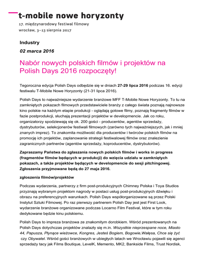 Industry 02 marca 2016 Nabór nowych polskich filmów i projektów na Polish Days 2016 rozpoczęty! Tegoroczna edycja Polish Days odbędzie się w dniach 27-29 lipca 2016 podczas 16. edycji festiwalu T-Mobile Nowe Horyzonty (21-31 lipca 2016). Polish Days to najważniejsze wydarzenie branżowe MFF T-Mobile Nowe Horyzonty. To tu na zamkniętych pokazach filmowych przedstawiciele branży z całego świata poznają najnowsze kino polskie na każdym etapie produkcji - oglądają gotowe filmy, poznają fragmenty filmów w fazie postprodukcji, słuchają prezentacji projektów w developmencie. Jak co roku, organizatorzy spodziewają się ok. 200 gości - producentów, agentów sprzedaży, dystrybutorów, selekcjonerów festiwali filmowych (zarówno tych najważniejszych, jak i mniej znanych imprez). To znakomita możliwość dla producentów i twórców polskich filmów na promocję ich projektów, zaplanowanie strategii festiwalowej filmów oraz znalezienie zagranicznych partnerów (agentów sprzedaży, koproducentów, dystrybutorów). Zapraszamy Państwa do zgłaszania nowych polskich filmów i works in progress (fragmentów filmów będących w produkcji) do wzięcia udziału w zamkniętych pokazach, a także projektów będących w developmencie do sesji pitchingowej. Zgłoszenia przyjmowane będą do 27 maja 2016. zgłoszenia filmów/projektów Podczas wydarzenia, partnerzy z firm post-produkcyjnych Chimney Polska i Toya Studios przyznają wybranym projektom nagrody w postaci usług post-produkcyjnych dźwięku i obrazu na preferencyjnych warunkach. Polish Days współorganizowane są przez Polski Instytut Sztuki Filmowej. Po raz pierwszy partnerem Polish Day jest jest First Look, wydarzenie branżowe organizowane podczas Locarno Film Festival, które w tym roku dedykowane będzie kinu polskiemu. Polish Days to impreza branżowa ze znakomitym dorobkiem. Wśród prezentowanych na Polish Days dotychczas projektów znalazły się m.in. Wszystkie nieprzespane noce, Miasto 44, Papusza, Płynące wieżowce, Kongres, Jesteś Bogiem, Bogowie,Wałęsa, Chce się żyć czy Obywatel. Wśród gości branżowych w ubiegłych latach we Wrocławiu pojawili się agenci sprzedaży tacy jak Films Boutique, LevelK, Memento, MK2, Bankside Films, Trust Nordisk, Intramovies, Urban Distribution, Wide, Sixpack i New Europe Film Sales, dystrybutorzy: Wild Bunch, Aero Films, EYE Film Institute Netherlands, Imagine, Just, Kino Świat, Soda Pictures i Metrodome, a także telewizje HBO, Canal+, Ale Kino, Polsat i TVP. We Wrocławiu obecni byli także selekcjonerzy festiwali filmowych m.in. z Cannes, Berlina, Wenecji, Rotterdamu, Busan, Karlowych Warów, Tribeci, SXSW, Salonik, Hamburga, Gothenburga, Hong Kongu, Cottbus, Go East Wiesbaden, Stambułu, Monachium, Seattle, Sztokholmu i Transylwanii. Więcej informacji: [email protected]