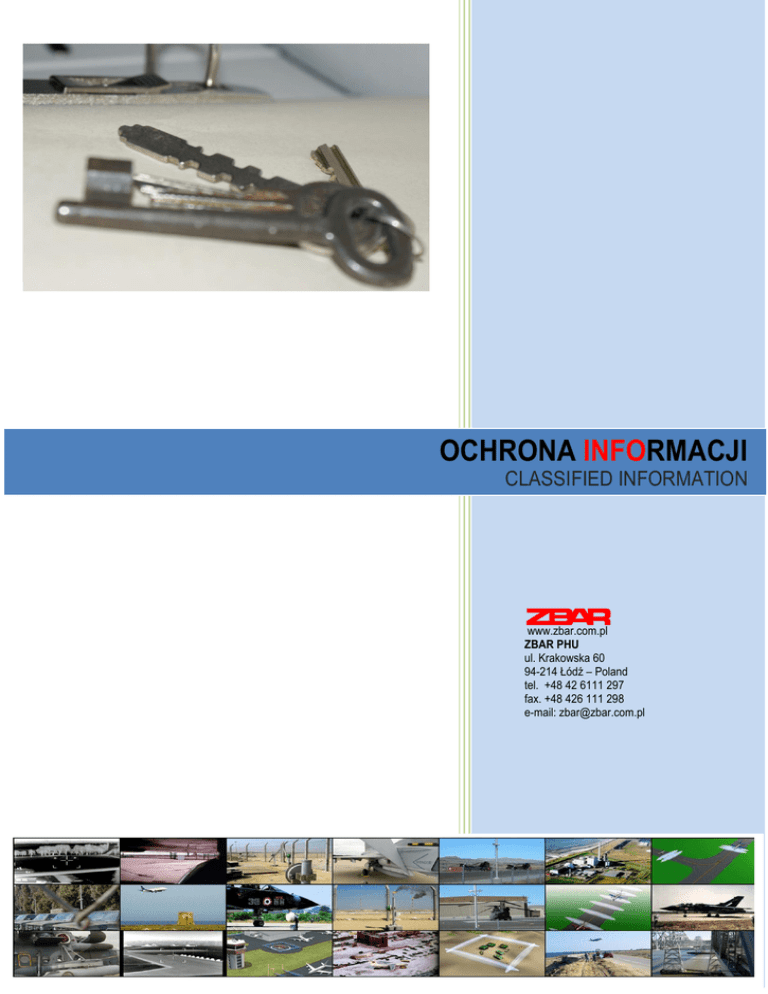 OCHRONA INFORMACJI CLASSIFIED INFORMATION www.zbar.com.pl ZBAR PHU ul. Krakowska 60 94-214 Łódź – Poland tel. +48 42 6111 297 fax. +48 426 111 298 e-mail: [email protected] OCHRONA INFORMACJI W celu realizacji zadań na rzecz Jednostek Organizacyjnych podległych Ministrowi Obrony Narodowej oraz innych instytucji wymagających dostępu do informacji niejawnych, w grupie firm ZBAR powołano Pion Ochrony Informacji Niejawnych w składzie: Pełnomocnik d/s ochrony informacji niejawnych, Kancelaria Tajna (zgodnie z Rozporządzeniem Rady Ministrów z dnia 18.10.2005 r. Dz. Urz. Nr 208 poz. 1741 z późniejszymi zmianami oraz Zarządzeniem nr 25 Ministra Obrony Narodowej z 17 listopada 2005 r. - Dz. Urz. Nr 21, poz. 203), Punkt Obsługi Dokumentów Zagranicznych (Certyfikat Akredytacji Bezpieczeństwa Fizycznego i Technicznego - egz. nr 061/PODZ/2008(C) druk ZA002573 - NATO SECRET). Zespół pracowników ZBAR posiada stosowne Poświadczenia Bezpieczeństwa upoważniające do dostępu do informacji niejawnych oznaczonych klauzulą ŚCIŚLE TAJNE i NATO SECRET włącznie. ZBAR posiada możliwość wykonywania dokumentacji z wykorzystaniem systemów teleinformatycznych posiadających certyfikaty akredytacji bezpieczeństwa teleinformatycznego upoważniające do wytwarzania, przetwarzania, przechowywania lub przekazywania w tym systemie informacji niejawnych oznaczonych klauzulą NATO SECRET, TAJNE i ŚCIŚLE TAJNE. ZBAR posiada także Świadectwo Bezpieczeństwa Przemysłowego Pierwszego Stopnia. In order to realize tasks for Organizational Units dependent on Minister of National Defense and other Institutions, which require the access to the classified information, in ZBAR the Department of Classified Information was appointed, which is represented by: Agent for Protection of classified information, Director of Secret Office, Secret Office. Service Point of Foreign Documents (Certificate of the accreditation of technical and physical security - copy nr 061/PODZ/2008(C), ZA002573 - NATO SECRET). Team of workers in ZBAR has adequate Certificate of Security authorizing to the access to classified information marked with clause TOP SECRET and including NATO SECRET. ZBAR has possibility to make documentation with use of ICT systems, which have certificates of accreditation of ICT safety, entitling to produce, process, store or transfer in this system of classified information marked with clause NATO SECRET, SECRET and TOP SECRET. ZBAR is also in the possession of The First Degree Certificate of Industrial Security Besides. ZBAR PHU | 94-214 ŁÓDŹ | KRAKOWSKA 60 | WWW.ZBAR.COM.PL | [email protected] | Tel. +48 42 6111 297 | Fax +48 42 6111 298