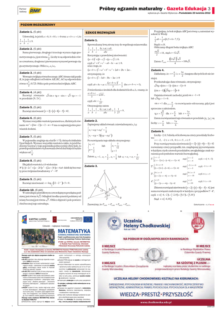 Próbny egzamin maturalny 1 Gazeta Edukacja 3 Partner radiowy wyborcza.pl Gazeta Wyborcza Poniedziałek 23 kwietnia 2012 + + POZIOM ROZSZERZONY Przyjmijmy, że bok trójkąta ABC jest równy a, natomiast wysokość h. Wtedy 1 1 ah / a 4,5 % 6 % 7,5 !. 2 2 Stąd h =18. Obliczamy długość boku trójkąta ABC: SZKICE ROZWIĄZAŃ Zadanie 1. (5 pkt) Udowodnij, że jeżeli a - 0, b - 0 i c - 0 oraz a % b % c / 1, to 1 1 1 % % ( 9. a b c Zadanie 1. Sprowadzamy lewą stronę tezy do wspólnego mianownika: 1 1 1 bc % ac % ab . % % / a b c abc Korzystając z prawdziwej nierówności: Zadanie 2. (5 pkt) Suma pierwszego, drugiego i trzeciego wyrazu ciągu geo7 metrycznego (an) jest równa . Liczby te są odpowiednio rów4 ne czwartemu, drugiemu i pierwszemu wyrazowi pewnego cią- a 3 / 18 , stąd a / 12 3 . 2 2 2 2 Zatem P1ABC / 2 2 2 czyli a % b % c # ab # bc # ac ( 0 . oraz z tego, że gu arytmetycznego. Oblicz a1, a2 i a3. a % b % c ! / a 2 % b 2 % c 2 % 2ab % 2bc % 2ac , 2 Zadanie 3. (4 pkt) Rozwiąż równanie w przedziale 0, 2. . Zakładamy, że x 0 2 1 czyli ab % bc % ac ' / (bo a % b % c / 1). 3 3 Z twierdzenia o średnich dla dodatnich liczb a, b, c mamy, że a %b%c 3 - abc , 3 1 czyli abc & . 27 Otrzymujemy zatem 1 1 1 bc % ac % ab 1 1 % % / ( : / 9. a b c abc 3 27 3 sin x 2 tg x # sin x # 3 2 tg x / # 1 Zadanie 5. (5 pkt) Rozwiąż nierówność x % 2 % x % 4 x # 5 & 42. sin x # 1! Zapisujemy układ równań z niewiadomymi a1 i q: 7 ) 2 ,a1 % a1q % a1q / 4 * ,a1 # a1q / 2 a1q # a1q 2 ! + Zadanie 7. (5 pkt) W pojemniku znajduje się n kul n ( 5!, z których dokładnie 5 jest białych. Wyznacz wszystkie wartości n takie, że jeżeli będziemy losować z tego pojemnika jednocześnie dwie kule, to prawdopodobieństwo wylosowania dwóch kul białych będzie 1 większe od . 4 Dla jakich wartości a i b wielomian W x ! / 2 x 3 % a # 2b ! x 2 # 2a % 3b !x % 6ab dzieli się bez reszty przez trójmian kwadratowy x 2 # 4? ! 3tg x # 1 / 0 Zadanie 5. Liczby –2, 0, 5 dzielą oś liczbową na cztery przedziały liczbowe: x & #2 , #2 ' x & 0 , 0 ' x & 5 , x ( 5 Przy rozwiązywaniu nierówności x % 2 % x % 4 x # 5 & 42 rozważamy cztery przypadki, tzn. znajdujemy jej rozwiązania w każdym z tych czterech przedziałów, uwzględniając znak wyrażenia pod symbolem wartości bezwzględnej. Po rozwiązaniu tego układu otrzymujemy: 7 ) ) a1 / 1 lub , a1 / , 12 * * 1 q / ,+ q / 1 ,+ 2 1 1 7 Zatem a1 / 1 , a2 / , a3 / lub a1 / a2 / a3 / . 4 2 12 Zadanie 8. (5 pkt) . 3. ix0 (tangens dla tych liczb nie ist2 2 sin x / 1 dla x / . – to rozwiązanie odrzucamy, gdyż jest 2 sprzeczne z założeniem. 7. . 3 dla x / lub x / . tg x / 6 6 3 Zatem rozwiązaniami tego równania w przedziale 0, 2. są 7. . liczby: x / lub x / . 6 6 Zadanie 2. wiastek dodatni. / 108 3 . Ostatnia równość zachodzi, jeżeli sin x # 1 / 0 lub 3tg x # 1 / 0 . Zadanie 6. (6 pkt) Wyznacz wszystkie wartości parametru m, dla których równanie mx 2 % 4m # 2 ! x % 2 # m / 0 ma co najmniej jeden pier- 3 4 nieje). Przekształcając dane równanie, otrzymujemy: 3tg x sin x # 1! # sin x # 1! / 0 a % b % c! Zadanie 4. (4 pkt) 12 3 Zadanie 4. otrzymujemy, że 2 a % b % c ! # 3ab # 3bc # 3ac ( 0 Wewnątrz trójkąta równobocznego ABC obrano taki punkt K, że jego odległości od boków AB, BC, AC są odpowiednio 1 równe 4 , 6 i 7,5. Oblicz pole powierzchni trójkąta ABC. 2 ! 2 a # b! % b # c ! % a # c ! ( 0. ) x & #2 1o. ,* stąd )* ,+ # x # 2 !% # x !% 4 # x % 5 !& 42 ) #2 ' x & 0 2o. ,* Zadanie 3. 0' x&5 4o. ),* #x Rozwiąż nierówność x % log 1 12 # 2 !% 5 & 0 . W ostrosłupie prawidłowym czworokątnym przekątna podstawy jest równa 8 2 . Odległość środka symetrii podstawy od ściany bocznej jest równa 7 . Oblicz objętość i pole powierzchni bocznej tego ostrosłupa. E czyli #2 ' x & 0 )0 ' x & 5 + x - #10 czyli 0 ' x & 5 )x ( 5 + x & 10 czyli 5 ' x & 10 stąd * Zbiorem rozwiązań nierówności x % 2 % x % 4 x # 5 & 42 jest suma rozwiązań znalezionych w każdym z przypadków 1o – 4o, czyli x " #4, #2 !$ # 2, 0 !$ 0,5 !$ 5,10 ! Zadanie 10. (6 pkt) R x(5 ,+ x % 2 ! % x % 4 x # 5 ! & 42 2 ) #2 ' x & 0 + x - #5 stąd * ,+ x % 2 !% x % 4 # x % 5 !& 42 Zadanie 9. (5 pkt) czyli x " #4, #2 ! stąd * ,+ x % 2 !% # x !% 4 # x % 5 !& 42 3o. ),* x & #2 + x - #4 Stąd x " #4,10 !. Zauważmy, że P1ABC / P1ABK % P1BCK % P1ACK . K L Dokończenie – s. 4 uuu A M A Człowiek – najlepsza inwestycja MATEMATYKA DŹWIGNIĄ INNOWACYJNEJ GOSPODARKI Projekt współfinansowany przez Unię Europejską w ramach Europejskiego Funduszu Społecznego STUDIA I-go STOPNIA, kierunek: MATEMATYKA na Wydziale Fizyki Technicznej, Informatyki i Matematyki Stosowanej Politechniki Łódzkiej Studia I stopnia (licencjackie) na kierunku MATEMATYKA Wydziału FTIMS Politechniki Łódzkiej są w roku akademickim 2012/13 zamawiane przez Ministerstwo Nauki i Szkolnictwa Wyższego Dlaczego warto być objętym programem studiów zamawianych? Do 90 studentów I roku otrzymuje stypendia w wysokości 1000 zł miesięcznie • Kandydaci objęci są kursem wyrównawczym uzupełniającym wiedzę – uczestnictwo w kursie jest swoistą polisą umożliwiającą dalsze studia na Wydziale FTIMS bez potknięć i porażek • Do 80 (70) studentów II roku (III roku) otrzymuje stypendia w wysokości 1000 zł miesięcznie • KAŻDY student II roku będzie miał możliwość uczestnictwa w finansowanym przez Unię Europejską kursie uatrakcyjniającym kształcenie – proponujemy następujące kursy: „Badania operacyjne”, „Stosowana ekonomia matematyczna”, „Statystyczne opracowanie danych” • KAŻDY student III roku, będzie mógł wziąć udział w kursie doszkalającym, ułatwiającym odnalezienie się na rynku pracy – do wyboru: język angielski biznesowy, kurs księgowości, kurs analityka finansowego, kurs maklerski (makler papierów wartościowych) Dlaczego warto studiować MATEMATYKĘ właśnie na Wydziale FTIMS PŁ? • Politechnika Łódzka zajmuje 4. miejsc