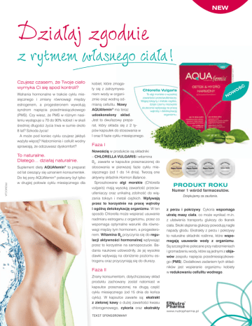 Działaj zgodnie z rytmem własnego ciała! &]XMHV]F]DVHPĝH7ZRMHFLDïR Z\P\ND&LVLÚVSRGNRQWUROL" :DKDQLD KRUPRQDOQH Z WUDNFLH F\NOX PLHVLÚF]QHJR L ]PLDQ\ UöZQRZDJL PLÚG]\ HVWURJHQHP D SURJHVWHURQHP Z\ZRïXMÈ V\QGURP QDSLÚFLD SU]HGPLHVLÈF]NRZHJR 306&]\ZLHV]ĝH306ZUöĝQ\PQDVLOHQLXZ\VWÚSXMHXGRNRELHWLZVNDOL ĂUHGQLHMGïXJRĂFLĝ\FLDWUZDZVXPLHRNRïR ODW"6]NRGDĝ\FLD $ PRĝH SRG NRQLHF F\NOX F]XMHV] MDNE\Ă ZDĝ\ïDZLÚFHM"1DEU]PLHQLDLFHOOXOLWZRGQ\ VSUDZLDMÈĝHRGF]XZDV]G\VNRPIRUW" 7RQDWXUDOQH 'ODWHJRĮG]LDïDMQDWXUDOQLH 35202&-$ 6XSOHPHQW GLHW\ AQUAfemin® WR SUHSDUDW RGODWFLHV]ÈF\VLÚX]QDQLHPNRQVXPHQWHN 'RWHMSRU\$48$IHPLQ®SROHFDQ\E\ïW\ONR Z GUXJLHM SRïRZLH F\NOX PLHVLÚF]QHJR GOD NRELHW NWöUH ]PDJDï\ VLÚ ] ]DWU]\P\ZDChlorella Vulgaris QLHPZRG\ZRUJDQLTo algi morskie o wysokiej ]DZDUWRĂFLSU]HFLZXWOHQLDF]\ ]PLHRUD]ZRGQÈRG:LÈĝÈWRNV\Q\LPHWDOHFLÚĝNLH G]LÚNLF]HPXQLH]Z\NOH PLDQÈ FHOOXOLWX Nowy VNXWHF]QLHZSï\ZDMÈQDSUDFÚ ® AQUAfemin ma teraz ZÈWURE\LGHWRNV\NDFMÚ RUJDQL]PX XGRVNRQDORQ\ VNïDG -HVW WR GZXID]RZ\ SUHSDUDW NWöU\ VNïDGD VLÚ ] W\SöZNDSVXïHNGRVWRVRZDQLDZ ,RUD],,ID]LHF\NOXPLHVLÚF]QHJR m 2¥ : 12 Faza I 1RZRĂFLÈZSURGXNFLHVÈVNïDGQLNL – CHLORELLA VULGARISLZLWDPLQD B6 ]DZDUWH Z NDSVXïFH SU]H]QDF]RQHM GR VWRVRZDQLD Z SLHUZV]HM ID]LH F\NOX PLHVLÚF]QHJR RG GR GQLD 7ZRU]È RQH DNW\ZQ\VNïDGQLNHormon Balance 6SURV]NRZDQH algi morskie (Chlorella vulgaris PDMÈ Z\VRNÈ ]DZDUWRĂÊ SU]HFLZ XWOHQLDF]\ RUD] XQLNDOQÈ ]GROQRĂÊ GR ZLÈ]DQLD WRNV\Q L PHWDOL FLÚĝNLFK :Sï\ZDMÈ SU]H] WR NRU]\VWQLH QD SUDFÚ ZÈWURE\ LRJöOQÈGHWRNV\NDFMÚRUJDQL]PX:WHQ VSRVöE&KORUHOODPRĝHZVSLHUDÊXVXZDQLH QDGPLDUXHVWURJHQX]RUJDQL]PXSU]H]FR ZVSRPDJD RSW\PDOQH ZDUXQNL GOD UöZQRZDJLPLÚG]\W\PKRUPRQHPDSURJHVWHURQHPWitamina B6SU]\F]\QLDVLÚGRreguODFMLDNW\ZQRĂFLKRUPRQDOQHMZSï\ZDMÈF SU]H] WR NRU]\VWQLH QD VDPRSRF]XFLH %DGDQLDQDXNRZH XGRZRGQLï\ĝHMHMZ\VRNLH GDZNL ZSï\ZDMÈ QD REQLĝHQLH SR]LRPX HVWURJHQXRUD]SU]\F]\QLDMÈVLÚGRGLXUH]\ Faza II PRODUKT ROKU 1XPHUZĂUöGIDUPDFHXWöZ ']LÚNXMHP\]D]DXIDQLH z perzu i pokrzywy &\NRULD wspomaga XWUDWÚ PDV\ FLDïDFRPRĝHZ\QLNDÊPLQ ] XïDWZLHQLD WUDQVSRUWX JOXNR]\ GR WNDQHN FLDïD6NRNLVWÚĝHQLDJOXNR]\SRZRGXMÈQDJïH QDSDG\ JïRGX (NVWUDNW\ ] SHU]X L SRNU]\Z\ WR QDWXUDOQH VNïDGQLNL URĂOLQQH NWöUH wspoPDJDMÈ XVXZDQLH ZRG\ ] RUJDQL]PX 6ÈV]F]HJöOQLHSROHFDQHSU]\QDEU]PLHQLDFK LJURPDG]HQLXZRG\NWöUHVÈMHGQ\PL]REMDwów ]HVSRïX QDSLÚFLD SU]HGPLHVLÈF]NRZHgo (PMS'RGDWNRZR]DGDQLHPW\FKVNïDGQLNöZ MHVW ZVSLHUDQLH RUJDQL]PX NRELHW\ w UHGXNRZDQLXFHOOXOLWXZRGQHJR =QDQ\NRQVXPHQWRPGRW\FKF]DVRZ\VNïDG SURGXNWX ]DFKRZDQ\ ]RVWDï QDWRPLDVW Z NDSVXïFH SU]H]QDF]RQHM QD GUXJÈ F]ÚĂÊ F\NOX PLHVLÚF]QHJR RG GQLD GR NRñFD F\NOX : NDSVXïFH ]DZDUWH VÈ ekstrakt ]]LHORQHMNDZ\RGXĝHM]DZDUWRĂFLNZDVX FKORURJHQRZHJR F\NRULD oraz ekstrakty ZZZQXWURSKDUPDSO TEKST SPONSOROWANY