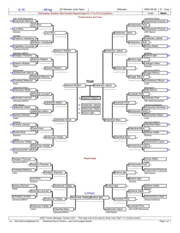 U 15 VI Warsaw Judo Open - 60 kg Warsaw 2004-09-25 31 Cmp. 3 min Matte _ Elimination System with Double Repecharge for 17 to 32 Competitors Preliminaries and final ASJ AON Warszawa Jutrzenka Plock Jakubowski Krzyszt 02 01 Brzeziński Mariusz 1 Jurs Rivo Chojnowski Prze _____:_____ 17 Jurs Rivo Estonia 17 _____:_____ Jurs Rivo Ukraine Kubieniec Jakub 21 Kubieniec Jakub 09 Zhdanov Volodymyr 2 Zhdanov Volodym 25 Cegelskis Laurynas Kubieniec Jakub _____:_____ _____:_____ Lithuania-Danas 25 Germany-NWJV 3 Gawron Robert Kubieniec Jakub _____:_____ 05 Rastgou Peyman 27 18 Mazowsze Burkun Igor 13 Jeżółkowski Maciej Burkun Igor _____:_____ Final 37 Jutrzenka Plock Gawron Robert Kubieniec Jakub _____:_____ 03 Witkowski Rafał 19 UKS Narew Slask 26 Finland Jabłoński Adam 07 Poikela Joonas Odenthal Marc 20 28 Odenthal Marc _____:_____ 28 Odenthal Marc 15 Zahkna Indek 24 24 Lithuania-Danas Cernevicius Lukas Sirokovas Vitalijs Cernevicius Luka _____:_____ 08 Estonia _____:_____ _____:_____ 14 Szymański Adam Germany-NWJV _____:_____ Sirokovas Vitalijs 15 Sirokovas Vitalijs 8 Lithuania-Klajpeda Odenthal Marc Estonia 20 Lodz _____:_____ 31 Gruszczyński Jakub Lewiński Piotr Mintauckis Donat 7 Purret Imre Latvia 23 _____:_____ _____:_____ 04 13 Mintauckis Donatas 12 3. Burkun Igor _____:_____ 30 ASJ AON Warszawa _____:_____ 3. Sirokovas Vitalij Jabłoński Adam 23 Purret Imre 12 Gorzkiewicz Borys Wall Marcin Lewiński Piotr 2. Kubieniec Jakub 14 Mazowsze _____:_____ _____:_____ Jabłoński Adam 11 Jabłoński Adam 6 38 _____:_____ 1. Gawron Robert _____:_____ 27 Karosz Damian Germany-NWJV Lewiński Piotr _____:_____ Germany-NWJV 22 Lodz Schmale Lennart 19 Schmale Lennart 22 Rogge Marius _____:_____ Lodz 5 11 Ladogin Viktor Rogge Marius Chaładaj Mateusz 4 29 Chaładaj Mateusz 06 Estonia _____:_____ _____:_____ 26 Burkun Igor _____:_____ Gawron Robert 10 Końca Rafał Ukraine _____:_____ _____:_____ Slask 10 Lodz Gawron Robert 21 Gawron Robert UKS Narew Slask _____:_____ _____:_____ 9 Chojnowski Przemy 18 16 16 _____:_____ 32 Lodz Repechage Rastgou Peyman Końca Rafał Lodz Germany-NWJV 29 Rastgou Peyman Chojnowski Prze _____:_____ Chaładaj Mateusz 33 Lodz Rastgou Peyman _____:_____ 35 Burkun Igor Ukraine 39 Sirokovas Vitalijs Burkun Igor _____:_____ 34 Sirokovas Vitalijs 41 _____:_____ Sirokovas Vitalij Burkun Igor _____:_____ _____:_____ 32 _____:_____ 42 Lewiński Piotr Cernevicius Lukas 36 Lithuania-Danas _____:_____ Sirokovas Vitalijs Latvia Estonia Zahkna Indek 3. Places _____:_____ Schmale Lennart Zahkna Indek 40 _____:_____ Schmale Lennart Germany-NWJV UKS Narew _____:_____ Estonia Karosz Damian 30 Chojnowski Przemy Burkun Igor Jurs Rivo Slask 31 _____:_____ Lewiński Piotr Odenthal Marc Jabłoński Adam Germany-NWJV UKS Narew ASJ AON Warszawa JUDO Turnier Manager, Version 4,04 ; This copy only to be used by 'Klub Judo "Rys"' ! (= License owner) (c) [email protected] Download Demo-Version: www.home.pages.at/judo Page 1 of 1