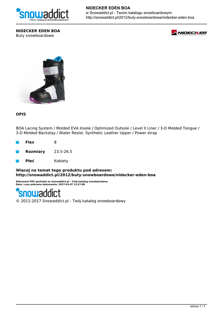 NIDECKER EDEN BOA w Snowaddict.pl - Twoim katalogu snowboardowym http://snowaddict.pl/2012/buty-snowboardowe/nidecker-eden-boa NIDECKER EDEN BOA Buty snowboardowe OPIS BOA Lacing System / Molded EVA Insole / Optimized Outsole / Level II Liner / 3-D Molded Tongue / 3-D Molded Backstay / Water Resist. Synthetic Leather Upper / Power strap Flex 8 Rozmiary 23.5-26.5 Płeć Kobiety Więcej na temat tego produktu pod adresem: http://snowaddict.pl/2012/buty-snowboardowe/nidecker-eden-boa Dokument PDF pochodzi ze Snowaddict.pl - Twój katalog snowboardowy Data i czas pobrania dokumentu: 2017-03-07 13:27:08 © 2011-2017 Snowaddict.pl - Twój katalog snowboardowy strona 1 / 1 Powered by TCPDF (www.tcpdf.org)