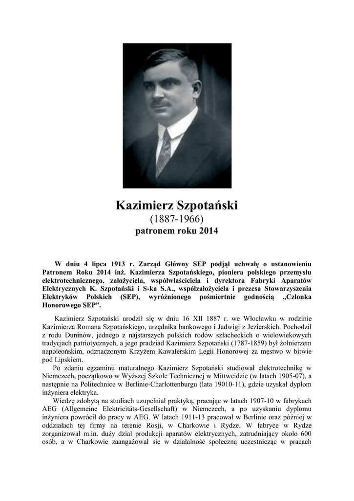 Kazimierz Szpotański (1887-1966) patronem roku 2014 W dniu 4 lipca 1913 r. Zarząd Główny SEP podjął uchwałę o ustanowieniu Patronem Roku 2014 inż. Kazimierza Szpotańskiego, pioniera polskiego przemysłu elektrotechnicznego, założyciela, współwłaściciela i dyrektora Fabryki Aparatów Elektrycznych K. Szpotański i S-ka S.A., współzałożyciela i prezesa Stowarzyszenia Elektryków Polskich (SEP), wyróżnionego pośmiertnie godnością „Członka Honorowego SEP”. Kazimierz Szpotański urodził się w dniu 16 XII 1887 r. we Włocławku w rodzinie Kazimierza Romana Szpotańskiego, urzędnika bankowego i Jadwigi z Jezierskich. Pochodził z rodu Duninów, jednego z najstarszych polskich rodów szlacheckich o wielowiekowych tradycjach patriotycznych, a jego pradziad Kazimierz Szpotański (1787-1859) był żołnierzem napoleońskim, odznaczonym Krzyżem Kawalerskim Legii Honorowej za męstwo w bitwie pod Lipskiem. Po zdaniu egzaminu maturalnego Kazimierz Szpotański studiował elektrotechnikę w Niemczech, początkowo w Wyższej Szkole Technicznej w Mittweidzie (w latach 1905-07), a następnie na Politechnice w Berlinie-Charlottenburgu (lata 19010-11), gdzie uzyskał dyplom inżyniera elektryka. Wiedzę zdobytą na studiach uzupełniał praktyką, pracując w latach 1907-10 w fabrykach AEG (Allgemeine Elektricitäts-Gesellschaft) w Niemczech, a po uzyskaniu dyplomu inżyniera powrócił do pracy w AEG. W latach 1911-13 pracował w Berlinie oraz później w oddziałach tej firmy na terenie Rosji, w Charkowie i Rydze. W fabryce w Rydze zorganizował m.in. duży dział produkcji aparatów elektrycznych, zatrudniający około 600 osób, a w Charkowie zaangażował się w działalność społeczną uczestnicząc w pracach Charkowskiego Oddziału Stowarzyszenia Techników Polskich w Rosji, gdzie w latach 191718 pełnił funkcję skarbnika. Pod koniec I wojny światowej, gdy po 123 latach niewoli Polska odzyskiwała niepodległość, Kazimierz Szpotański w sierpniu 1918 r. przyjechał do Warszawy i tam wykorzystując zdobytą wiedzę i niewielki kapitał zgromadzony w trakcie pracy w AEG, w listopadzie tegoż roku otworzył warsztat elektryczny przy ul. Mirowskiej 9. Swój warsztat nazwał „Fabryką Aparatów Elektrycznych K. Szpotański” z tym, że w latach 1919-23 K. Szpotański działał w spółce ze Stefanem Ciszewskim. Spółka rozwijała się dobrze i wystawiała swoje wyroby m.in. na krajowych Targach w Poznaniu i Lwowie. Ponadto inż. K. Szpotański nie zaniedbywał też działalności stowarzyszeniowej i w roku 1918 został członkiem Koła Elektrotechników istniejącym przy Stowarzyszeniu Techników w Warszawie. W marcu został wybrany członkiem 6-osobowego Komitetu Organizacyjnego Ogólnopolskiego Zjazdu Elektrotechników, któremu przewodniczył prof. Mieczysław Pożaryski. Zjazd odbył się w dniach 7-9 czerwca 1919 roku w Warszawie i w ostatnim dniu Zjazdu uchwalono powołanie Stowarzyszenia Elektryków Polskich (SEP). Dokonano też wyboru tymczasowego 9-osobowego Zarządu SEP z przewodniczącym prof. M. Pożaryskim, w składzie którego był również inż. K. Szpotański. W 1924 r., celem zwiększenia kapitału inwestycyjnego swojej firmy, inż. Szpotański przekształcił ją w spółkę pod nazwą „Fabryka Aparatów Elektrycznych K. Szpotański i S-ka, Spółka Akcyjna” (FAE). Na początku lat 30 w FAE rozpoczęto produkcję liczników energii elektrycznej, stając się poważną konkurencją na rynku polskim dla firmy Siemens. Produkowane liczniki energii w FAE spełniały wszelkie wymogi międzynarodowe i fabryka uzyskała uprawnienia do legalizacji takich liczników. Na liczniki stale rosło zapotrzebowanie, związane z coraz szybszą elektryfikacja kraju i dzięki temu firma FAE znacząco się rozwinęła. Inż. K. Szpotański był otwarty na współpracę międzynarodową, korzystał też z licencji, zwiększając tym samym dynamikę rozwoju produkcji. Kazimierz Szpotański stosował też zasady nowoczesnego marketingu. Wytwarzane przez FAE produkty były demonstrowane na wystawach krajowych i zagranicznych (m.in. w Nowym Jorku w 1939 r.), zdobywając liczne wyróżnienia i nagrody, a ponadto FAE prowadziła działalność informacyjną wydając katalogi, broszury oraz własne pismo pt. „Informacje dla przyjaciół FAE”. Takiemu marketingowi sprzyjała zasada dobrej jakości, gdyż inż. Szpotański wymagał aby każdy produkt FAE był trwały i spełniał najwyższe wymogi jakości, estetyki, ekonomiczności i nowoczesności. W 1937 r. za swoje osiągniecia inż. Kazimierz Szpotański otrzymał, z rąk prezydenta Ignacego Mościckiego, Krzyż Kawalerski Orderu Odrodzenia Polski. W 1937 roku został też odznaczony nowo ustanowioną Złotą Odznaką Honorową SEP, a w następnym roku wybrano go prezesem SEP i funkcję tę pełnił do roku 1939. W tym też czasie kierowana przez niego firma FAE podjęła produkcję aparatury rentgenowskiej, a jej prototypy zyskały akceptację i powszechne uznanie najwybitniejszych radiologów polskich, uznających je za co najmniej równorzędne aparatom zagranicznym. W roku 1939, tuż przed wybuchem II wojny światowej firma K. Szpotańskiego FAE zatrudniała ponad 1500 pracowników, w tym około 120 inżynierów. Łącznie produkowano tam 38 grup różnych wyrobów i około 400 rodzajów różnych aparatów. Produkty FAE były powszechnie stosowane w całym, tworzonym w Polsce w okresie międzywojennym systemie elektroenergetycznym. Po wybuchu II wojny światowej w 1939 r. nowo wybrany prezes SEP kpt. inż. A. Krzyczkowski został zmobilizowany i nie objął tej funkcji. Tym samym funkcję prezesa pełnił inż. K. Szpotański, jako dotychczasowy prezes, aż do roku 1946. W okresie okupacji niemieckiej fabryka FAE nadal działała pod kierownictwem inż. Szpotańskiego, a on starał się pomagać w różnorodny sposób mieszkańcom Warszawy jak również członkom ruchu oporu. Nie minęły go również repr