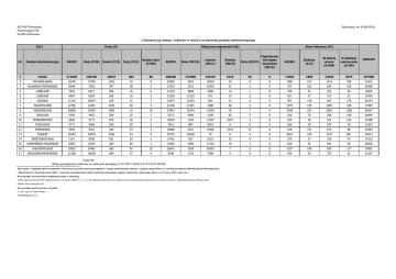KG PSP Warszawa Podchorążych 38 00-463 Warszawa Warszawa, dn.16-06-2012r. 1. Zdarzenia wg rodzaju i wielkości w rozbiciu na jednostkę podziału administracyjnego 2011 Pożar (P) Miejscowe zagrożenie (MZ) Alarm fałszywy (AF) Podział administracyjny RAZEM Mały (P/M) Średni (P/Ś) Duży (P/D) Bardzo duży (P/BD) RAZEM Małe (MZ/M) Lokalne (MZ/L) Średnie (MZ/Ś) Duże (MZ/D) Gigantyczne lub klęska żywiołowa (MZ/K) RAZEM Złośliwy (A/Z) W dobrej wierze (A/DW) Z instalacji wykrywania (A/IW) OGÓŁEM 1 Polska 171839 160720 10557 482 80 268280 127809 135187 5219 65 0 17869 1855 12039 3975 457988 2 DOLNOŚLĄSKIE 19248 17995 1202 43 8 22082 3014 19035 33 0 0 1985 213 1413 359 43315 3 KUJAWSKO-POMORSKIE 8048 7659 347 38 4 17653 1631 15953 67 2 0 767 103 564 100 26468 4 LUBELSKIE 7093 6571 506 16 0 11472 9868 1589 14 1 0 370 57 253 60 18935 5 LUBUSKIE 6607 6203 366 35 3 12228 11535 671 19 3 0 621 57 513 51 19456 6 ŁÓDZKIE 11310 10644 628 31 7 15873 15253 601 13 6 0 951 139 642 170 28134 LP. 7 MAŁOPOLSKIE 12765 11691 1043 28 3 23148 21391 1688 66 3 0 1574 149 1087 338 37487 8 MAZOWIECKIE 20658 19539 1090 19 10 37843 25244 12550 42 7 0 3546 257 2083 1206 62047 9 OPOLSKIE 4785 4452 309 22 2 5273 4096 1109 65 3 0 636 70 368 198 10694 10 PODKARPACKIE 6665 5771 876 16 2 15078 1245 11407 2417 9 0 545 49 331 165 22288 11 PODLASKIE 3771 3489 260 20 2 7816 887 6923 6 0 0 266 39 197 30 11853 12 POMORSKIE 9484 9163 294 23 4 18990 2522 14026 2421 21 0 918 157 673 88 29392 13 ŚLĄSKIE 25445 23876 1506 54 9 25753 25696 42 11 4 0 2615 240 1574 801 53813 14 ŚWIĘTOKRZYSKIE 7101 6398 691 10 2 6730 567 6153 10 0 0 279 37 185 57 14110 15 WARMIŃSKO-MAZURSKIE 6556 6240 285 28 3 13452 1699 11733 19 1 0 620 55 481 84 20628 16 WIELKOPOLSKIE 10923 10401 465 42 15 25641 1428 24201 7 5 0 1237 140 920 177 37801 17 ZACHODNIOPOMORSKIE 11380 10628 689 57 6 9248 1733 7506 9 0 0 939 93 755 91 21567 Użyty filtr: [Data sporządzenia meldunku ze zdarzenia pomiędzy 01-01-2011 00:00 a 01-01-2012 00:00] Opis pojęć z nagłówka tabeli przedstawia "Instrukcja w sprawie zasad sporządzania i obiegu dokumentacji zdarzeń”, będąca załącznikiem nr 3 do Rozporządzenia Ministra Spraw Wewnętrznych i Administracji z dnia 29 grudnia 1999 r. w sprawie szczegółowych zasad organizacji krajowego systemu ratowniczo- gaśniczego (Dz.U. nr 111 poz. 1311 z póź. zm.). W przypadku upubliczniania statystyk prosimy o adnotację: "Dane statystyczne KG PSP wygenerowane w systemie SWD-ST (v. 3.1.0.19). Materiał opracowano w Krajowym Centrum Koordynacji Ratownictwa i Ochrony Ludności, Wydział Koordynacji Ratownictwa [źródło: www.kgpsp.gov.pl]". W przypadku pytań prosimy o kontakt: st. kpt. mgr inż. Robert Mazur, [email protected].