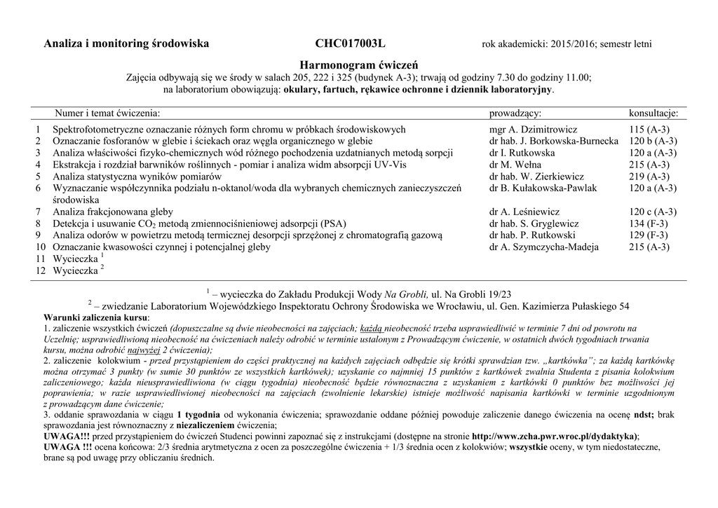 Analiza i monitoring środowiska CHC017003L rok akademicki: 2015/2016; semestr letni Harmonogram ćwiczeń Zajęcia odbywają się we środy w salach 205, 222 i 325 (budynek A-3); trwają od godziny 7.30 do godziny 11.00; na laboratorium obowiązują: okulary, fartuch, rękawice ochronne i dziennik laboratoryjny. Numer i temat ćwiczenia: Spektrofotometryczne oznaczanie różnych form chromu w próbkach środowiskowych Oznaczanie fosforanów w glebie i ściekach oraz węgla organicznego w glebie Analiza właściwości fizyko-chemicznych wód różnego pochodzenia uzdatnianych metodą sorpcji Ekstrakcja i rozdział barwników roślinnych - pomiar i analiza widm absorpcji UV-Vis Analiza statystyczna wyników pomiarów Wyznaczanie współczynnika podziału n-oktanol/woda dla wybranych chemicznych zanieczyszczeń środowiska 7 Analiza frakcjonowana gleby 8 Detekcja i usuwanie CO2 metodą zmiennociśnieniowej adsorpcji (PSA) 9 Analiza odorów w powietrzu metodą termicznej desorpcji sprzężonej z chromatografią gazową 10 Oznaczanie kwasowości czynnej i potencjalnej gleby 11 Wycieczka 1 12 Wycieczka 2 1 2 3 4 5 6 prowadzący: konsultacje: mgr A. Dzimitrowicz dr hab. J. Borkowska-Burnecka dr I. Rutkowska dr M. Wełna dr hab. W. Zierkiewicz dr B. Kułakowska-Pawlak 115 (A-3) 120 b (A-3) 120 a (A-3) 215 (A-3) 219 (A-3) 120 a (A-3) dr A. Leśniewicz dr hab. S. Gryglewicz dr hab. P. Rutkowski dr A. Szymczycha-Madeja 120 c (A-3) 134 (F-3) 129 (F-3) 215 (A-3) 1 2 – wycieczka do Zakładu Produkcji Wody Na Grobli, ul. Na Grobli 19/23 – zwiedzanie Laboratorium Wojewódzkiego Inspektoratu Ochrony Środowiska we Wrocławiu, ul. Gen. Kazimierza Pułaskiego 54 Warunki zaliczenia kursu: 1. zaliczenie wszystkich ćwiczeń (dopuszczalne są dwie nieobecności na zajęciach; każdą nieobecność trzeba usprawiedliwić w terminie 7 dni od powrotu na Uczelnię; usprawiedliwioną nieobecność na ćwiczeniach należy odrobić w terminie ustalonym z Prowadzącym ćwiczenie, w ostatnich dwóch tygodniach trwania kursu, można odrobić najwyżej 2 ćwiczenia); 2. zaliczenie kolokwium - przed przystąpieniem do części praktycznej na każdych zajęciach odbędzie się krótki sprawdzian tzw. „kartkówka”; za każdą kartkówkę można otrzymać 3 punkty (w sumie 30 punktów ze wszystkich kartkówek); uzyskanie co najmniej 15 punktów z kartkówek zwalnia Studenta z pisania kolokwium zaliczeniowego; każda nieusprawiedliwiona (w ciągu tygodnia) nieobecność będzie równoznaczna z uzyskaniem z kartkówki 0 punktów bez możliwości jej poprawienia; w razie usprawiedliwionej nieobecności na zajęciach (zwolnienie lekarskie) istnieje możliwość napisania kartkówki w terminie uzgodnionym z prowadzącym dane ćwiczenie; 3. oddanie sprawozdania w ciągu 1 tygodnia od wykonania ćwiczenia; sprawozdanie oddane później powoduje zaliczenie danego ćwiczenia na ocenę ndst; brak sprawozdania jest równoznaczny z niezaliczeniem ćwiczenia; UWAGA!!! przed przystąpieniem do ćwiczeń Studenci powinni zapoznać się z instrukcjami (dostępne na stronie http://www.zcha.pwr.wroc.pl/dydaktyka); UWAGA !!! ocena końcowa: 2/3 średnia arytmetyczna z ocen za poszczególne ćwiczenia + 1/3 średnia ocen z kolokwiów; wszystkie oceny, w tym niedostateczne, brane są pod uwagę przy obliczaniu średnich. Analiza i monitoring środowiska CHC017003L Rozkład zajęć: UWAGA!!! w nawiasach podano numer pracowni, w której odbywać się będzie ćwiczenie Zajęcia organizacyjne odbędą się 24 lutego 2016 roku (jeden termin dla wszystkich grup) Zajęcia „odróbkowe” odbędą się 1 i 8 czerwca 2016 roku Zajęcia odbywają się w godzinach: 7.30 – 11.00 (realizowane są bez przerw) 02.03 9.03 16.03 wycieczka1 30.03 06.04 Grupa 1; C 00-65a 1 (205/A3) 2 (222/A3) 3 (135/A3) 4 (205/A3) Grupa 2; C 00-65b 10 (325/A3) wycieczka1 1 (205/A3) 2 (222/A3) 3 (135/A3) Grupa 3; C 00-65c 9 (129/F3) 10 (325/A3) wycieczka1 1 (205/A3) 2 (222/A3) Grupa 4; C 00-65d 8 (134/F3) 9 (129/F3) 10 (325/A3) wycieczka1 1 (205/A3) 1 2 13.04 20.04 5 (323/A3) 4 (205/A3) 3 (135/A3) 2 (222/A3) wycieczka2 27.04 6 (222/A3) 5 (323/A3) wycieczka2 4 (205/A3) 5 (323/A3) 3 (135/A3) 4 (205/A3) 04.05 11.05 7 (217/A3) 8 (134/F3) 6 (222/A3) 7 (217A3) wycieczka2 6 (222/A3) 5 (323/A3) wycieczka2 18.05 25.05 9 (129/F3) 8 (134/F3) 9 (129/F3) 7 (217/A3) 8 (134/F3) 6 (222/A3) 7 (217/A3) – wycieczka do Zakładu Produkcji Wody Na Grobli, ul. Na Grobli 19/23 – zwiedzanie Laboratorium Wojewódzkiego Inspektoratu Ochrony Środowiska we Wrocławiu, ul. Gen. Kazimierza Pułaskiego 54 10 (205/A3)