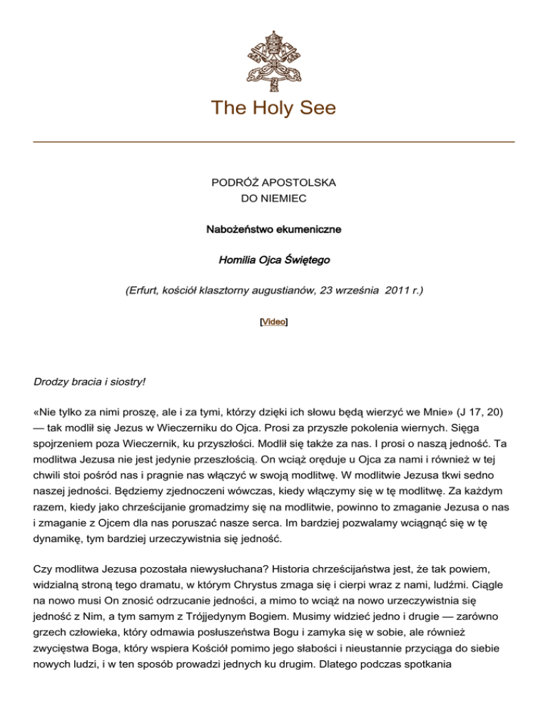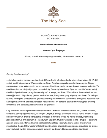 The Holy See PODRÓŻ APOSTOLSKA DO NIEMIEC Nabożeństwo ekumeniczne Homilia Ojca Świętego (Erfurt, kościół klasztorny augustianów, 23 września 2011 r.) [Video] Drodzy bracia i siostry! «Nie tylko za nimi proszę, ale i za tymi, którzy dzięki ich słowu będą wierzyć we Mnie» (J 17, 20) — tak modlił się Jezus w Wieczerniku do Ojca. Prosi za przyszłe pokolenia wiernych. Sięga spojrzeniem poza Wieczernik, ku przyszłości. Modlił się także za nas. I prosi o naszą jedność. Ta modlitwa Jezusa nie jest jedynie przeszłością. On wciąż oręduje u Ojca za nami i również w tej chwili stoi pośród nas i pragnie nas włączyć w swoją modlitwę. W modlitwie Jezusa tkwi sedno naszej jedności. Będziemy zjednoczeni wówczas, kiedy włączymy się w tę modlitwę. Za każdym razem, kiedy jako chrześcijanie gromadzimy się na modlitwie, powinno to zmaganie Jezusa o nas i zmaganie z Ojcem dla nas poruszać nasze serca. Im bardziej pozwalamy wciągnąć się w tę dynamikę, tym bardziej urzeczywistnia się jedność. Czy modlitwa Jezusa pozostała niewysłuchana? Historia chrześcijaństwa jest, że tak powiem, widzialną stroną tego dramatu, w którym Chrystus zmaga się i cierpi wraz z nami, ludźmi. Ciągle na nowo musi On znosić odrzucanie jedności, a mimo to wciąż na nowo urzeczywistnia się jedność z Nim, a tym samym z Trójjedynym Bogiem. Musimy widzieć jedno i drugie — zarówno grzech człowieka, który odmawia posłuszeństwa Bogu i zamyka się w sobie, ale również zwycięstwa Boga, który wspiera Kościół pomimo jego słabości i nieustannie przyciąga do siebie nowych ludzi, i w ten sposób prowadzi jednych ku drugim. Dlatego podczas spotkania 2 ekumenicznego nie powinniśmy tylko narzekać na podziały i rozłamy, ale powinniśmy dziękować Bogu za wszystko, co zachowało się z jedności i co nieustannie daje nam na nowo. Ta wdzięczność musi być jednocześnie czujnością, by w czasie pokus i zagrożeń nie utracić tak danej jedności. Podstawowa jedność polega na tym, że wierzymy w Boga Wszechmogącego, Ojca, Stworzyciela nieba i ziemi. Że wyznajemy Go jako Trójjedynego — Ojca, Syna i Ducha Świętego. Najwyższa jedność nie jest samotnością monady, ale jednością przez miłość. Wierzymy w Boga — w konkretnego Boga. Wierzymy, że Bóg przemówił do nas i stał się jednym z nas. W obecnej chwili naszym wspólnym zadaniem jest dawanie świadectwa o tym Bogu żywym. Czy człowiek potrzebuje Boga, czy też i bez Niego dzieje się całkiem dobrze? Kiedy w pierwszych chwilach nieobecności Boga Jego światło nadal promieniuje i podtrzymuje ład ludzkiej egzystencji, wydaje się, że również bez Boga wszystko funkcjonuje dość dobrze. Ale im bardziej świat oddala się od Boga, tym wyraźniej widać, że człowiek coraz bardziej traci życie w hybris władzy, w pustce serca i tęsknocie do spełnienia i szczęścia. Nie da się wykorzenić istniejącego w człowieku pragnienia nieskończoności. Człowiek został stworzony do relacji z Bogiem i Go potrzebuje. Naszą pierwszą posługą ekumeniczną w tych czasach musi być wspólne świadectwo o obecności żywego Boga, a tym samym dawanie światu odpowiedzi, jakiej potrzebuje. Do tego podstawowego świadectwa o Bogu należy oczywiście głównie świadectwo o Jezusie Chrystusie, prawdziwym Bogu i prawdziwym człowieku, który żył z nami, za nas cierpiał i umarł, a przez swoje zmartwychwstanie pokonał bramę śmierci. Drodzy przyjaciele, umacniajmy się w tej wierze! Pomagajmy sobie nawzajem nią żyć! To jest wielkie zadanie ekumeniczne, które wprowadza nas w istotę modlitwy Jezusa. Szczerość wiary w Boga przejawia się w życiu Jego słowem. W naszych czasach przejawia się bardzo konkretnie w trosce o to stworzenie, które On uczynił na swoje podobieństwo — człowieka. Żyjemy w czasie, kiedy niepewne stało się, co znaczy być człowiekiem. Etykę zastępuje obliczanie skutków. W tej sytuacji my, jako chrześcijanie, musimy bronić nienaruszalnej godności człowieka od poczęcia aż do śmierci — od kwestii związanych z diagnostyką preimplantacyjną po eutanazję. «Tylko ten, kto zna Boga, zna człowieka» — powiedział kiedyś Romano Guardini. Gdy człowiek nie zna Boga, łatwo jest nim manipulować. Wiara w Boga musi być skonkretyzowana w naszych wspólnych działaniach na rzecz człowieka. Do tej troski o człowieka należą nie tylko podstawowe kryteria człowieczeństwa, ale przede wszystkim i bardzo praktycznie miłość, o której naucza nas Jezus Chrystus w przypowieści o Sądzie Ostatecznym (Mt 25): Bóg, Sędzia osądzi nas według tego, jak zachowaliśmy się wobec bliźniego, wobec najmniejszych z Jego braci. Istotnym zadaniem chrześcijanina w dzisiejszych czasach jest gotowość niesienia pomocy potrzebującym poza własnym środowiskiem życia. Jak zostało powiedziane, dotyczy to przede wszystkim dziedziny życia osobistego każdego człowieka. Odnosi się jednak również do wspólnoty narodu i państwa, gdzie wszyscy musimy czuć 3 się odpowiedzialni jeden za drugiego. Odnosi się do naszego kontynentu, na którym jesteśmy wezwani do solidarności na skalę europejską. I wreszcie także ponad wszelkimi granicami: chrześcijańska miłość bliźniego wymaga od nas dzisiaj również zaangażowania na rzecz sprawiedliwości na całym świecie. Wiem, że Niemcy — obywatele i państwo — wiele robią, aby umożliwić wszystkim ludziom egzystencję godną człowieka, i chciałbym za to wyrazić serdeczne podziękowanie. Na koniec chciałbym jeszcze wspomnieć o głębszym wymiarze naszego obowiązku miłości. Szczerość wiary jest szczególnie widoczna, kiedy inspiruje ona ludzi do oddania się całkowicie do dyspozycji Bogu, a wychodząc od Boga — innym. Wielka pomoc będzie konkretna jedynie wówczas, gdy na miejscu są ludzie całkowicie oddani innym i w ten sposób uwiarygodniający miłość Boga. Tacy ludzie są