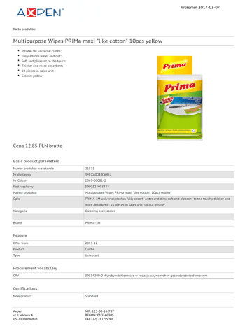 Wołomin 2017-03-07 Karta produktu: Multipurpose Wipes PRIMa maxi "like cotton" 10pcs yellow PRIMA-3M universal cloths; Fully absorb water and dirt; Soft and pleasant to the touch; Thicker and more absorbent; 10 pieces in sales unit Colour: yellow Cena 12,85 PLN brutto Basic product parameters Numer produktu w systemie 21571 Nr dostawcy 3M-XA004806452 Nr Celcen 2369-00081-2 Kod kreskowy 5900323003434 Nazwa produktu Multipurpose Wipes PRIMa maxi "like cotton" 10pcs yellow Opis PRIMA-3M universal cloths;; fully absorb water and dirt;; soft and pleasant to the touch;; thicker and more absorbent;; 10 pieces in sales unit; colour: yellow Kategoria Cleaning accessories Brand PRIMA-3M Feature Offer from 2013-12 Product Cloths Type Universal Procurement vocabulary CPV 39514200-0 Wyroby włókiennicze w rodzaju używanych w gospodarstwie domowym Certifications New product Standard Axpen ul. Laskowa 4 05-200 Wołomin NIP: 125-00-16-787 REGON: 010346305 +48 (22) 787 55 99 Wołomin 2017-03-07 Karta katalogowa produktu cd. Multipurpose Wipes PRIMa maxi "like cotton" 10pcs yellow Hit Standard Colour Colour Yellow Serdecznie zapraszamy do współpracy Axpen zespół. Axpen ul. Laskowa 4 05-200 Wołomin NIP: 125-00-16-787 REGON: 010346305 +48 (22) 787 55 99