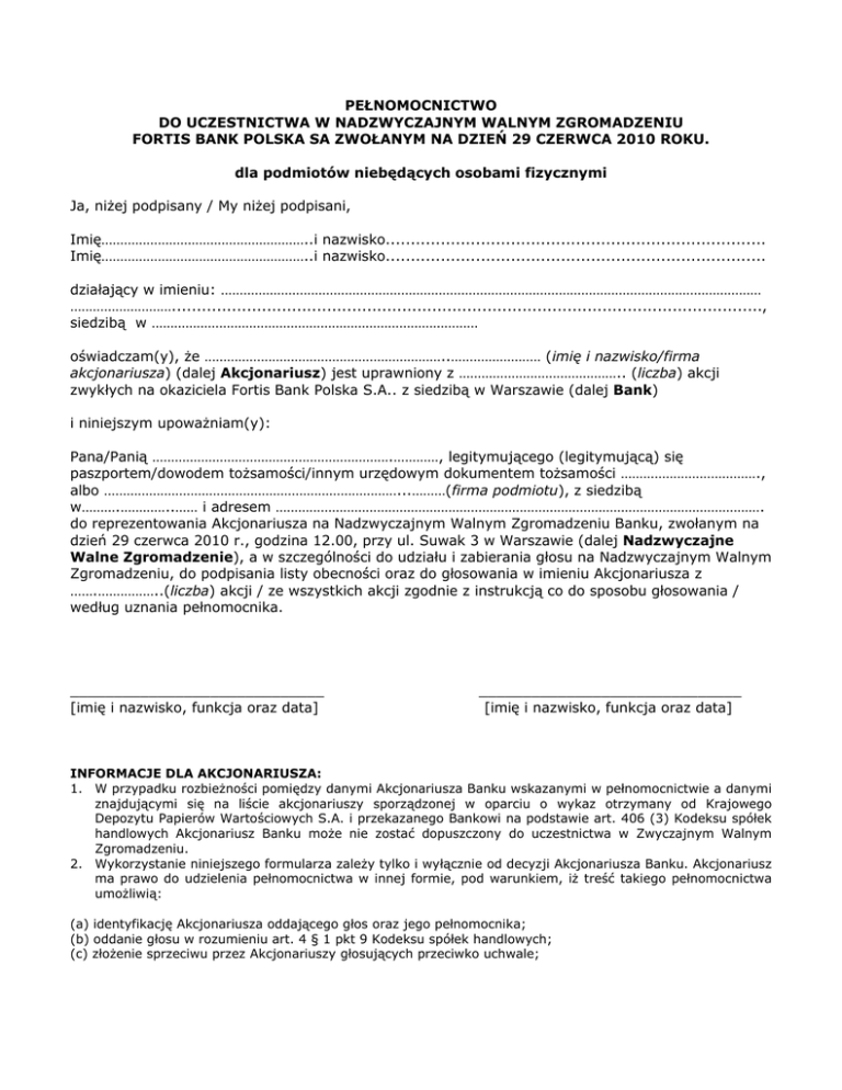 PEŁNOMOCNICTWO DO UCZESTNICTWA W NADZWYCZAJNYM WALNYM ZGROMADZENIU FORTIS BANK POLSKA SA ZWOŁANYM NA DZIEŃ 29 CZERWCA 2010 ROKU. dla podmiotów niebędących osobami fizycznymi Ja, niżej podpisany / My niżej podpisani, Imię………………………………………………..i nazwisko............................................................................ Imię………………………………………………..i nazwisko............................................................................ działający w imieniu: ……………………………………………………………………………………………………………………………… ………………………......................................................................................................................, siedzibą w …………………………………………………………………………… oświadczam(y), że ………………………………………………………..…………………… (imię i nazwisko/firma akcjonariusza) (dalej Akcjonariusz) jest uprawniony z …………………………………….. (liczba) akcji zwykłych na okaziciela Fortis Bank Polska S.A.. z siedzibą w Warszawie (dalej Bank) i niniejszym upoważniam(y): Pana/Panią ……………………………………………………….…………, legitymującego (legitymującą) się paszportem/dowodem tożsamości/innym urzędowym dokumentem tożsamości ………………………………., albo ……………………………………………………………………...………(firma podmiotu), z siedzibą w……….…………..…… i adresem …………………………………………………………………………………………………………………. do reprezentowania Akcjonariusza na Nadzwyczajnym Walnym Zgromadzeniu Banku, zwołanym na dzień 29 czerwca 2010 r., godzina 12.00, przy ul. Suwak 3 w Warszawie (dalej Nadzwyczajne Walne Zgromadzenie), a w szczególności do udziału i zabierania głosu na Nadzwyczajnym Walnym Zgromadzeniu, do podpisania listy obecności oraz do głosowania w imieniu Akcjonariusza z …….……………..(liczba) akcji / ze wszystkich akcji zgodnie z instrukcją co do sposobu głosowania / według uznania pełnomocnika. _____________________________ [imię i nazwisko, funkcja oraz data] ______________________________ [imię i nazwisko, funkcja oraz data] INFORMACJE DLA AKCJONARIUSZA: 1. W przypadku rozbieżności pomiędzy danymi Akcjonariusza Banku wskazanymi w pełnomocnictwie a danymi znajdującymi się na liście akcjonariuszy sporządzonej w oparciu o wykaz otrzymany od Krajowego Depozytu Papierów Wartościowych S.A. i przekazanego Bankowi na podstawie art. 406 (3) Kodeksu spółek handlowych Akcjonariusz Banku może nie zostać dopuszczony do uczestnictwa w Zwyczajnym Walnym Zgromadzeniu. 2. Wykorzystanie niniejszego formularza zależy tylko i wyłącznie od decyzji Akcjonariusza Banku. Akcjonariusz ma prawo do udzielenia pełnomocnictwa w innej formie, pod warunkiem, iż treść takiego pełnomocnictwa umożliwią: (a) identyfikację Akcjonariusza oddającego głos oraz jego pełnomocnika; (b) oddanie głosu w rozumieniu art. 4 § 1 pkt 9 Kodeksu spółek handlowych; (c) złożenie sprzeciwu przez Akcjonariuszy głosujących przeciwko uchwale;