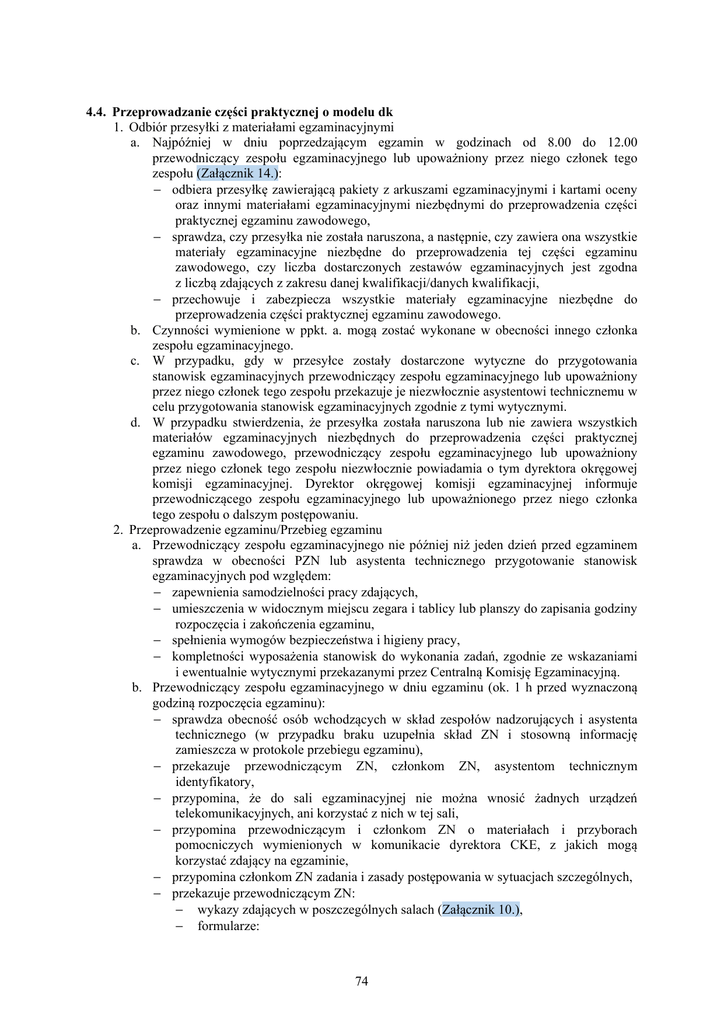 4.4. Przeprowadzanie części praktycznej o modelu dk 1. Odbiór przesyłki z materiałami egzaminacyjnymi a. Najpóźniej w dniu poprzedzającym egzamin w godzinach od 8.00 do 12.00 przewodniczący zespołu egzaminacyjnego lub upoważniony przez niego członek tego zespołu (Załącznik 14.): − odbiera przesyłkę zawierającą pakiety z arkuszami egzaminacyjnymi i kartami oceny oraz innymi materiałami egzaminacyjnymi niezbędnymi do przeprowadzenia części praktycznej egzaminu zawodowego, − sprawdza, czy przesyłka nie została naruszona, a następnie, czy zawiera ona wszystkie materiały egzaminacyjne niezbędne do przeprowadzenia tej części egzaminu zawodowego, czy liczba dostarczonych zestawów egzaminacyjnych jest zgodna z liczbą zdających z zakresu danej kwalifikacji/danych kwalifikacji, − przechowuje i zabezpiecza wszystkie materiały egzaminacyjne niezbędne do przeprowadzenia części praktycznej egzaminu zawodowego. b. Czynności wymienione w ppkt. a. mogą zostać wykonane w obecności innego członka zespołu egzaminacyjnego. c. W przypadku, gdy w przesyłce zostały dostarczone wytyczne do przygotowania stanowisk egzaminacyjnych przewodniczący zespołu egzaminacyjnego lub upoważniony przez niego członek tego zespołu przekazuje je niezwłocznie asystentowi technicznemu w celu przygotowania stanowisk egzaminacyjnych zgodnie z tymi wytycznymi. d. W przypadku stwierdzenia, że przesyłka została naruszona lub nie zawiera wszystkich materiałów egzaminacyjnych niezbędnych do przeprowadzenia części praktycznej egzaminu zawodowego, przewodniczący zespołu egzaminacyjnego lub upoważniony przez niego członek tego zespołu niezwłocznie powiadamia o tym dyrektora okręgowej komisji egzaminacyjnej. Dyrektor okręgowej komisji egzaminacyjnej informuje przewodniczącego zespołu egzaminacyjnego lub upoważnionego przez niego członka tego zespołu o dalszym postępowaniu. 2. Przeprowadzenie egzaminu/Przebieg egzaminu a. Przewodniczący zespołu egzaminacyjnego nie później niż jeden dzień przed egzaminem sprawdza w obecności PZN lub asystenta technicznego przygotowanie stanowisk egzaminacyjnych pod względem: − zapewnienia samodzielności pracy zdających, − umieszczenia w widocznym miejscu zegara i tablicy lub planszy do zapisania godziny rozpoczęcia i zakończenia egzaminu, − spełnienia wymogów bezpieczeństwa i higieny pracy, − kompletności wyposażenia stanowisk do wykonania zadań, zgodnie ze wskazaniami i ewentualnie wytycznymi przekazanymi przez Centralną Komisję Egzaminacyjną. b. Przewodniczący zespołu egzaminacyjnego w dniu egzaminu (ok. 1 h przed wyznaczoną godziną rozpoczęcia egzaminu): − sprawdza obecność osób wchodzących w skład zespołów nadzorujących i asystenta technicznego (w przypadku braku uzupełnia skład ZN i stosowną informację zamieszcza w protokole przebiegu egzaminu), − przekazuje przewodniczącym ZN, członkom ZN, asystentom technicznym identyfikatory, − przypomina, że do sali egzaminacyjnej nie można wnosić żadnych urządzeń telekomunikacyjnych, ani korzystać z nich w tej sali, − przypomina przewodniczącym i członkom ZN o materiałach i przyborach pomocniczych wymienionych w komunikacie dyrektora CKE, z jakich mogą korzystać zdający na egzaminie, − przypomina członkom ZN zadania i zasady postępowania w sytuacjach szczególnych, − przekazuje przewodniczącym ZN: − wykazy zdających w poszczególnych salach (Załącznik 10.), − formularze: 74 − protokołu przebiegu części praktycznej egzaminu w danej sali (Załącznik 9.), − Decyzji o przerwaniu i unieważnieniu części egzaminu (Załącznik 7.), − Oświadczenia zdającego o rezygnacji ze zdawania egzaminu (Załącznik 8.). − zestawy naklejek dla zdających w sali – o ile nie zostały przekazane zdającym wcześniej, − kartki z numerami stanowisk egzaminacyjnych, − papierową kopertę na niewykorzystane arkusze egzaminacyjne (dla każdej kwalifikacji w danej sali oddzielna koperta), − bezpieczną kopertę/bezpieczne koperty do zapakowania arkuszy egzaminacyjnych, kart oceny i rezultatów pracy zdających po zakończeniu egzaminu (dla każdej kwalifikacji w danej sali oddzielna koperta). − sprawdza czy pakiety do części praktycznej zawierające arkusze i karty oceny nie zostały naruszone, − w przypadku stwierdzenia, że pakiety do części praktycznej egzaminu zawodowego zostały naruszone w sposób umożliwiający nieuprawniony dostęp do ich zawartości, PZE zawiesza część praktyczną egzaminu zawodowego i powiadamia o tym dyrektora oke, który informuje PZE o dalszym postępowaniu. Informację o zawieszeniu części praktycznej egzaminu zawodowego oraz podjętych działaniach zamieszcza się w protokołach przebiegu egzaminu w sali, − w przypadku stwierdzenia, że pakiety nie zostały naruszone, przewodniczący zespołu egzaminacyjnego otwiera je w obecności przewodniczących zespołów nadzorujących oraz przedstawiciela zdających, a następnie przekazuje przewodniczącym zespołów nadzorujących te pakiety w liczbie odpowiadającej liczbie zdających w poszczególnych salach egzaminacyjnych. − wyznacza godzinę wejścia zdających do sal egzaminacyjnych. c. W dniu egzaminu o godzinie wyznaczonej przez PZE (ok. 20 minut przed wyznaczoną godziną rozpoczęcia egzaminu) przewodniczący zespołu nadzorującego wraz z członkami zespołu: − przypomina zdającym o zakazie wnoszenia do sali egzaminacyjnej urządzeń telekomunikacyjnych oraz korzystania z nich w tej sali, − informuje zdających z jakich materiałów i przyborów pomocniczych wymienionych w komunikacie dyrektora CKE mogą korzystać na egzaminie, − sprawdza obecność i tożsamość zdających przydzielonych do powierzonej mu sali egzaminacyjnej (osoba, która nie posiada dokumentu ze zdjęciem potwierdzającego tożsamość nie może być wpuszczona do sali egzaminacyjnej), − przeprowadza losowanie miejsc/stanowisk egza