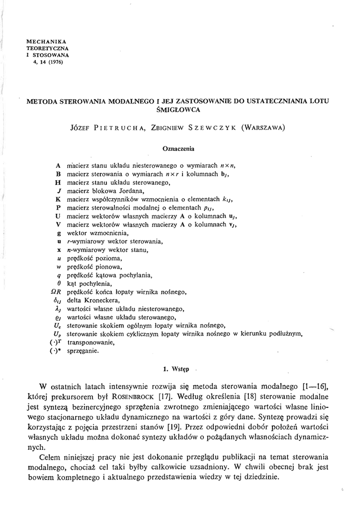 M E C H A N I K A T E O R E T Y C Z N A I S T O S O W A N A 4, 14 (1976) M E T O D A S T E R O W A N I A M O D A L N E G O I J E J Z A S T O S O W A N I E D O U S T A T E C Z N I A N I A L O T U Ś M I G Ł O W CA JÓZEF P I E T R U C H A , ZBIGNIEW S Z E W C Z Y K (WARSZAWA) Oznaczenia A В H J macierz stanu układu niesterowanego o wymiarach nxn, macierz sterowania o wymiarach n x r i kolumnach bj, macierz stanu układu sterowanego, macierz blokowa Jordana, К macierz współczynników wzmocnienia o elementach к ц , P macierz sterowalnoś ci modalnej o elementach р ц , U macierz wektorów własnych macierzy A o kolumnach U j , V macierz wektorów własnych macierzy A o kolumnach \j, g u x и w q 0 QR 6,j Xj Qj U U () (• *