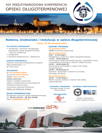XIX MIĘDZYNARODOWA KONFERENCJA OPIEKI DŁUGOTERMINOWEJ Rodzina, środowisko i instytucja w opiece długoterminowej Toruń, 27-29 września 2016 DO UDZIAŁU ZAPRASZAMY dyrektorów i personel zarządzający placówkami opieki długoterminowej i pomocy społecznej pielęgniarki personel terapeutyczny i opiekuńczy RAMOWY PROGRAM 27 września 2016 18:00 Uroczysta inauguracja 28 września 2016 9:00 – 11:00 Sesja I Współpraca z rodziną w opiece długoterminowej 11:30 – 13:00 Sesja II MIEJSCE KONFERENCJI Centrum Kulturalno-Kongresowe Jordanki Aleja Solidarności 1-3 87-100 Toruń ZGŁOSZENIA do 16 września 2016 na stronie www.tdod.pl Opłata: 492 zł brutto Opłata obejmuje: udział w sesjach naukowych udział w wydarzeniach towarzyszących materiały konferencyjne wyżywienie podczas konferencji Opłata nie obejmuje noclegu BIURO KONFERENCYJNE Europejskie Centrum Opieki Długoterminowej tel. 56 612 35 83; 56 612 35 60 mail: [email protected] Koordynacja opieki nad osobą starszą i przewlekle chorą z perspektywy lokalnej w różnych krajach Europy 14:30 – 16:00 Sesja III Nowoczesne technologie w opiece nad osobą niesamodzielną 16:30 – 18:00 Sesja IV Żywienie i aktywność ruchowa w procesie zdrowego starzenia 29 września 2016 10:00 – 11:30 Sesja V Różne wymiary jakości w opiece nad osobą niesamodzielną PATRONAT HONOROWY Prezydent Miasta Torunia Michał Zaleski PATRONAT MERYTORYCZNY ORGANIZATOR Polskie Towarzystwo Opieki Długoterminowej
