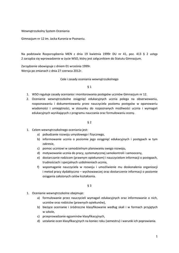 1 Wewnątrzszkolny System Oceniania Gimnazjum nr 12 im. Jacka
