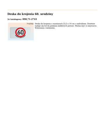 Deska do krojenia 60. urodziny Nr katalogowy: 090,71-2743 Deska do krojenia o wymiarach 23,5 x 14 cm z nadrukiem. Świetnie nadaje się też do podania niektórych potraw. Można myć w zmywarce. Wykonana z melaminy.