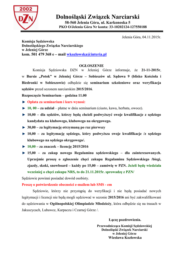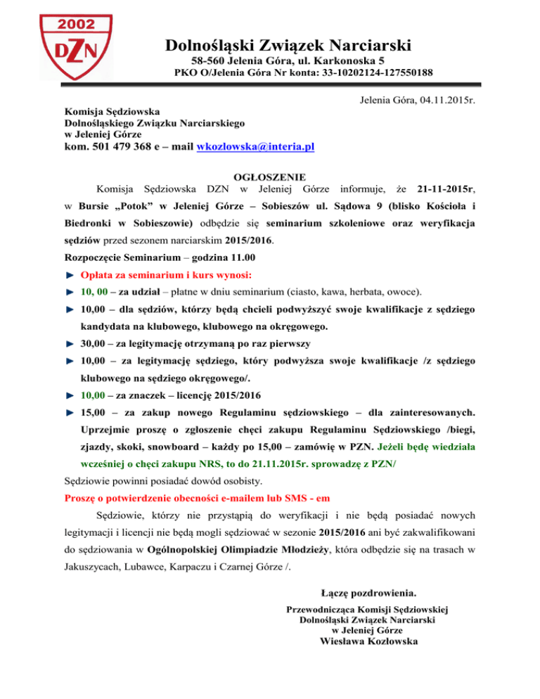 Dolnośląski Związek Narciarski 58-560 Jelenia Góra, ul. Karkonoska 5 PKO O/Jelenia Góra Nr konta: 33-10202124-127550188 Jelenia Góra, 04.11.2015r. Komisja Sędziowska Dolnośląskiego Związku Narciarskiego w Jeleniej Górze kom. 501 479 368 e – mail [email protected] OGŁOSZENIE Komisja Sędziowska DZN w Jeleniej Górze informuje, że 21-11-2015r, w Bursie „Potok” w Jeleniej Górze – Sobieszów ul. Sądowa 9 (blisko Kościoła i Biedronki w Sobieszowie) odbędzie się seminarium szkoleniowe oraz weryfikacja sędziów przed sezonem narciarskim 2015/2016. Rozpoczęcie Seminarium – godzina 11.00 Opłata za seminarium i kurs wynosi: 10, 00 – za udział – płatne w dniu seminarium (ciasto, kawa, herbata, owoce). 10,00 – dla sędziów, którzy będą chcieli podwyższyć swoje kwalifikacje z sędziego kandydata na klubowego, klubowego na okręgowego. 30,00 – za legitymację otrzymaną po raz pierwszy 10,00 – za legitymację sędziego, który podwyższa swoje kwalifikacje /z sędziego klubowego na sędziego okręgowego/. 10,00 – za znaczek – licencję 2015/2016 15,00 – za zakup nowego Regulaminu sędziowskiego – dla zainteresowanych. Uprzejmie proszę o zgłoszenie chęci zakupu Regulaminu Sędziowskiego /biegi, zjazdy, skoki, snowboard – każdy po 15,00 – zamówię w PZN. Jeżeli będę wiedziała wcześniej o chęci zakupu NRS, to do 21.11.2015r. sprowadzę z PZN/ Sędziowie powinni posiadać dowód osobisty. Proszę o potwierdzenie obecności e-mailem lub SMS - em Sędziowie, którzy nie przystąpią do weryfikacji i nie będą posiadać nowych legitymacji i licencji nie będą mogli sędziować w sezonie 2015/2016 ani być zakwalifikowani do sędziowania w Ogólnopolskiej Olimpiadzie Młodzieży, która odbędzie się na trasach w Jakuszycach, Lubawce, Karpaczu i Czarnej Górze /. Łączę pozdrowienia. Przewodnicząca Komisji Sędziowskiej Dolnośląski Związek Narciarski w Jeleniej Górze Wiesława Kozłowska