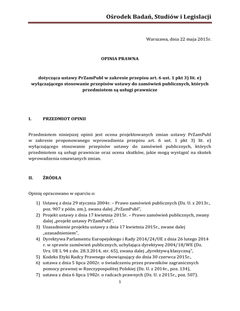 Ośrodek Badań, Studiów i Legislacji Warszawa, dnia 22 maja 2015r. OPINIA PRAWNA dotycząca ustawy PrZamPubl w zakresie przepisu art. 6 ust. 1 pkt 3) lit. e) wyłączającego stosowanie przepisów ustawy do zamówień publicznych, których przedmiotem są usługi prawnicze I. PRZEDMIOT OPINII Przedmiotem niniejszej opinii jest ocena projektowanych zmian ustawy PrZamPubl w zakresie proponowanego wprowadzenia przepisu art. 6 ust. 1 pkt 3) lit. e) wyłączającego stosowanie przepisów ustawy do zamówień publicznych, których przedmiotem są usługi prawnicze oraz ocena skutków, jakie mogą wystąpić na skutek wprowadzenia omawianych zmian. II. ŹRÓDŁA Opinię opracowano w oparciu o: 1) Ustawę z dnia 29 stycznia 2004r. – Prawo zamówień publicznych (Dz. U. z 2013r., poz. 907 z późn. zm.), zwana dalej „PrZamPubl”, 2) Projekt ustawy z dnia 17 kwietnia 2015r. – Prawo zamówień publicznych, zwany dalej „projekt ustawy PrZamPubl”, 3) Uzasadnienie projektu ustawy z dnia 17 kwietnia 2015r., zwane dalej „uzasadnieniem”, 4) Dyrektywa Parlamentu Europejskiego i Rady 2014/24/UE z dnia 26 lutego 2014 r. w sprawie zamówień publicznych, uchylająca dyrektywę 2004/18/WE (Dz. Urz. UE L 94 z dn. 28.3.2014, str. 65), zwana dalej „dyrektywą klasyczną”, 5) Kodeks Etyki Radcy Prawnego obowiązujący do dnia 30 czerwca 2015r., 6) ustawa z dnia 5 lipca 2002r. o świadczeniu przez prawników zagranicznych pomocy prawnej w Rzeczypospolitej Polskiej (Dz. U. z 2014r., poz. 134), 7) ustawa z dnia 6 lipca 1982r. o radcach prawnych (Dz. U. z 2015r., poz. 507). 1 Ośrodek Badań, Studiów i Legislacji III. STAN PRAWNY Ze względu na przyjecie nowych dyrektyw Parlamentu Europejskiego i Rady, w tym dyrektywy 2014/24/UE z dnia 26 lutego 2014 r. w sprawie zamówień publicznych, uchylającej dyrektywę 2004/18/WE (Dz. Urz. UE L 94 z 28.03.2014, str. 65), zwana dalej „dyrektywa klasyczna 2014/24/UE” oraz dyrektywy 2014/25/UE z dnia 26 lutego 2014 r. w sprawie udzielania zamówień przez podmioty działające w sektorach gospodarki wodnej, energetyki, transportu i usług pocztowych, uchylającej dyrektywę 2004/17/WE (Dz. Urz. UE L 94 z 28.03.2014, str. 243), zwana dalej „dyrektywa sektorowa 2014/25/UE”, koniecznym stało się implementowanie postanowień nowych aktów prawnych na gruncie prawa polskiego. Dotychczas system zamówień publicznych w Polsce kompleksowo regulowała ustawa z dnia 29 stycznia 2004r. – Prawo zamówień publicznych (Dz. U. z 2013r., poz. 907 z późn. zm.). Ponieważ jednak skala zmian systemu wprowadzona nowymi dyrektywami jest nazbyt duża, konieczne jest przygotowanie projektu nowej ustawy regulującej procedurę udzielania zamówień publicznych. Przygotowany przez Prezesa Urzędu Zamówień Publicznych projekt ustawy przewiduje szereg zmian, w tym również wyłączenie reżimu udzielania zamówień publicznych według przewidzianych w ustawie procedur wobec zamówień, których przedmiotem są usługi prawnicze. Proponowany przepis w tym zakresie brzmi następująco: Art. 6 ust. 1 pkt 3 lit. e) projektu ustawy PrZamPubl „Art. 6. 1.Przepisów ustawy nie stosuje się do: (…) 3) zamówień publicznych, których przedmiotem są: (…) e) usługi prawnicze: - zastępstwa procesowego wykonywanego przez adwokata, radcę prawnego lub prawnika, w rozumieniu ustawy z dnia 5 lipca 2002r. o świadczeniu przez prawników zagranicznych pomocy prawnej w Rzeczypospolitej Polskiej (Dz. U. z 2014r., poz. 134), w postępowaniu 2 Ośrodek Badań, Studiów i Legislacji arbitrażowym i pojednawczym, lub przed sądami, trybunałami lub innymi organami publicznymi państwa członkowskiego Unii Europejskiej, państw trzecich lub przed międzynarodowymi sądami, trybunałami, instancjami arbitrażowymi lub pojednawczymi, - doradztwa prawnego wykonywanego przez adwokata, radcę prawnego lub prawnika, w rozumieniu ustawy z dnia 5 lipca 2002r. o świadczeniu przez prawników zagranicznych pomocy prawnej w Rzeczypospolitej Polskiej (Dz. U. z 2014r., poz. 134), w zakresie przygotowania postępowań, o których mowa w tiret pierwszym, lub gdy zachodzi prawdopodobieństwo, że sprawa, której dotyczy to doradztwo, stanie się przedmiotem tych postępowań, - notarialnego poświadczania i uwierzytelniania dokumentów, - świadczone przez pełnomocników lub inne usługi prawnicze, których wykonawcy są wyznaczani przez sąd lub trybunał danego państwa członkowskiego Unii Europejskiej, lub wyznaczani z mocy prawa w celu wykonania konkretnych zadań pod nadzorem takich trybunałów lub sądów, - związane, nawet sporadycznie, z wykonywaniem władzy publicznej”. Należy w tym miejscu, poddać ocenie proponowane rozwiązanie pod kątem prawidłowości z przepisami nowej dyrektywy klasycznej oraz zastanowić się, jakie skutki za sobą może pociągać projektowana nowelizacja. Dotychczasowy stan prawny i obecna praktyka Usługi prawnicze również na gruncie obecnie obowiązujących przepisów podlegają specyficznemu reżimowi ustawy. Zgodnie z Rozporządzeniem Prezesa Rady Ministrów z dnia 28 stycznia 2010r. w sprawie wykazu usług o charakterze priorytetowym i niepriorytetowym (Dz. U. Nr 12, poz. 68) wydanym na podstawie upoważnienia wynikającego z art. 2a ustawy PrZamPubl, usługi prawnicze zostały zaliczone w poczet usług o charakterze niepriorytetowym. Analogicznie zostały zakwalifikowane usługi prawnicze w Rozporządzeniu Prezesa Rady Ministrów z dnia 3 grudnia 2012r. w sprawie wykazu usług w dziedzinach obronności i bezpieczeństwa o charakterze priorytetowym i niepriorytetowym. Przy czym oba akty prawne, określają charakter usług prawniczych poprzez odwołanie się do kodów CPV: od 79100000-5 do 79140000-7. 3 Ośrodek Badań, Studiów i Legislacji Mając na uwadze treść Rozporządzenia Komisji WE nr 213/2008 z dnia 28 listopada 2007 r. zmieniającego rozporządzenie (WE) nr 2195/2002 Parlamentu Europejskiego i Rady w sprawie Wspólnego Słownika Zam