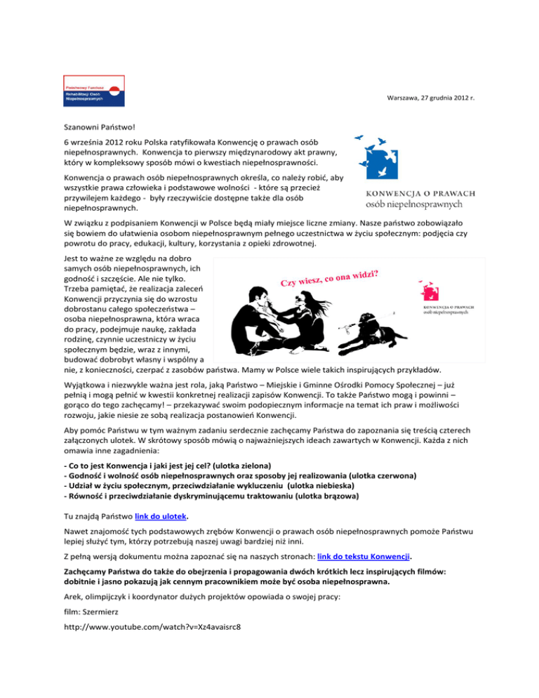 Warszawa, 27 grudnia 2012 r. Szanowni Paostwo! 6 września 2012 roku Polska ratyfikowała Konwencję o prawach osób niepełnosprawnych. Konwencja to pierwszy międzynarodowy akt prawny, który w kompleksowy sposób mówi o kwestiach niepełnosprawności. Konwencja o prawach osób niepełnosprawnych określa, co należy robid, aby wszystkie prawa człowieka i podstawowe wolności - które są przecież przywilejem każdego - były rzeczywiście dostępne także dla osób niepełnosprawnych. W związku z podpisaniem Konwencji w Polsce będą miały miejsce liczne zmiany. Nasze paostwo zobowiązało się bowiem do ułatwienia osobom niepełnosprawnym pełnego uczestnictwa w życiu społecznym: podjęcia czy powrotu do pracy, edukacji, kultury, korzystania z opieki zdrowotnej. Jest to ważne ze względu na dobro samych osób niepełnosprawnych, ich godnośd i szczęście. Ale nie tylko. Trzeba pamiętad, że realizacja zaleceo Konwencji przyczynia się do wzrostu dobrostanu całego społeczeostwa – osoba niepełnosprawna, która wraca do pracy, podejmuje naukę, zakłada rodzinę, czynnie uczestniczy w życiu społecznym będzie, wraz z innymi, budowad dobrobyt własny i wspólny a nie, z konieczności, czerpad z zasobów paostwa. Mamy w Polsce wiele takich inspirujących przykładów. Wyjątkowa i niezwykle ważna jest rola, jaką Paostwo – Miejskie i Gminne Ośrodki Pomocy Społecznej – już pełnią i mogą pełnid w kwestii konkretnej realizacji zapisów Konwencji. To także Paostwo mogą i powinni – gorąco do tego zachęcamy! – przekazywad swoim podopiecznym informacje na temat ich praw i możliwości rozwoju, jakie niesie ze sobą realizacja postanowieo Konwencji. Aby pomóc Paostwu w tym ważnym zadaniu serdecznie zachęcamy Paostwa do zapoznania się treścią czterech załączonych ulotek. W skrótowy sposób mówią o najważniejszych ideach zawartych w Konwencji. Każda z nich omawia inne zagadnienia: - Co to jest Konwencja i jaki jest jej cel? (ulotka zielona) - Godnośd i wolnośd osób niepełnosprawnych oraz sposoby jej realizowania (ulotka czerwona) - Udział w życiu społecznym, przeciwdziałanie wykluczeniu (ulotka niebieska) - Równośd i przeciwdziałanie dyskryminującemu traktowaniu (ulotka brązowa) Tu znajdą Paostwo link do ulotek. Nawet znajomośd tych podstawowych zrębów Konwencji o prawach osób niepełnosprawnych pomoże Paostwu lepiej służyd tym, którzy potrzebują naszej uwagi bardziej niż inni. Z pełną wersją dokumentu można zapoznad się na naszych stronach: link do tekstu Konwencji. Zachęcamy Paostwa do także do obejrzenia i propagowania dwóch krótkich lecz inspirujących filmów: dobitnie i jasno pokazują jak cennym pracownikiem może byd osoba niepełnosprawna. Arek, olimpijczyk i koordynator dużych projektów opowiada o swojej pracy: film: Szermierz http://www.youtube.com/watch?v=Xz4avaisrc8 Justyna, od ośmiu lat na odpowiedzialnym stanowisku, dzieli się entuzjazmem i siłą przebicia: film: Justyna http://www.youtube.com/watch?v=buxQwJBQChA Tyle przepisy i formalne zobowiązania. Jak zapisy Konwencji przełożą się na konkretne zachowania i postawy w codzienności Polaków? Byd może wskazówką będzie hasło przewodnie organizowanej przez Paostwowy Fundusz Rehabilitacji Osób Niepełnosprawnych kampanii informacyjnej dotyczącej Konwencji: Razem łatwiej. Zacznijmy zmiany. Paostwowy Fundusz Rehabilitacji Osób Niepełnosprawnych PS. Obecnie, w całym kraju, w związku z kampania informacyjną nt. Konwencji o prawach osób niepełnosprawnych ma miejsce wyjątkowa akcja. W największych miastach w Polsce powstają murale w mówiące o niepełnosprawności. Zapraszamy Paostwa do obejrzenia krótkiego materiału filmowego z akcji malowania murali promujących Konwencję w Gdyni link do filmu.