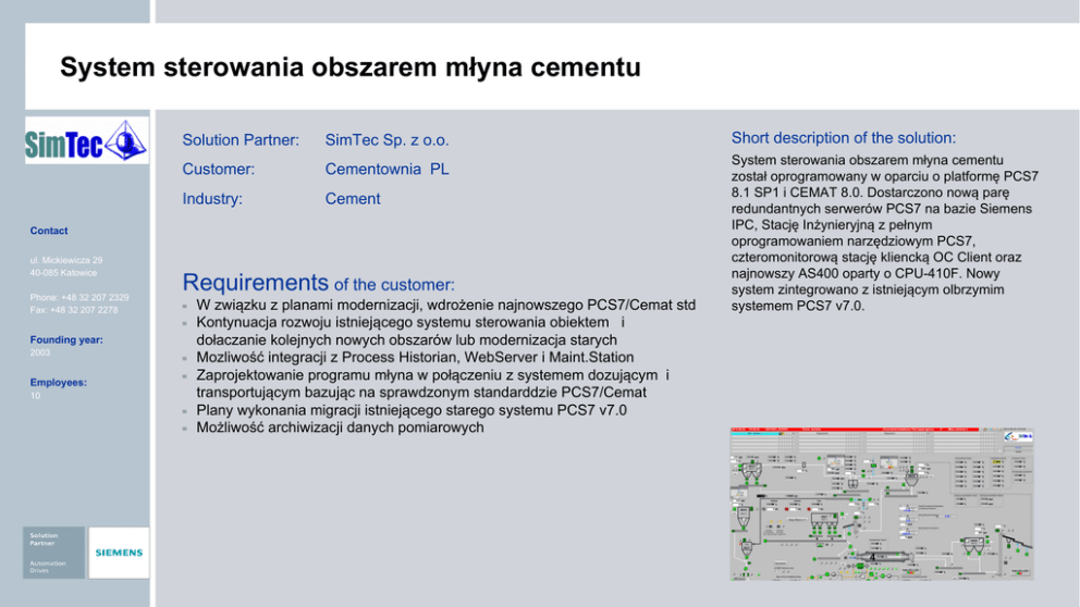 System sterowania obszarem młyna cementu Solution Partner: SimTec Sp. z o.o. Customer: Cementownia PL Industry: Cement Contact ul. Mickiewicza 29 40-085 Katowice Phone: +48 32 207 2329 Fax: +48 32 207 2278 Requirements of the customer: ▀ ▀ Founding year: 2003 Employees: ▀ ▀ 10 ▀ ▀ W związku z planami modernizacji, wdrożenie najnowszego PCS7/Cemat std Kontynuacja rozwoju istniejącego systemu sterowania obiektem i dołaczanie kolejnych nowych obszarów lub modernizacja starych Mozliwość integracji z Process Historian, WebServer i Maint.Station Zaprojektowanie programu młyna w połączeniu z systemem dozującym i transportującym bazując na sprawdzonym standarddzie PCS7/Cemat Plany wykonania migracji istniejącego starego systemu PCS7 v7.0 Możliwość archiwizacji danych pomiarowych Short description of the solution: System sterowania obszarem młyna cementu został oprogramowany w oparciu o platformę PCS7 8.1 SP1 i CEMAT 8.0. Dostarczono nową parę redundantnych serwerów PCS7 na bazie Siemens IPC, Stację Inżynieryjną z pełnym oprogramowaniem narzędziowym PCS7, czteromonitorową stację kliencką OC Client oraz najnowszy AS400 oparty o CPU-410F. Nowy system zintegrowano z istniejącym olbrzymim systemem PCS7 v7.0. System sterowania obszarem młyna cementu Implementation by the Solution Partner: ▀ ▀ ▀ Contact ul. Mickiewicza 29 40-085 Katowice Phone: +48 32 207 2329 Fax: +48 32 207 2278 Founding year: 2003 Employees: 10 ▀ Dostarczono najnowszą wersję standardów PCS7 i Cemat Dostarczono redundantny SRV, CPU-410F i ES&OS W programie zintegrowano dodatkowe biblioteki dla: falowników i soft starterów: Drive ES oraz Sirius Sirius Soft Starter Program obszaru młyna zintegrowano z programem transportu cementu do silosów w istniejącym na zakładzie PCS7 7.0 SP3 Benefits for the customer: ▀ ▀ ▀ ▀ ▀ ▀ Ulepszona diagnostyka blokad i napędów w odniesieniu do starszej wersji systemu na zakładzie Niższe koszty utrzymania obiektu Dłuższe wsparcie dla klienta producenta systemu Bezpieczeństwo, skalowalność i spójność systemu SUS - Siemens Update Service Nowe biblioteki DriveES dla integracji z najnowszymi napędami SINAMICS