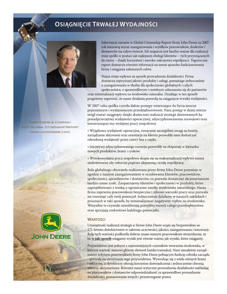 O siągnięcie t rwałe j w ydajności Informacje zawarte w Global Citizenship Report firmy John Deere za 2007 rok stanowią wyraz zaangażowania i wysiłków pracowników, dealerów i dostawców na całym świecie. Ich wsparcie jest bardzo ważne dla realizacji misji spółki w postaci jak najlepszej obsługi klientów – tych przywiązanych do ziemi – dzięki korzystnej i szeroko zakrojonej współpracy. Tegoroczny raport dostarcza również informacji na temat sposobu funkcjonowania firmy i osiągania założonych celów. Nasza misja wpływa na sposób prowadzenia działalności. Firma dostarcza najwyższej jakości produkty i usługi, pamiętając jednocześnie o zaangażowaniu w służbę dla społeczności globalnych i całych społeczeństw, o sprawiedliwym i rzetelnym odnoszeniu się do partnerów oraz minimalizacji wpływu na środowisko naturalne. Działając w ten sposób pragniemy zapewnić, że nasze działania pozwolą na osiągnięcie trwałej wydajności. From Deere & Company 2007 Global Citizenship Report (www.JohnDeere.com) W 2007 roku spółka czyniła dalsze postępy zmierzające do bycia jeszcze prężniejszym i wydajniejszym przedsiębiorstwem. Nasz postęp w dużej mierze mógł zostać osiągnięty dzięki skutecznej realizacji strategii skierowanych ku ponadprzeciętnej wydajności operacyjnej, zdyscyplinowanemu rozwojowi oraz towarzyszącej mu wydajnej pracy zespołowej. • Wyjątkowa wydajność operacyjna, zwracanie szczególnej uwagi na koszty, zarządzanie aktywami oraz orientacja na klienta pozwoliła nam dostarczać rekordową wydajność przez cztery lata z rzędu. • Inicjatywy zdyscyplinowanego rozwoju pozwoliły na ekspansję w kierunku nowych produktów, branż i rynków. • Wysokowydajna praca zespołowa skupia się na maksymalizacji wpływu naszej utalentowanej siły roboczej poprzez ulepszoną i ścisłą współpracę. Rola globalnego obywatela realizowana przez firmę John Deere pozostaje w zgodzie z naszym zaangażowaniem w oczekiwania klientów, pracowników, społeczności, sprzedawców i dostawców, co pozwala dostarczać akcjonariuszom bardzo cenne zyski. Zaopatrujemy klientów i społeczności w produkty, które zaprojektowano z troską o ograniczone zasoby środowiska naturalnego. Nasza firma zapewnia pracownikom bezpieczne i zdrowe warunki pracy oraz pozwala im rozwinąć cały swój potencjał. Jednocześnie działamy w naszych zakładach i procesach w taki sposób, by minimalizować negatywny wpływ na środowisko. Wszystkie te czynniki umożliwiają pomyślny rozwój całego przedsiębiorstwa oraz sprzyjają rozkwitowi ludzkiego potencjału. Wartości Umiejętność realizacji strategii w firmie John Deere wiąże się bezpośrednio ze 171-letnim dziedzictwem w zakresie uczciwości, jakości, zaangażowania i innowacji. Rolę tych wartości podkreśla dobrze znane naszym pracownikom stwierdzenie, że to, w jaki sposób osiągamy wyniki jest równie ważne, jak wyniki, które osiągamy. Przywództwo jest jednym z najważniejszych czynników tworzenia środowiska, w którym wartość stanowi główny element każdej transakcji. Nasz niezależny zarząd jestem jedynym pracownikiem firmy John Deere pełniącym funkcję członka zarządu - pozwala na utrzymanie tego przywództwa. Wywodząc się z wielu różnych branż i sektorów, ci dyrektorzy oferują korzystne doświadczenia i jednocześnie chronią interesy akcjonariuszy. Również nasze wytyczne prowadzenia działalności nakładają na pracowników i dostawców odpowiedzialność za sprawiedliwe prowadzenie działalności, poszanowanie innych i przestrzeganie prawa. Nasza misja Każda prowadzona na świecie działalność, której uczestnikiem jest firma John Deere, zmierza do poprawy wydajności, jednocześnie minimalizując wpływ wywierany na środowisko. Nasze ciągłe inwestycje w najwyższej klasy zakłady produkcyjne opierają się na kontroli wpływu na środowisko naturalne. Jeden z najnowszych zakładów firmy John Deere, fabryka traktorów w Czarnogórze w Brazylii nie uwalnia do środowiska odpadów płynnych i został zaprojektowany oraz zbudowany przy zastosowaniu reguł minimalnego zużycia energii. W 2007 roku rozpoczęliśmy starania o redukcję ilości uwalnianych gazów cieplarnianych, co stanowi część udziału firmy w programie U.S. Environmental Protection Agency’s Climate Leaders. W dalszym ciągu korzystamy również z alternatywnych źródeł energii, takich jak wiatr czy etanol. Zdrowie i bezpieczeństwo jest również priorytetem w zakładach John Deere, które należą do jednych z najbezpieczniejszych na świecie. W 2007 roku firma zredukowała swój i tak bardzo niski wskaźnik częstotliwości odnoszenia obrażeń ciała. W wielu lokalizacjach odnotowano miliony roboczogodzin bez żadnych obrażeń ciała. Produkty Produkty firmy John Deere znane są z wysokiej produktywności i wydajności. Firma inwestuje ponad 2 miliony dolarów dziennie w badania i rozwój, czego celem jest jeszcze większe skupienie się na naszych klientach. Przykład mogą stanowić precyzyjne technologie rolnicze minimalizujące wymagania w zakresie wkładu przy jednoczesnym wzroście produktywności. Produkty przeznaczone do uprawy ziemi ograniczają erozję gleby i zużycie energii. W większości silników stosowanych w ciężkim sprzęcie firmy John Deere dopuszczono możliwość używania 5% mieszanki paliwa typu biodiesel, przy czym nie ustajemy w naszych staraniach zmierzających do współpracy z grupami określającymi normy w celu jeszcze większego rozpowszechnienia paliwa biodiesel. Co więcej, nasza organizacja związana z systemami zasilania w firmie John Deere kontynuuje swoją 40-letnią pracę nad poprawą wydajności silników przy jednoczesnym ograniczeniu emisji spalin. Pracownicy Aby osiągnąć cel związany z budową przedsiębiorstwa tak wyjątkowego, jak jego produkty, polegamy na pracownikach z różnych branż na całym świecie i rozwijamy i