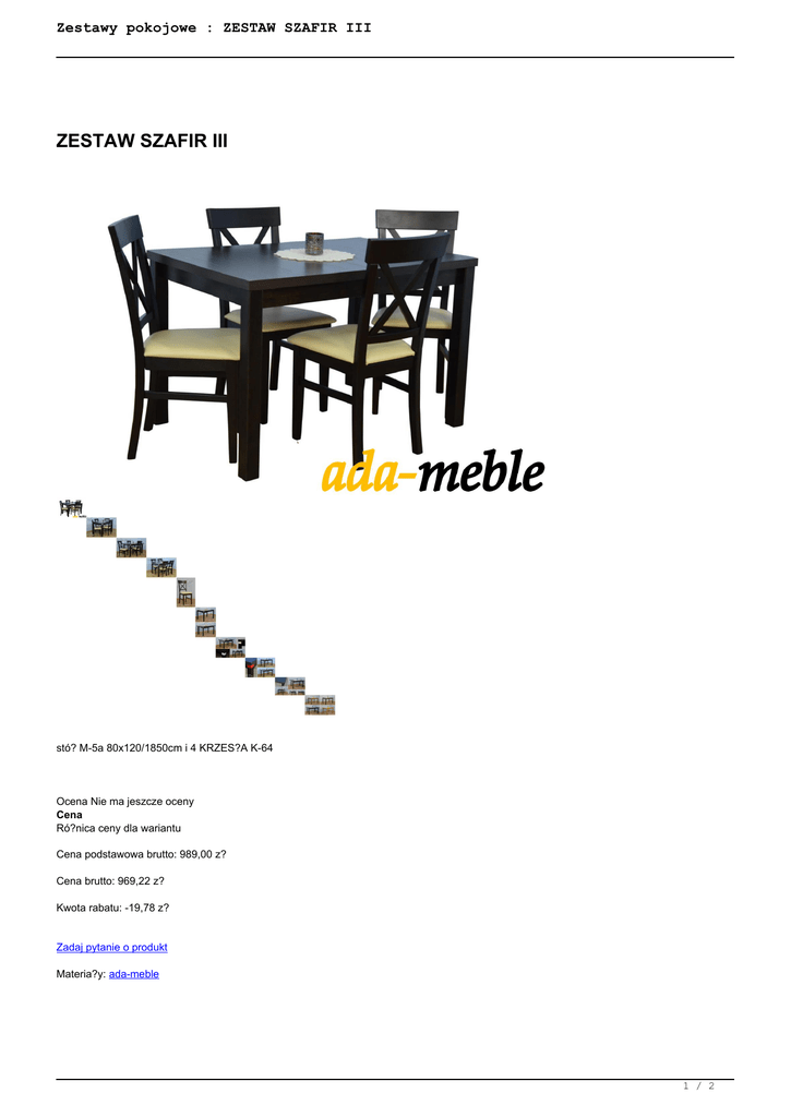 Zestawy pokojowe : ZESTAW SZAFIR III ZESTAW SZAFIR III stó? M-5a 80x120/1850cm i 4 KRZES?A K-64 Ocena Nie ma jeszcze oceny Cena Ró?nica ceny dla wariantu Cena podstawowa brutto: 989,00 z? Cena brutto: 969,22 z? Kwota rabatu: -19,78 z? Zadaj pytanie o produkt Materia?y: ada-meble 1 / 2 Zestawy pokojowe : ZESTAW SZAFIR III Szczegó?y produktu Stó? M-5a 80x120/150cm wykonany z drewna bukowego, blat sto?u z p?yty typu laminat. Blat LAMINAT - rozk?adany na ?o?yskowych prowadnicach. Podstawa wykonana z drewna bukowego. NOWOCZESNE APLIKACJE W KOLORZE SREBRNYM mo?liwe tak?e w kolorze czerwonym oraz bia?ym, mo?liwo?? zakupu sto?u bez aplikacji. BLAT O PODWY?SZONEJ ODPORNO?CI NA ZARYSOWANIA I DZIA?ANIE ALKOHOLU Wymiary sto?u: d?ugo?? sto?u 120cm /po roz?o?eniu 150cm x 70cm/; 1 wk?ad 30cm; szeroko?? blatu 80 / blat LAMINAT na ?o?yskowych prowadnicach; wysoko?? sto?u 76 cm; mo?liwo?? roz?o?enia sto?u: 1,20m; 1,50m; __________________________________________________ Krzes?o K-64 wykonane z drewna bukowego wysokogatunkowej bejcy i lakieru oraz zaawansowanej technologicznie ekoskóry i materia?ow. Wymiary krzes?a: wysoko?? krzes?a 93 cm; szeroko?? siedziska krzes?a 44 cm; wysoko?? siedziska krzes?a 46 cm. Recenzje Nikt jeszcze nie ocenia? tego produktu. 2 / 2 Powered by TCPDF (www.tcpdf.org)