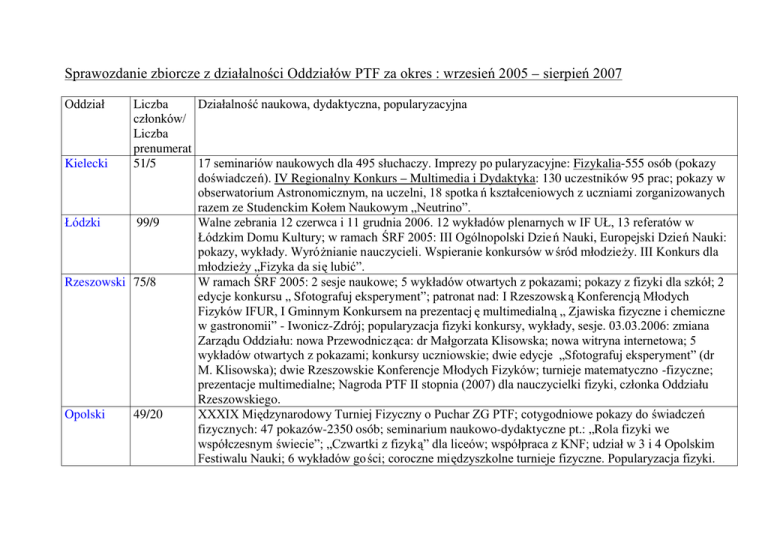 6SUDZR]GDQLH]ELRUF]H]G]LDáDOQRFL2GG]LDáyZ37)]DRNUHVZU]HVLH– VLHUSLH 2GG]LDá Liczba ']LDáDOQRüQDXNRZDG\GDNW\F]QDSRSXODU\]DF\MQD F]áRQNyZ Liczba prenumerat Kielecki 51/5 VHPLQDULyZQDXNRZ\FKGODVáXFKDF]\,PSUH]\SR pularyzacyjne: Fizykalia-555 osób (pokazy GRZLDGF]HIV Regionalny Konkurs – Multimedia i Dydaktyka: 130 uczestników 95 prac; pokazy w REVHUZDWRULXP$VWURQRPLF]Q\PQDXF]HOQLVSRWND NV]WDáFHQLRZ\FK]XF]QLDPL]RUJDQL]RZDQ\FK razem ze Studenckim KoáHP1DXNRZ\PÄ1HXWULQR´ àyG]NL 99/9 :DOQH]HEUDQLDF]HUZFDLJUXGQLDZ\NáDGyZSOHQDUQ\FKZ,)8àUHIHUDWyZZ àyG]NLP'RPX.XOWXU\ZUDPDFK5),,,2JyOQRSROVNL']LH 1DXNL(XURSHMVNL']LH1DXNL SRND]\Z\NáDG\:\Uy*QLDQLHQDXF]\FLHOL:VSLHUDQLHNRQNXUVyZZ UyGPáRG]LH*\,,,.RQNXUVGOD PáRG]LH*\Ä)L]\NDGDVL OXELü´ Rzeszowski 75/8 :UDPDFK5)VHVMHQDXNRZHZ\NáDGyZRWZDUW\FK]SRND]DPLSRND]\]IL]\NLGODV]Nyá edycje konkursu „ Sfotografuj eksperyment”SDWURQDWQDG,5]HV]RZVN .RQIHUHQFM0áRG\FK )L]\NyZ,)85,*PLQQ\P.RQNXUVHPQDSUH]HQWDFM PXOWLPHGLDOQÄ=MDZLVNDIL]\F]QHLFKHPLF]QH w gastronomii” - Iwonicz-=GUyMSRSXODU\]DFMDIL]\NLNRQNXUV\Z\NáDG\VHVMH]PLDQD =DU]GX2GG]LDáXQRZD3U]HZRGQLF]FDGU0DáJRU]DWD.OLVRZVNDQRZDZLWU\QDLQWHUQHWRZD Z\NáDGyZRWZDUW\FK]SRND]DPLNRQNXUV\XF]QLRZVNLHGZLHHG\FMHÄ6IRWRJUDIXMHNVSHU\PHQW´GU 0.OLVRZVNDGZLH5]HV]RZVNLH.RQIHUHQFMH0áRG\FK)L]\NyZWXUQLHMHPDWHPDW\F]QR -fizyczne; SUH]HQWDFMHPXOWLPHGLDOQH1DJURGD37),,VWRSQLDGODQDXF]\FLHONLIL]\NLF]áRQND2GG]LDáX Rzeszowskiego. Opolski 49/20 ;;;,;0L G]\QDURGRZ\7XUQLHM)L]\F]Q\R3XFKDU=*37)FRW\JRGQLRZHSRND]\GR ZLDGF]H fizycznych: 47 pokazów-2350 osób; seminarium naukowo-dydaktyczne pt.: „Rola fizyki we ZVSyáF]HVQ\PZLHFLH´Ä&]ZDUWNL]IL]\N´GODOLFHyZZVSyáSUDFD].1)XG]LDáZL2SROVNLP )HVWLZDOX1DXNLZ\NáDGyZJR FLFRURF]QHPL G]\V]NROQHWXUQLHMHIL]\F]QH3RSXODU\]DFMDIL]\NL TRUXVNL 97/17 &\NOZ\NáDGyZ]IL]\NL]SRND]DPLGODXF]QLyZJLPQD]MXPSWÄ6SRWNDQLD]IL]\N´– uczestnicy to 4000 uczniów. Dwa konkursy z fizyki dla klas gimnazjalnych: 1. 1800 uczniów ze 167 gimnazjów – 3 etapy – 16 laureatów 2. WU]\RVRERZ\FK]HVSRáyZ WQLRVHNRQDJURG 37)LP$3LHNDU\]DSUDF PJU Katowicki 114/20 Bydgoski 72/16 17 Konwersatoriów – ~1300 uczestników. 6WURQDLQWHUQHWRZD5)RNDUW\NXáyZSRS-QDXNRZ\FKJáSU]H]SURI-:DUF]HZVNLHJR .LONDQDFLHSRS–QDXNRZ\FKZ\NáDGyZZV]NRáDFKLZ\*V]\FKXF]HOQLDFK ,QWHUQHWRZHIRUXPG\VNXV\MQH2UJDQL]DFMDZLHOXV]NROQ\FKNRQNXUVyZ:\NáDG\Z5DGLX.DWRZLFH Ä6]NRáDEDUG]RZLHF]RURZD´&]áRQNRZLH2GG]LDáXXG]LHOLOLNLONXZ\ZLDGyZZ5DGLXL7HOHZL]ML DUW\NXá\Z*D]HFLH8QLZHUV\WHFNLHM8RUD]DUW\NXá\Z3RVW SDFK)L]\NLSURI-:DUF]HZVNL 2GG]LDáE\áZVSyáRUJDQL]DWRUHP]DLQLFMRZDQ\FKSU]H]SURI-:DUF]HZVNLHJRG\VNXVMLSDQHORZ\FK ;,,;,;,,,)8Ä2EOLF]D)L]\NL–PL G]\IDVF\QDFMDQLHSRNRMHP5ROD fizyki w rozwoju naszej cywilizacji i kultury.” 1D;;;9,,,=MH(G]LH)L]\NyZ3ROVNLFKSURI(=LSSHUZ\JáRVLáDZ\NáDGRQDQRUXUNDFK =LQVSLUDFMLSURI-:DUF]HZVNLHJR:RMFLHFK.LODUQDSLVDáÄ6LQIRQLDGHPRWX´3URI-:DUF]HZVNL MHVWUyZQLH*SU]HZRGQLF]F\P1DXNRZHJR.RPLWHWX'RUDGF]HJRRUD]F]áRQNLHP.RPLWHWX Organizacyjnego XXXIX Zjazdu Fizyków Polskich. Prof. J. Warczewski jako przedstawiciel PTF XF]HVWQLF]\áZ$XVWULLZ*UD])RUXP3K\VLFVDQG6RFLHW\JG]LHSU]HGVWDZLáGZDUHIHUDW\L]RVWDá sygnatariuszeP5H]ROXFMLL5HNRPHQGDFMLGOD5]GyZ8(LZLDWD &]áRQNRZLH2GG]LDáXXF]HVWQLF]ZSRND]DFKÄ2VREOLZRFLZLDWD)L]\NL´ZZ\NáDGDFK Ä=QDMOHSV]\PLSU]H]IL]\N ´RUD]ZMXU\Ä.RQNXUVX0áRG\FK)L]\NyZ´ &]áRQNRZLH2GG]LDáXZRUJDQDFKFHQtralnych PTF: SURI-:DUF]HZVNLF]áRQHNZ\NRQDZF]\3UH]\GLXP=DU]GX*áyZQHJR SURI-àXF]NDLSURI:=LSSHUF]áRQNRZLH6GX.ROH*HVNLHJR PJU8UV]XOD:R(QLNRZVND-Bezak- -SU]HZRGQLF]FD.RPLVML3RSXODU\]DFMLLSURPRFML)L]\NL 4. dr hab. Maci M0DND–F]áRQHN.RPLVML:\ERUF]HM 3ODQRZDQHF]WHU\Z\NáDG\QD;;;,;=MH(G]LH)L]\NyZ3ROVNLFKZ6]F]HFLQLH RWZDUW\FKZ\NáDGyZQDXNRZ\FK:RMHZyG]NL.RQNXUV)L]\F]Q\– 300 osób. 5 otwartych Z\NáDGyZSRSXODUQR-naukowych. Dwa pikniki naukowo-artystyczne –Z\NáDGyZLGRQLHVLH naukowych oraz koncert kwartetu fizyków. Forum Wiedzy interdyscyplinarnej. Planowane na XXXIX =MH(G]LHMHGHQZ\NáDGLGZDSRVWHU\ Krakowski 223/78 Zielono Górski 90/4 Lubelski 130/28 &] VWRFKRZV 69/10 ki Krakowskie Konwersatorium Fizyczne –Z\NáDGyZ.UDNRZVNLJarmark Fizyczny (28 – 30, IX, 2006). Reinhard Kulessa –SUH]HV37)6'XELHO+)LJLHO=*RáE-Meyer –F]á=DU]GX*áyZQHJR 37)$2OH–F]á6GX.ROH*HVNLHJR$=L ED*O.RPLVMD5HZL]\MQD37)0DáRSROVNL.RPLWHW 2OLPSLDG\)L]\F]QHM&Dá\V]HUHJkandydatów do nagród PTF w r. 2005, 2006 i 2007. Serwis www. -DUPDUN)L]\F]Q\2JyOQRSROVNL.RQNXUVQD'RZLDGF]HQLDSRND]RZH])L]\NL6HNFMD)L]\NL ;/,,;/,,,6HNFML.yá1DXNRZ\FK3LRQX+XWQLF]HJR$*+0DáRSROVNL.RQNXUV])L]\NLL$VWURQRPLL OgólnRSROVNLH6\PSR]MXPÄ)L]\NDZHNRQRPLLL1DXNDFK6SRáHF]Q\FK´2JyOQRSROVND6HVMD.yá 1DXNRZ\FK)L]\NyZ5y*QHG\QDPLF]QHIRUP\SRSXODU\]DFMLIL]\NLNRQNXUV\SRND]\Z\NáDG\HWF .RQNXUVÄ3URFHV\L]MDZLVNDIL]\F]QH]DFKRG]FHZNXFKQL´ILQDáXF]QLyZ'HEDWDÄ)L]\NDZ Uy*Q\FKG]LHG]LQDFK*\FLD´–XG]LDáJLPQD]MyZ=RND]ML5)ZV]NRáDFKLPSUH]\)HVWLZDO Nauki –XG]LDáXF]QLyZ–JLPQD]MyZ$NW\ZQDG]LDáDOQRü.RáD1DXNRZHJR37)W\WXá\ODXUHDWyZ uczniom, protesty przeFLZEá GQ\PWHVWRP &]WHU\RWZDUWHSRVLHG]HQLDQDXNRZH9,0L G]\QDURGRZD.RQIHUHQFMDÄ,RQ,PSODQWDWLRQDQG´ (Kazimierz Dolny) – 37 referatów plenarnych. I Lubelskie Sympozjum Nanotechnologii (Nano 2006) – UHIHUDWyZ8G]LDáZÄ3RND]DFh z Fizyki” w Rzeszowie – 5000 osób. 47 „Pokazy z Fizyki” 7 – 26 ZU]HQLDRVyE5RF]QLHUHGQLRRVyE=DSLV'9')LQDQVRZDQLHXG]LDáXZ .RQIHUHQFMDFKSURIHVRURZLGRNWRURZLLVWXGHQWRP.RQNXUVR1DJURG LP3URI:áRG]LPLHU]D)XND za pUDF GRNWRUVN-HWDSRZ\.RQNXUVÄ5RNSU]HGPDWXU´– 265 uczniów w 2006 roku i 431 uczniów w 2007 roku.&RURNODXUHDWyZLZ\Uy*QLH 'RGDWNRZHLPSUH]\Z\NáDG\ILOP\SRSXODUQRQDXNRZHSUHOHNFMLLSRND]\]IL]\NLGODV]Nyá/XEHOV]F]\]Q\ .UyWNLHOLF]QHVSRWNDQLD:\NRU]\VWDQLHPLHMVNLHJRNDQDáXLQIRUPDF\MQHJR1DNRQLHFURNXSODQRZDQH SRVLHG]HQLH=DU]GX2GG]LDáXSRáF]RQH]XURF]\VW\PSU]\M FLHPQRZ\FKF]áRQNyZ:\VWDZDÄ$OEHUW Einstein znany i nieznany gigant fizyki”:\NáDGSURI0DULDQD*áRZDFNLHJRR(LQVWHLQLHÄ']LH Nauki”: pokazy eksperymentów i zwiedzanie laboratoriów. Cotygodniowe pokazy dla uczniów. 2OLPSLDG