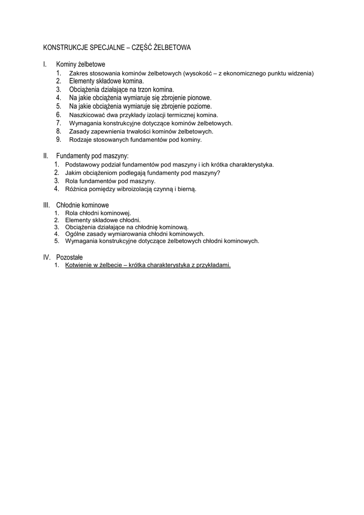 KONSTRUKCJE SPECJALNE – CZĘŚĆ ŻELBETOWA I. Kominy żelbetowe 1. Zakres stosowania kominów żelbetowych (wysokość – z ekonomicznego punktu widzenia) 2. Elementy składowe komina. 3. Obciążenia działające na trzon komina. 4. Na jakie obciążenia wymiaruje się zbrojenie pionowe. 5. Na jakie obciążenia wymiaruje się zbrojenie poziome. 6. Naszkicować dwa przykłady izolacji termicznej komina. 7. Wymagania konstrukcyjne dotyczące kominów żelbetowych. 8. Zasady zapewnienia trwałości kominów żelbetowych. 9. Rodzaje stosowanych fundamentów pod kominy. II. Fundamenty pod maszyny: 1. Podstawowy podział fundamentów pod maszyny i ich krótka charakterystyka. 2. Jakim obciążeniom podlegają fundamenty pod maszyny? 3. Rola fundamentów pod maszyny. 4. Różnica pomiędzy wibroizolacją czynną i bierną. III. Chłodnie kominowe 1. 2. 3. 4. 5. Rola chłodni kominowej. Elementy składowe chłodni. Obciążenia działające na chłodnię kominową. Ogólne zasady wymiarowania chłodni kominowych. Wymagania konstrukcyjne dotyczące żelbetowych chłodni kominowych. IV. Pozostałe 1. Kotwienie w żelbecie – krótka charakterystyka z przykładami.