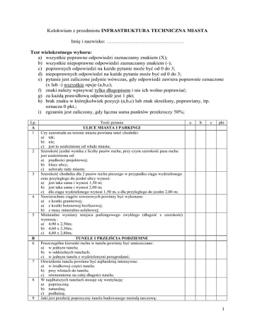 Kolokwium z przedmiotu INFRASTRUKTURA TECHNICZNA MIASTA Imię i nazwisko: ……………………………………… Test wielokrotnego wyboru: a) wszystkie poprawne odpowiedzi zaznaczamy znakiem (X); b) wszystkie niepoprawne odpowiedzi zaznaczamy znakiem (-); c) poprawnych odpowiedzi na każde pytanie może być od 0 do 3; d) niepoprawnych odpowiedzi na każde pytanie może być od 0 do 3; e) pytanie jest zaliczone jedynie wówczas, gdy odpowiedź zawiera poprawnie oznaczone (x lub -) wszystkie opcje (a,b,c); f) znaki należy wpisywać tylko długopisem i nie ich wolno poprawiać; g) za każdą prawidłową odpowiedź jest 1 pkt; h) brak znaku w którejkolwiek pozycji (a,b,c) lub znak skreślony, poprawiany, itp. oznacza 0 pkt.; i) egzamin jest zaliczony, gdy łączna suma punktów przekroczy 50%; Lp. A 1 2 3 4 5 B 6 7 8 9 Treść pytania ULICE MIASTA I PARKINGI Czy autostrada na terenie miasta powinna mieć chodniki: a) tak; b) nie; c) jest to uzależnione od władz miasta; Szerokość jezdni wynika z liczby pasów ruchu, przy czym szerokość pasa ruchu jest uzależniona od: a) prędkości projektowej; b) klasy ulicy; c) uchwały rady miasta; Szerokość chodnika dla 2 pasów ruchu pieszego w przypadku ciągu wydzielonego oraz przyległego do jezdni ulicy wynosi: a) jest taka sama i wynosi 1,50 m; b) jest taka sama i wynosi 2,00 m; c) dla ciągu wydzielonego wynosi 1,50 m, a dla przyległego do jezdni 2,00 m; Nawierzchnie ciągów rowerowych powinny być wykonane: a) z kostki granitowej; a) z kostki betonowej bezfazowej; b) z masy mineralno-asfaltowej; Minimalne wymiary miejsca parkingowego zwykłego (długość x szerokość) wynoszą : a) 4,90 x 2,50m; b) 4,60 x 2,30m; c) 4,80 x 2,80m; TUNELE I PRZEJŚCIA PODZIEMNE Poszczególne kierunki ruchu w tunelu powinny być umieszczane: a) w jednym tunelu; b) w oddzielnych tunelach; c) w jednym tunelu z wydzielonymi przegrodami; Oświetlenie tunelu powinno być najbardziej intensywne: a) w środkowej części tunelu; b) przy wlotach do tunelu; c) równomierne na całej długości tunelu; W najdłuższych tunelach stosuje się wentylację: a) poprzeczną; b) naturalną; c) podłużną; Jaki jest przekrój poprzeczny tunelu budowanego metodą tarczową: a b c pkt 1 10 C 11 12 13 14 15 D 16 17 18 19 20 E 21 22 a) w kształcie podkowy; b) kołowy; c) prostokątny; Najnowocześniejszym miejskim tunelem w Polsce jest tunel w: a) Warszawie; b) Gdańsku: c) Katowicach; KONSTRUKCJE OPOROWE W MIASTACH W konstrukcjach oporowych z gruntu zbrojonego istotnym elementem jest: a) rodzaj zasypki b) rodzaj zbrojenia; c) rozstaw warstw zbrojenia: Jakie materiały wykorzystuje się w budowie konstrukcji z gruntu zbrojonego? a) geosiatki; b) geotkaniny; c) płaskowniki stalowe lub taśmy z tworzywa; Do grupy konstrukcji oporowych typu odkształcalnego należą: a) ściany oporowe z grodzic stalowych; b) ściany kątowo-żebrowe; c) ściany szczelinowe; Przyczółki mostowe należą do grupy konstrukcji oporowych? a) tak; b) nie; c) tak, tylko w przypadku wiaduktów; W celu uzyskania większej stateczności wspornikowej konstrukcji oporowej wykonanej z grodzic stalowych można stosować: a) kotwy gruntowe; b) rozpory; c) spawanie w połączeniach sąsiednich elementów (grodzic); EKRANY AKUSTYCZNE Przykładowe czynniki wpływające na zwiększenie poziomu hałasu drogowego to: a) prędkość pojazdu; b) brak płynności ruchu pojazdów; c) rodzaj podłoża i konstrukcja podkładów; Maksymalne dopuszczalny poziom hałasu w dużym mieście zgodnie z Dyrektywą UE 2002/49/WE to: a) ok. 65dB; b) ok. 35dB; c) ok. 100dB; Elementy podstawowego rozwiązania konstrukcyjnego ekranu stanowią: a) pal fundamentowy i słupek; b) krzyżulec; c) wypełnienie i podwalina; Podstawowe sposoby ograniczania poziomu hałasu przy użyciu ekranów akustycznych realizowane są przez: a) pochłanianie; b) odbijanie; c) rezonans; Obciążenie ekranu akustycznego zlokalizowanego przy autostradzie stanowi: a) odśnieżanie; b) nierównomierne osiadanie; c) wiatr; OBIEKTY MOSTOWE W MIASTACH Główne funkcje mostów miejskich: a) komunikacyjna; b) mieszkalno – handlowa; c) promocyjna; Funkcja polityczna ważnych mostów miejskich polega na: a) demonstracji potęgi ekonomicznej; 2 23 24 25 b) demonstracji potęgi militarnej; c) demonstracji wysokiego poziomu technologicznego; Most Golden Gate jest symbolem: a) Los Angeles; b) San Francisco; c) Warszawy; Podstawowe cechy techniczne mostów miejskich: a) duża szerokość; b) duża rozpiętość przęseł; c) duża wysokość konstrukcyjna; Główne pozatechniczne cechy mostów miejskich to: a) specyficzne wyposażenie; b) estetyka: c) ograniczona ekspozycja w zabudowanym terenie; 3
