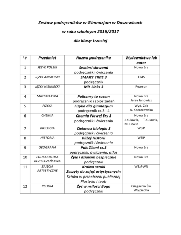 Zestaw podręczników w Gimnazjum w Daszewicach w roku szkolnym 2016/2017 dla klasy trzeciej l.p Przedmiot Nazwa podręcznika Wydawnictwo lub autor 1 JĘZYK POLSKI Nowa Era 2 JĘZYK ANGIELSKI 3 JĘZYK NIEMIECKI Swoimi słowami podręcznik i ćwiczenia SMART TIME 3 podręcznik Mit Links 3 4 MATEMATYKA Nowa Era Jerzy Janowicz 5 FIZYKA 6 CHEMIA Policzmy to razem podręcznik i zbiór zadań Fizyka dla gimnazjum podręcznik cz.3 i 4 Chemia Nowej Ery 3 podręcznik i ćwiczenia 7 BIOLOGIA 8 HISTORIA 9 GEOGRAFIA 10 EDUKACJA DLA BEZPIECZEŃSTWA 11 ZAJĘCIA ARTYSTYCZNE 12 RELIGIA Ciekawa biologia 3 podręcznik i ćwiczenia Bliżej Historii podręcznik i ćwiczenia Puls Ziemi cz.3 podręcznik, ćwiczenia, atlas Żyję i działam bezpiecznie podręcznik Kraina sztuki Zeszyty do zajęć artystycznych: Sztuka w przestrzeni publicznej Plastyka i teatr Żyć w miłości Boga podręcznik EGIS Pearson Wyd. Żak A. Kaczorowska Nowa Era J.Kulawik, T.Kulawik, M. Litwin WSiP WSiP Nowa Era Nowa Era WSzPWN Księgarnia Św. Wojciecha