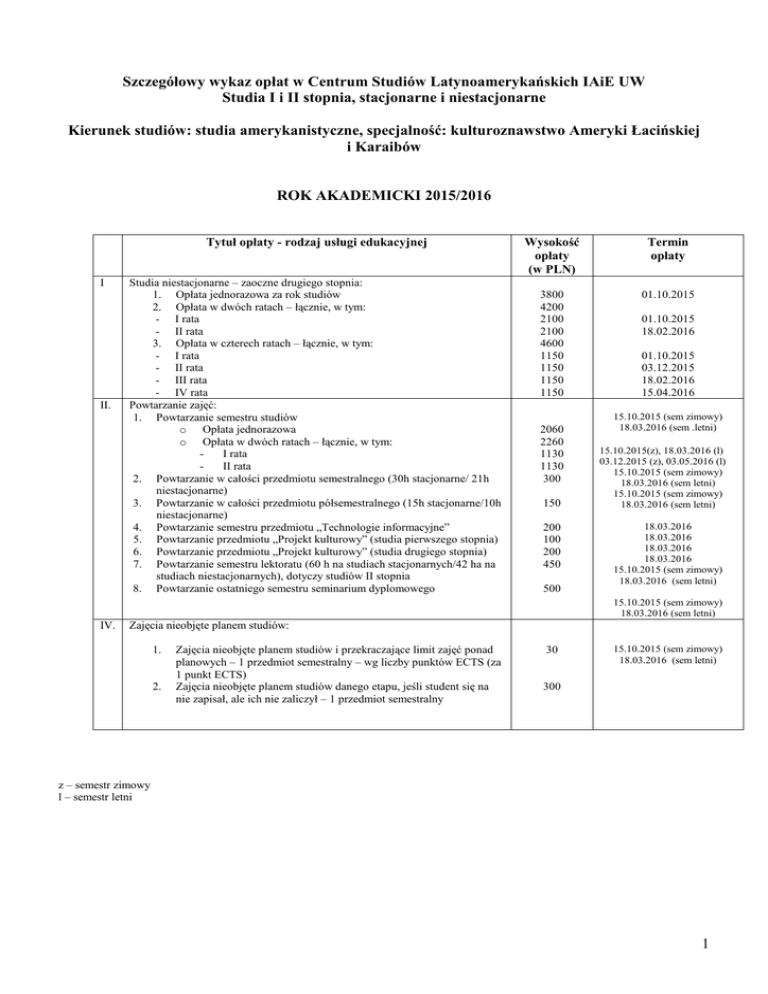 Szczegółowy wykaz opłat w Centrum Studiów Latynoamerykańskich IAiE UW Studia I i II stopnia, stacjonarne i niestacjonarne Kierunek studiów: studia amerykanistyczne, specjalność: kulturoznawstwo Ameryki Łacińskiej i Karaibów ROK AKADEMICKI 2015/2016 Tytuł opłaty - rodzaj usługi edukacyjnej I II. Studia niestacjonarne – zaoczne drugiego stopnia: 1. Opłata jednorazowa za rok studiów 2. Opłata w dwóch ratach – łącznie, w tym: - I rata - II rata 3. Opłata w czterech ratach – łącznie, w tym: - I rata - II rata - III rata - IV rata Powtarzanie zajęć: 1. Powtarzanie semestru studiów o Opłata jednorazowa o Opłata w dwóch ratach – łącznie, w tym: I rata II rata 2. Powtarzanie w całości przedmiotu semestralnego (30h stacjonarne/ 21h niestacjonarne) 3. Powtarzanie w całości przedmiotu półsemestralnego (15h stacjonarne/10h niestacjonarne) 4. Powtarzanie semestru przedmiotu „Technologie informacyjne” 5. Powtarzanie przedmiotu „Projekt kulturowy” (studia pierwszego stopnia) 6. Powtarzanie przedmiotu „Projekt kulturowy” (studia drugiego stopnia) 7. Powtarzanie semestru lektoratu (60 h na studiach stacjonarnych/42 ha na studiach niestacjonarnych), dotyczy studiów II stopnia 8. Powtarzanie ostatniego semestru seminarium dyplomowego Wysokość opłaty (w PLN) Termin opłaty 3800 4200 2100 2100 4600 1150 1150 1150 1150 01.10.2015 2060 2260 1130 1130 300 150 200 100 200 450 500 01.10.2015 18.02.2016 01.10.2015 03.12.2015 18.02.2016 15.04.2016 15.10.2015 (sem zimowy) 18.03.2016 (sem .letni) 15.10.2015(z), 18.03.2016 (l) 03.12.2015 (z), 03.05.2016 (l) 15.10.2015 (sem zimowy) 18.03.2016 (sem letni) 15.10.2015 (sem zimowy) 18.03.2016 (sem letni) 18.03.2016 18.03.2016 18.03.2016 18.03.2016 15.10.2015 (sem zimowy) 18.03.2016 (sem letni) 15.10.2015 (sem zimowy) 18.03.2016 (sem letni) IV. Zajęcia nieobjęte planem studiów: 1. 2. Zajęcia nieobjęte planem studiów i przekraczające limit zajęć ponad planowych – 1 przedmiot semestralny – wg liczby punktów ECTS (za 1 punkt ECTS) Zajęcia nieobjęte planem studiów danego etapu, jeśli student się na nie zapisał, ale ich nie zaliczył – 1 przedmiot semestralny 30 15.10.2015 (sem zimowy) 18.03.2016 (sem letni) 300 z – semestr zimowy l – semestr letni 1