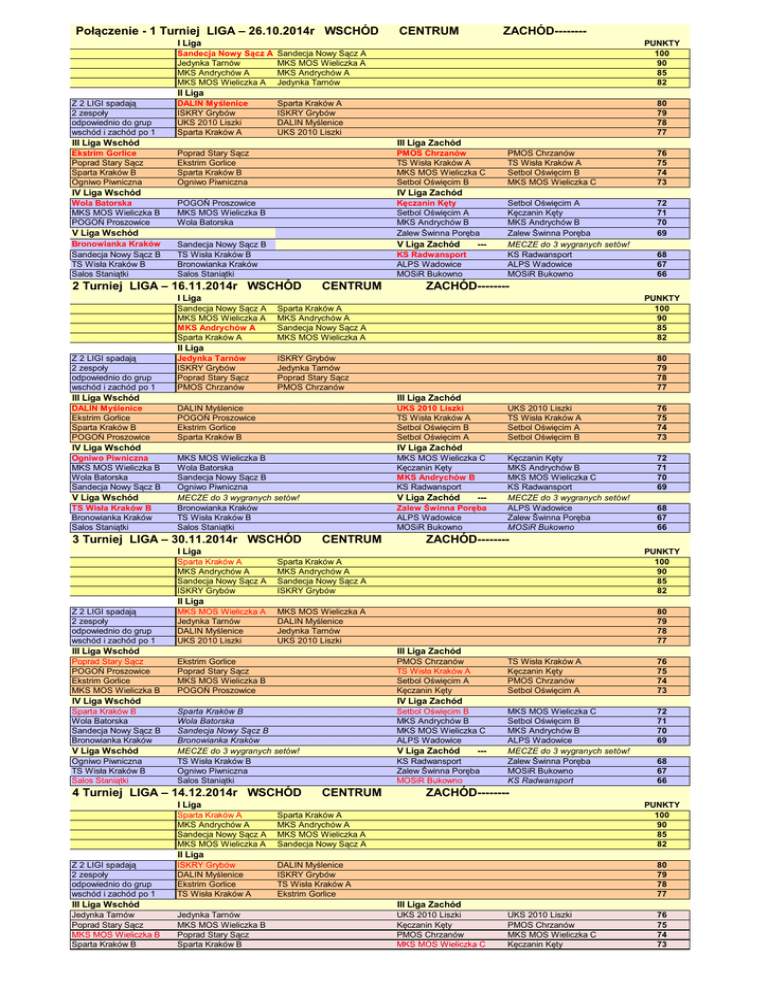 Połączenie - 1 Turniej LIGA – 26.10.2014r WSCHÓD CENTRUM ZACHÓD-------- I Liga Sandecja Nowy Sącz A Jedynka Tarnów MKS Andrychów A MKS MOS Wieliczka A PUNKTY 100 90 85 82 Sandecja Nowy Sącz A MKS MOS Wieliczka A MKS Andrychów A Jedynka Tarnów II Liga Z 2 LIGI spadają 2 zespoły odpowiednio do grup wschód i zachód po 1 DALIN Myślenice ISKRY Grybów UKS 2010 Liszki Sparta Kraków A Sparta Kraków A ISKRY Grybów DALIN Myślenice UKS 2010 Liszki III Liga Wschód Ekstrim Gorlice Poprad Stary Sącz Sparta Kraków B Ogniwo Piwniczna III Liga Zachód Poprad Stary Sącz Ekstrim Gorlice Sparta Kraków B Ogniwo Piwniczna PMOS Chrzanów TS Wisła Kraków A MKS MOS Wieliczka C Setbol Oświęcim B POGOŃ Proszowice MKS MOS Wieliczka B Wola Batorska Kęczanin Kęty Setbol Oświęcim A MKS Andrychów B Zalew Świnna Poręba IV Liga Wschód Wola Batorska MKS MOS Wieliczka B POGOŃ Proszowice PMOS Chrzanów TS Wisła Kraków A Setbol Oświęcim B MKS MOS Wieliczka C 76 75 74 73 Setbol Oświęcim A Kęczanin Kęty MKS Andrychów B Zalew Świnna Poręba MECZE do 3 wygranych setów! KS Radwansport ALPS Wadowice MOSiR Bukowno 72 71 70 69 IV Liga Zachód V Liga Wschód Bronowianka Kraków Sandecja Nowy Sącz B TS Wisła Kraków B Salos Staniątki 80 79 78 77 V Liga Zachód Sandecja Nowy Sącz B TS Wisła Kraków B Bronowianka Kraków Salos Staniątki --- KS Radwansport ALPS Wadowice MOSiR Bukowno 2 Turniej LIGA – 16.11.2014r WSCHÓD CENTRUM ZACHÓD-------- I Liga Sandecja Nowy Sącz A MKS MOS Wieliczka A MKS Andrychów A Sparta Kraków A 68 67 66 PUNKTY 100 90 85 82 Sparta Kraków A MKS Andrychów A Sandecja Nowy Sącz A MKS MOS Wieliczka A II Liga Z 2 LIGI spadają 2 zespoły odpowiednio do grup wschód i zachód po 1 Jedynka Tarnów ISKRY Grybów Poprad Stary Sącz PMOS Chrzanów ISKRY Grybów Jedynka Tarnów Poprad Stary Sącz PMOS Chrzanów III Liga Wschód DALIN Myślenice Ekstrim Gorlice Sparta Kraków B POGOŃ Proszowice III Liga Zachód DALIN Myślenice POGOŃ Proszowice Ekstrim Gorlice Sparta Kraków B UKS 2010 Liszki TS Wisła Kraków A Setbol Oświęcim B Setbol Oświęcim A MKS MOS Wieliczka B Wola Batorska Sandecja Nowy Sącz B Ogniwo Piwniczna MECZE do 3 wygranych setów! Bronowianka Kraków TS Wisła Kraków B Salos Staniątki MKS MOS Wieliczka C Kęczanin Kęty MKS Andrychów B KS Radwansport IV Liga Wschód Ogniwo Piwniczna MKS MOS Wieliczka B Wola Batorska Sandecja Nowy Sącz B V Liga Wschód TS Wisła Kraków B Bronowianka Kraków Salos Staniątki 80 79 78 77 UKS 2010 Liszki TS Wisła Kraków A Setbol Oświęcim A Setbol Oświęcim B 76 75 74 73 Kęczanin Kęty MKS Andrychów B MKS MOS Wieliczka C KS Radwansport MECZE do 3 wygranych setów! ALPS Wadowice Zalew Świnna Poręba MOSiR Bukowno 72 71 70 69 IV Liga Zachód 3 Turniej LIGA – 30.11.2014r WSCHÓD V Liga Zachód --- Zalew Świnna Poręba ALPS Wadowice MOSiR Bukowno CENTRUM ZACHÓD-------- I Liga Sparta Kraków A MKS Andrychów A Sandecja Nowy Sącz A ISKRY Grybów 68 67 66 Sparta Kraków A MKS Andrychów A Sandecja Nowy Sącz A ISKRY Grybów PUNKTY 100 90 85 82 MKS MOS Wieliczka A DALIN Myślenice Jedynka Tarnów UKS 2010 Liszki 80 79 78 77 II Liga Z 2 LIGI spadają 2 zespoły odpowiednio do grup wschód i zachód po 1 MKS MOS Wieliczka A Jedynka Tarnów DALIN Myślenice UKS 2010 Liszki III Liga Wschód Poprad Stary Sącz POGOŃ Proszowice Ekstrim Gorlice MKS MOS Wieliczka B III Liga Zachód Ekstrim Gorlice Poprad Stary Sącz MKS MOS Wieliczka B POGOŃ Proszowice PMOS Chrzanów TS Wisła Kraków A Setbol Oświęcim A Kęczanin Kęty Sparta Kraków B Wola Batorska Sandecja Nowy Sącz B Bronowianka Kraków MECZE do 3 wygranych setów! TS Wisła Kraków B Ogniwo Piwniczna Salos Staniątki Setbol Oświęcim B MKS Andrychów B MKS MOS Wieliczka C ALPS Wadowice IV Liga Wschód Sparta Kraków B Wola Batorska Sandecja Nowy Sącz B Bronowianka Kraków V Liga Wschód Ogniwo Piwniczna TS Wisła Kraków B Salos Staniątki TS Wisła Kraków A Kęczanin Kęty PMOS Chrzanów Setbol Oświęcim A 76 75 74 73 MKS MOS Wieliczka C Setbol Oświęcim B MKS Andrychów B ALPS Wadowice MECZE do 3 wygranych setów! Zalew Świnna Poręba MOSiR Bukowno KS Radwansport 72 71 70 69 IV Liga Zachód 4 Turniej LIGA – 14.12.2014r WSCHÓD V Liga Zachód --- KS Radwansport Zalew Świnna Poręba MOSiR Bukowno CENTRUM ZACHÓD-------- I Liga Sparta Kraków A MKS Andrychów A Sandecja Nowy Sącz A MKS MOS Wieliczka A 68 67 66 PUNKTY 100 90 85 82 Sparta Kraków A MKS Andrychów A MKS MOS Wieliczka A Sandecja Nowy Sącz A II Liga Z 2 LIGI spadają 2 zespoły odpowiednio do grup wschód i zachód po 1 ISKRY Grybów DALIN Myślenice Ekstrim Gorlice TS Wisła Kraków A III Liga Wschód Jedynka Tarnów Poprad Stary Sącz MKS MOS Wieliczka B Sparta Kraków B DALIN Myślenice ISKRY Grybów TS Wisła Kraków A Ekstrim Gorlice 80 79 78 77 III Liga Zachód Jedynka Tarnów MKS MOS Wieliczka B Poprad Stary Sącz Sparta Kraków B UKS 2010 Liszki Kęczanin Kęty PMOS Chrzanów MKS MOS Wieliczka C UKS 2010 Liszki PMOS Chrzanów MKS MOS Wieliczka C Kęczanin Kęty 76 75 74 73 IV Liga Wschód POGOŃ Proszowice Wola Batorska Sandecja Nowy Sącz B TS Wisła Kraków B IV Liga Zachód Sandecja Nowy Sącz B POGOŃ Proszowice Wola Batorska TS Wisła Kraków B Setbol Oświęcim A Setbol Oświęcim B MKS Andrychów B Zalew Świnna Poręba Bronowianka Kraków Ogniwo Piwniczna Salos Staniątki ALPS Wadowice MOSiR Bukowno KS Radwansport V Liga Wschód Bronowianka Kraków Ogniwo Piwniczna Salos Staniątki Setbol Oświęcim B Setbol Oświęcim A MKS Andrychów B Zalew Świnna Poręba 72 71 70 69 KS Radwansport ALPS Wadowice MOSiR Bukowno 68 67 66 V Liga Zachód 5 Turniej LIGA – 11.01.2015r WSCHÓD CENTRUM ZACHÓD-------- I Liga Sparta Kraków A MKS Andrychów A MKS MOS Wieliczka A DALIN Myślenice Sparta Kraków A MKS Andrychów A DALIN Myślenice MKS MOS Wieliczka A PUNKTY 100 90 85 82 Jedynka Tarnów Sandecja Nowy Sącz A ISKRY Grybów UKS 2010 Liszki 80 79 78 77 II Liga Z 2 LIGI