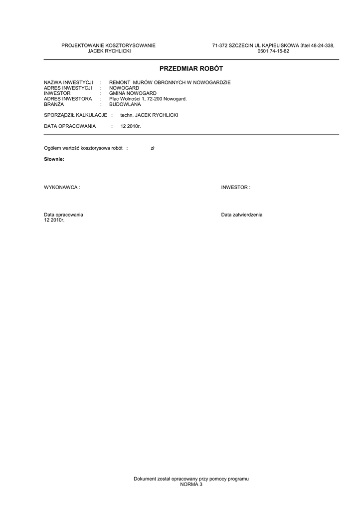PROJEKTOWANIE KOSZTORYSOWANIE JACEK RYCHLICKI 71-372 SZCZECIN UL KĄPIELISKOWA 3\tel 48-24-338, 0501 74-15-82 PRZEDMIAR ROBÓT NAZWA INWESTYCJI ADRES INWESTYCJI INWESTOR ADRES INWESTORA BRANśA : : : : : REMONT MURÓW OBRONNYCH W NOWOGARDZIE NOWOGARD GMINA NOWOGARD Plac Wolności 1, 72-200 Nowogard. BUDOWLANA SPORZĄDZIŁ KALKULACJE : techn. JACEK RYCHLICKI DATA OPRACOWANIA 12 2010r. : Ogółem wartość kosztorysowa robót : zł Słownie: WYKONAWCA : INWESTOR : Data opracowania 12 2010r. Data zatwierdzenia Dokument został opracowany przy pomocy programu NORMA 3 nowogardmuryobr KSIĄśKA PRZEDMIARÓW Lp. Podst Opis i wyliczenia 1 TZKNBK IV- Ręczne wydobycie z rumowiska no odcinku zwalonego muru kamieni granito547analog wych i ich oszyszczenie (przyjęto 30% kamieni do odzysku) 1.26*(2.16-1.07*0.50)*4.00*0.30 2 KNR 4-01 0316-10 3 KNR 4-01 0108-11 4 KNR 4-01 0108-12 5 KNR 4-01 0316-10 j.m. m3 m3 Uzupełnienie muru z kamienia z odzysku o grub.do ponad 70 cm lub zamurowa- m3 nie otworów na zaprawie cementowej 1.26*(2.16-1.07*0.50)*4.00*0.30 m3 Wywiezienie gruzu spryzmowanego(kamień granitowy) samochodami samowyła- m3 dowczymi na odl.do 1 km 1.26*(2.16-1.07*0.50)*4.00-2.46 m3 Wywiezienie gruzu spryzmowanego samochodami samowyładowczymi - za kaŜ- m3 dy nast. 1 km krotność 24 5.73 m3 Uzupełnienie ścian z kamienia granitowego o grub.do ponad 70 cm na zaprawie m3 np.firmy Atlas Złoty Wiek CG-05 (zuŜycie 1,60kg na 1dm3) 6.0*2.20*1.00 m3 6 KALK. INDY- Przygotowanie podłoŜa - usunięcie porostów z kirzeniami z powirezchni korony m2 WID murów. Przyjęto powierzchnię porośniętą w ilośc 10% całkowitej powierzchni korony muru. (81.96+96.90-4.00+87.97+94.47+52.75)*1.0*0.10 m2 7 KALK. INDY- Przygotowanie podłoŜa - usunięcie porostów z kirzeniami z powirezchni piono- m2 WID wych murów. Przyjęto powierzchnię porośniętą w ilośc 10% całkowitej powierzchni pionowej muru. 410.05*2*2.56*0.10 m2 8 KALK. INDY- Zmycie wodą z dodatkiem roztworu Pleśniotoks powierzchni muru(obustronnie) WID zagrzybionej, po usunięciu porostów i z podejrzeniem występowania grzybów Przyjęto 30% powierzchni całkowitej murów 414.04*2.56*0.30 11 KNR 0-26 0102-03 12 KNR 2-02 1612-01 13 Izolowanie obiektów elastyczną powłoką cementowo o grubości 2mm-cała powierzchnia korony muru np zaprawa Woder S firmy Atlas (81.96+96.90-4.00+87.97+94.47+52.75)*0.90 m2 2.46 RAZEM 2.46 2.46 RAZEM 2.46 5.73 RAZEM 5.73 5.73 RAZEM 5.73 13.20 RAZEM 13.20 41.01 RAZEM 41.01 209.95 RAZEM 209.95 317.98 RAZEM 317.98 55.90 RAZEM 55.90 369.05 RAZEM 369.05 423.98 RAZEM 423.98 1681.00 RAZEM 1681.00 m2 m2 Spoinowanie murów z kamienia łamanego. Przyjęto powierzchni umru do uzupeł-m2 nienia w spoinowaniu muru w ilości 20% całkowitej powierzchni muru np. zaprawa złoty wiek FG-05 Wyszczególnienie robót: 1. Wykucie spoin na głębokość 2 cm, 2. Oczyszczenie spoin i ściany szczotką stalową i spręŜonym powietrzem, 3. ZwilŜenie podłoŜa, 4. Wypełnienie zaprawą i uformowanie spoiny, 5. Oczyszczenie miejsca pracy i usunięcie odpadów 414.04*2.56*2*0.20 m2 Rusztowania ramowe warszawskie 4 m m2 414.04*(2.56+1.50) m2 Czas pracy rusztowań grupy 1 pozycje 5, 6, 7, 9, 10, 11 r-g RAZEM -2- Norma 3.10 Licencja: 10447 dla Projektowania Kosztorysowanie Jadek Rychlicki Razem m2 9 TZKNBK VIII Uzupełnienie ubytków szlichty cementowej na koronie muru z zaprawy np. firmy m2 02-39analog Atlas Ten 10. Przejęto powierzchnię ubytków w ilości 15% powierzchni całkowitej korony muru. 414.04*0.90*0.15 m2 10 KNR 0-26 0302-01 Poszcz 0.00 nowogardmuryobr Lp. ZESTAWIENIE MATERIAŁÓW Nazwa 1. gwoździe budowlane okrągłe gołe 2. piasek do zapraw 3. kamień granitowy 4. cement portlandzki zwykły bez dodatków '35' 5. zaprawa Złoty Wiek CG-05 6. bale iglaste obrzynane gr. 50 mm kl.II 7. deski iglaste obrzynane gr. 25 mm kl.II 8. płyty pomostowe długie 9. woda z rurociągu 10. zaprawa Atlas Woder S 11. zaprawa złoty wiek FG-05 12. zaprawa Atlas Ten 10 13. materiały pomocnicze Jm kg m3 m3 kg kg m3 m3 m2 m3 kg kg kg zł Ilość 16.3067 0.9519 15.1800 197.7805 2117.2805 1.4793 0.0841 35.6372 0.2500 1107.1495 1271.9394 3354.0000 Il inw. Il wyk. Cena jedn. 16.3067 0.9519 15.1800 197.7805 2117.2805 1.4793 0.0841 35.6372 0.2500 1107.1495 1271.9394 3354.0000 RAZEM Słownie: -3- Norma 3.10 Licencja: 10447 dla Projektowania Kosztorysowanie Jadek Rychlicki Wartość Grupa nowogardmuryobr ZESTAWIENIE SPRZĘTU Lp. Nazwa 1. spręŜarka powietrza 0,2-0,40 m3/min 2. samochód samowyładowczy do 5 t 3. betoniarka wolnospadowa elektryczna 4. rusztowanie ramowe warszawskie 5. czas pracy rusztowania 6. mieszadło do zapraw 7. Ŝurawik okienny Jm m-g m-g m-g m-g m-g m-g m-g Ilość 84.7961 5.6154 6.5765 281.7355 446.1441 4580.3004 137.0018 Cena jedn. RAZEM Słownie: -4- Norma 3.10 Licencja: 10447 dla Projektowania Kosztorysowanie Jadek Rychlicki Wartość nowogardmuryobr Lp. 1. robocizna ZESTAWIENIE ROBOCIZNY Nazwa Jm r-g Ilość 2611.0055 Cena jedn. RAZEM Słownie: -5- Norma 3.10 Licencja: 10447 dla Projektowania Kosztorysowanie Jadek Rychlicki Wartość