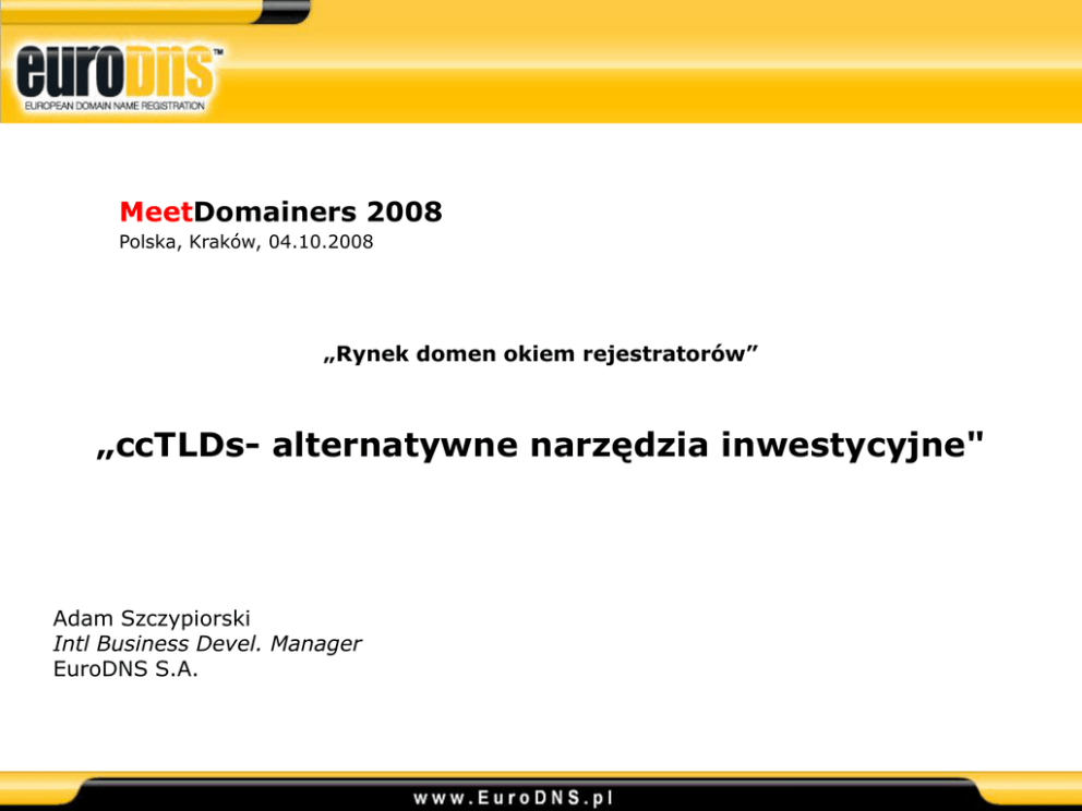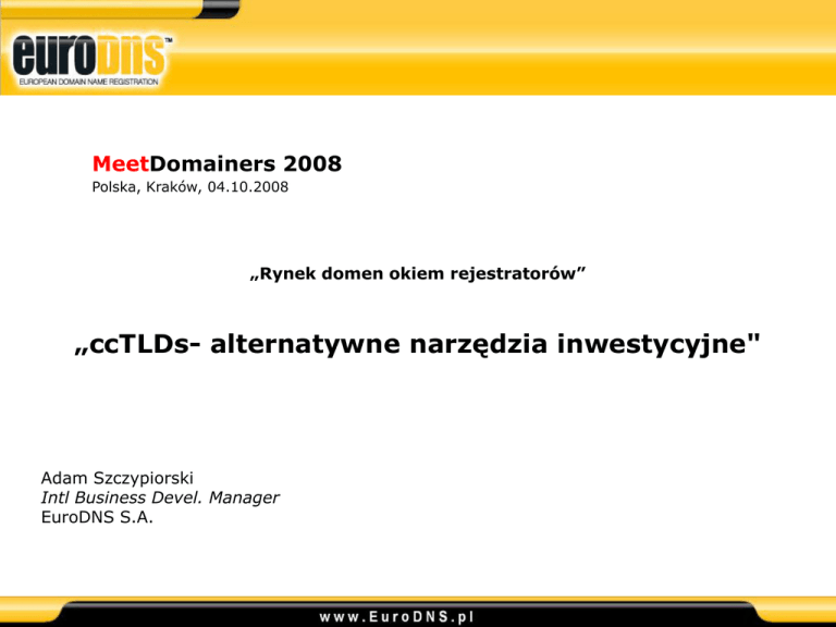 MeetDomainers 2008 Polska, Kraków, 04.10.2008 „Rynek domen okiem rejestratorów” „ccTLDs- alternatywne narzędzia inwestycyjne" Adam Szczypiorski Intl Business Devel. Manager EuroDNS S.A. EuroDNS overview akredytowany Registrar ICANN możliwość rejestracji ponad 100 TLD ~0,61 mln domen zarejestrowanych na całym świecie siedziba główna – Luxembourg, lokalne oddziały we Francji, Niemczech, Holandii, Polsce, Danii, USA i Korei solidne podstawy finansowe spółki EuroDNS – Luxembourg Data Center Group marki EuroDNS – EuroDNS.com, AsiaDNS.asia, LatDNS.com, WhoIS.de, Domain.CO.NL .pl .es .cz .be .lt .lv .sk .at ... .de .co.uk .nl dobre domeny już zajęte rozwinięty rynek aftermarket wysoka świadomość znaczenia domen wśród przedsiębiorców wysokie wartości domen (na zasadzie prawa podaży/popytu) najlepsze domeny zajęte, ale ... rozwój lokalnych usług rynku wtórnego niska, ale rosnąca (przykład: sukces .eu) świadomość znaczenia domen wśród przedsiębiorców niższa wartość niż wśród TOP ccTLD, ale ze znacznie większym potencjałem wzrostów Czy na pewno warto inwestować w domeny narodowe? Udział gTLD względem ccTLD w poszczególnych krajach [%] Ilość rejestracji gTLD względem ccTLD w liczbach Źródło: Verisign Czy .com to nadal dobra inwestycja? Całościowy podział rynku domen Nowe TLD = nowe możliwości inwestycji aukcje .ASIA z Sunrise i Landrush = $ 7,2 MLN .CO.NL – już ponad 30 akredytowanych Registrarów W jakich obszarach TLD spodziewane są najwyższe stopy zwrotu z inwestycji? ccTLD rynków rozwijających się, głównie Europy Wschodniej, tj. Polska, Czechy, Litwa oraz regionu Azji – obecnej potęgi gospodarczej świata domeny gTLD podkreślające regionalne centrum interesów - .EU, .ASIA Dlaczego? powszechny i tani dostęp do Internetu coraz większe przekonanie społeczeństwa do transakcji internetowych działy sprzedaży internetowej w firmach realizujących dotychczas tylko transakcje materialne wzrost wydatków na reklamę w Internecie podstawa biznesu: lokalizacja = domena Podstawowe zasady domenowych inwestycji: dywersyfikacja portfela – rejestruj różne ccTLD/TLD analiza techniczna - .com to giełdowy „byk”, wymaga doświadczenia, szukaj „niedźwiedzi” monitorowanie rynku – lekceważenie nowych TLD, to lekceważenie szansy zysku poznaj różnice w sposobie korzystania z domen w Europie i Europie Wschodniej Jak bezpiecznie i opłacalnie utrzymywać domeny: akredytowani Registrarzy ICANN – gwarancja solidności, ograniczenie ryzyka utrzymuj domeny u możliwie najmniejszej ilości Registrarów – to ułatwia zarządzanie oczekuj stałych, jednolitych stawek – promocje i regulaminy promocji zawsze oznaczają ...brak promocji kontaktuj się z managerami Registrarów, bądź pewien, że Twój Registrar nie jest tylko panelem online Dziękuję za uwagę! Contact: Adam Szczypiorski [email protected] www.EuroDNS.com