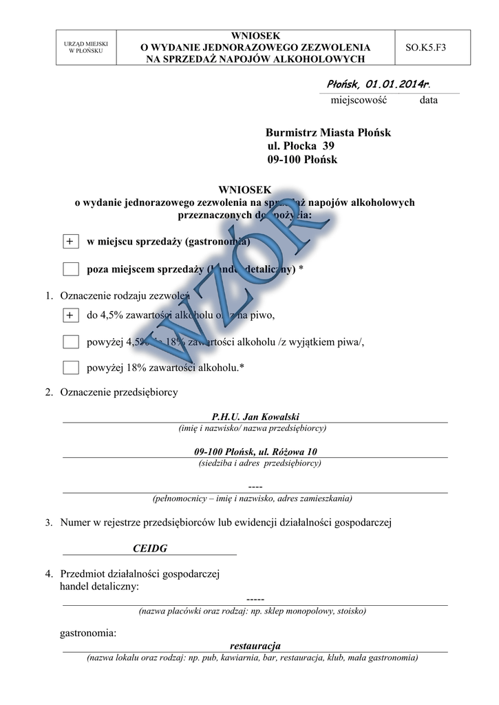 URZĄD MIEJSKI W PŁOŃSKU WNIOSEK O WYDANIE JEDNORAZOWEGO ZEZWOLENIA NA SPRZEDAŻ NAPOJÓW ALKOHOLOWYCH SO.K5.F3 Płońsk, 01.01.2014r. miejscowość data Burmistrz Miasta Płońsk ul. Płocka 39 09-100 Płońsk WNIOSEK o wydanie jednorazowego zezwolenia na sprzedaż napojów alkoholowych przeznaczonych do spożycia: + w miejscu sprzedaży (gastronomia) poza miejscem sprzedaży (handel detaliczny) * 1. Oznaczenie rodzaju zezwoleń + do 4,5% zawartości alkoholu oraz na piwo, powyżej 4,5% do 18% zawartości alkoholu /z wyjątkiem piwa/, powyżej 18% zawartości alkoholu.* 2. Oznaczenie przedsiębiorcy P.H.U. Jan Kowalski (imię i nazwisko/ nazwa przedsiębiorcy) 09-100 Płońsk, ul. Różowa 10 (siedziba i adres przedsiębiorcy) ---(pełnomocnicy – imię i nazwisko, adres zamieszkania) 3. Numer w rejestrze przedsiębiorców lub ewidencji działalności gospodarczej CEIDG 4. Przedmiot działalności gospodarczej handel detaliczny: ----(nazwa placówki oraz rodzaj: np. sklep monopolowy, stoisko) gastronomia: restauracja (nazwa lokalu oraz rodzaj: np. pub, kawiarnia, bar, restauracja, klub, mała gastronomia) WNIOSEK O WYDANIE JEDNORAZOWEGO ZEZWOLENIA NA SPRZEDAŻ NAPOJÓW ALKOHOLOWYCH URZĄD MIEJSKI W PŁOŃSKU SO.K5.F3 5. Adres punktu składowania napojów alkoholowych (magazynu dystrybucyjnego) 09-100 Płońsk, ul. Czerwona 100 6. Numer identyfikacji podatkowej (NIP) 567-000-00-00 7. Proponowany termin ważności zezwolenia (wydawane na okres - do 2 dni) XX-XX-XXXX 8. Sprzedaż napojów alkoholowych odbędzie się podczas imprezy / liczba stoisk Xxxxxxxxxxxxxxxxxxxxxxxxxxxxxxxxxxxxxxxxxxxxxxxxxxxxxxxx stoisko 1 (nazwa i miejsce imprezy) 9. Oświadczam, że ww. impreza jest + nie jest* imprezą masową w rozumieniu ustawy o bezpieczeństwie imprez masowych z dnia 20 marca 2009 r. Jan Kowalski XXX-XXX-XXX Numer kontaktowy (za zgodą przedsiębiorcy) Podpis(y) DO WNIOSKU NALEŻY DOŁĄCZYĆ NASTĘPUJĄCE DOKUMENTY: zezwolenie na sprzedaż napojów alkoholowych wraz z potwierdzeniem dokonanej opłaty za ich korzystanie w roku bieżącym (nie dotyczy zezwoleń wydanych przez Burmistrza Miasta Płońsk), w przypadku ustanowienia pełnomocnika - dokument stwierdzający udzielenie pełnomocnictwa oraz dowód uiszczenia opłaty skarbowej w kwocie 17,00 zł, zgodnie z art. 4 ustawy z dnia 16 listopada 2006 r. o opłacie skarbowej, potwierdzenie uiszczenia opłaty za wydanie zezwolenia. Uwaga: * przy właściwym postawić „X”