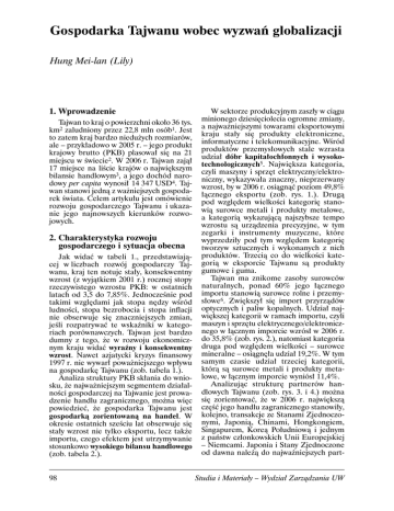 Gospodarka Tajwanu wobec wyzwañ globalizacji Hung Mei-lan (Lily) 1. Wprowadzenie Tajwan to kraj o powierzchni okoïo 36 tys. km2 zaludniony przez 22,8 mln osób1. Jest to zatem kraj bardzo nieduĝych rozmiarów, ale – przykïadowo w 2005 r. – jego produkt krajowy brutto (PKB) plasowaï siÚ na 21 miejscu w Ăwiecie2. W 2006 r. Tajwan zajÈï 17 miejsce na liĂcie krajów o najwiÚkszym bilansie handlowym3, a jego dochód narodowy per capita wynosiï 14 347 USD4. Tajwan stanowi jednÈ z waĝniejszych gospodarek Ăwiata. Celem artykuïu jest omówienie rozwoju gospodarczego Tajwanu i ukazanie jego najnowszych kierunków rozwojowych. 2. Charakterystyka rozwoju gospodarczego i sytuacja obecna Jak widaÊ w tabeli 1., przedstawiajÈcej w liczbach rozwój gospodarczy Tajwanu, kraj ten notuje staïy, konsekwentny wzrost (z wyjÈtkiem 2001 r.) rocznej stopy rzeczywistego wzrostu PKB: w ostatnich latach od 3,5 do 7,85%. JednoczeĂnie pod takimi wzglÚdami jak stopa nÚdzy wĂród ludnoĂci, stopa bezrobocia i stopa inflacji nie obserwuje siÚ znaczniejszych zmian, jeĂli rozpatrywaÊ te wskaěniki w kategoriach porównawczych. Tajwan jest bardzo dumny z tego, ĝe w rozwoju ekonomicznym kraju widaÊ wyraěny i konsekwentny wzrost. Nawet azjatycki kryzys finansowy 1997 r. nie wywarï powaĝniejszego wpïywu na gospodarkÚ Tajwanu (zob. tabela 1.). Analiza struktury PKB skïania do wniosku, ĝe najwaĝniejszym segmentem dziaïalnoĂci gospodarczej na Tajwanie jest prowadzenie handlu zagranicznego, moĝna wiÚc powiedzieÊ, ĝe gospodarka Tajwanu jest gospodarkÈ zorientowanÈ na handel. W okresie ostatnich szeĂciu lat obserwuje siÚ staïy wzrost nie tylko eksportu, lecz takĝe importu, czego efektem jest utrzymywanie stosunkowo wysokiego bilansu handlowego (zob. tabela 2.). 98 W sektorze produkcyjnym zaszïy w ciÈgu minionego dziesiÚciolecia ogromne zmiany, a najwaĝniejszymi towarami eksportowymi kraju staïy siÚ produkty elektroniczne, informatyczne i telekomunikacyjne. WĂród produktów przemysïowych stale wzrasta udziaï dóbr kapitaïochïonnych i wysokotechnologicznych5. NajwiÚksza kategoria, czyli maszyny i sprzÚt elektryczny/elektroniczny, wykazywaïa znaczny, nieprzerwany wzrost, by w 2006 r. osiÈgnÈÊ poziom 49,8% ïÈcznego eksportu (zob. rys. 1.). DrugÈ pod wzglÚdem wielkoĂci kategoriÚ stanowiÈ surowce metali i produkty metalowe, a kategoriÈ wykazujÈcÈ najszybsze tempo wzrostu sÈ urzÈdzenia precyzyjne, w tym zegarki i instrumenty muzyczne, które wyprzedziïy pod tym wzglÚdem kategoriÚ tworzyw sztucznych i wykonanych z nich produktów. TrzeciÈ co do wielkoĂci kategoriÈ w eksporcie Tajwanu sÈ produkty gumowe i guma. Tajwan ma znikome zasoby surowców naturalnych, ponad 60% jego ïÈcznego importu stanowiÈ surowce rolne i przemysïowe6. ZwiÚkszyï siÚ import przyrzÈdów optycznych i paliw kopalnych. Udziaï najwiÚkszej kategorii w ramach importu, czyli maszyn i sprzÚtu elektrycznego/elektronicznego w ïÈcznym imporcie wzrósï w 2006 r. do 35,8% (zob. rys. 2.), natomiast kategoria druga pod wzglÚdem wielkoĂci – surowce mineralne – osiÈgnÚïa udziaï 19,2%. W tym samym czasie udziaï trzeciej kategorii, którÈ sÈ surowce metali i produkty metalowe, w ïÈcznym imporcie wyniósï 11,4%. AnalizujÈc strukturÚ partnerów handlowych Tajwanu (zob. rys. 3. i 4.) moĝna siÚ zorientowaÊ, ĝe w 2006 r. najwiÚkszÈ czÚĂÊ jego handlu zagranicznego stanowiïy, kolejno, transakcje ze Stanami Zjednoczonymi, JaponiÈ, Chinami, Hongkongiem, Singapurem, KoreÈ PoïudniowÈ i jednym z pañstw czïonkowskich Unii Europejskiej – Niemcami. Japonia i Stany Zjednoczone od dawna naleĝÈ do najwaĝniejszych partStudia i Materiaïy – Wydziaï ZarzÈdzania UW Lata PKB w mln USD Realna stopa PKB (%) (rok do roku) Stopa inflacji (%) (rok do roku) Stopa bezrobocia (%) (Ărednia roczna) 1990 164 513 5,70 4,12 1,67 1991 184 267 7,58 3,62 1,51 1992 218 712 7,85 4,47 1,51 1993 230 926 6,90 2,94 1,45 1994 252 227 7,39 4,10 1,56 1995 273 792 6,49 3,67 1,79 1996 289 315 6,30 3,08 2,60 1997 300 005 6,59 0,89 2,72 1998 276 105 4,55 1,69 2,69 1999 298 757 5,75 0,17 2,92 2000 321 230 5,77 1,26 2,99 2001 291 694 -2,17 -0,01 4,57 2002 297 668 4,64 -0,20 5.17 2003 305 624 3,50 -0,28 4,99 2004 331 007 6,15 1,62 4,44 2005 354 918 4.07 2,30 4,13 2006 364 422 4,68 4,12 3,91 Tab. 1. Rozwój gospodarczy Tajwanu. ½ródïo: opracowanie autora na podstawie: The Directorate General of Budget, Accounting and Statistics (DGBAS) of Executive Yuan R.O.C. (Tajwan), National Statistics, http://www.dgbas.gov. tw/ct.asp?xItem=13213&CtNode=3504, dane z 12 czerwca 2007 r.; National Statistics, Republic of China (Tajwan), National income of Tajwan, http://www.stat.gov.tw/public/Attachment/ 7524923471. xls, dane z 30 czerwca 2007 r. nerów importowych Tajwanu. Wzrasta wielkoĂÊ importu z Chin, Korei i Niemiec. Na uwagÚ zasïuguje szybko rozwijajÈcy siÚ eksport do Chin i Hongkongu – w ostatnich latach partnerzy ci stali siÚ najwiÚkszym rynkiem eksportowym dla Tajwanu; szczególnie dynamicznie zwiÚkszajÈ siÚ obroty handlowe miÚdzy Tajwanem a Chinami. O dwustronnych stosunkach handlowoekonomicznych przez CieĂninÚ TajwañskÈ, czyli miÚdzy Chinami a Tajwanem, powiedzieÊ moĝna, ĝe polegajÈ one nie tylko na wspóïpracy, lecz takĝe na konkurencji, zwïaszcza w Ăwietle wspóïczesnych tendencji do globalizacji i regionalizacji. Na przykïad, wielkoĂÊ bezpoĂrednich inwestycji zagranicznych (FDI) Tajwanu w Chinach przekroczyïa poziom 50% wszystkich inwestycji zagranicznych zrealizowanych przez Tajwan7. Staje siÚ to jednÈ z przyczyn wzro2/2007 stu stopy bezrobocia, obserwowanego na Tajwanie w okresie ostatnich szeĂciu lat. W ten sposób Tajwan staje wobec wyzwañ stawianych przez przyszïoĂÊ rozwoju ekonomicznego, w odpowiedzi na co rzÈd kraju opracowuje i uchwala wïaĂciwe polityki i strategie. 3. Kierunki rozwoju w obliczu wyzwañ globalizacji Po pierwsze, zgodnie z logik