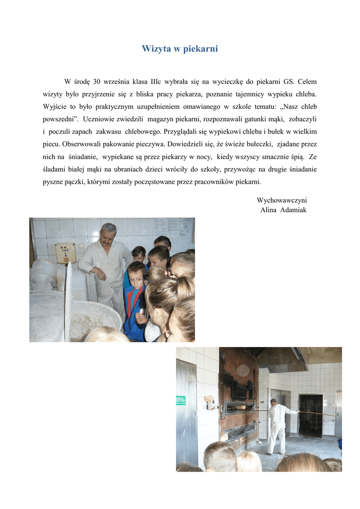 Wizyta w piekarni W środę 30 września klasa IIIc wybrała się na wycieczkę do piekarni GS. Celem wizyty było przyjrzenie się z bliska pracy piekarza, poznanie tajemnicy wypieku chleba. Wyjście to było praktycznym uzupełnieniem omawianego w szkole tematu: „Nasz chleb powszedni”. Uczniowie zwiedzili magazyn piekarni, rozpoznawali gatunki mąki, zobaczyli i poczuli zapach zakwasu chlebowego. Przyglądali się wypiekowi chleba i bułek w wielkim piecu. Obserwowali pakowanie pieczywa. Dowiedzieli się, że świeże bułeczki, zjadane przez nich na śniadanie, wypiekane są przez piekarzy w nocy, kiedy wszyscy smacznie śpią. Ze śladami białej mąki na ubraniach dzieci wróciły do szkoły, przywożąc na drugie śniadanie pyszne pączki, którymi zostały poczęstowane przez pracowników piekarni. Wychowawczyni Alina Adamiak