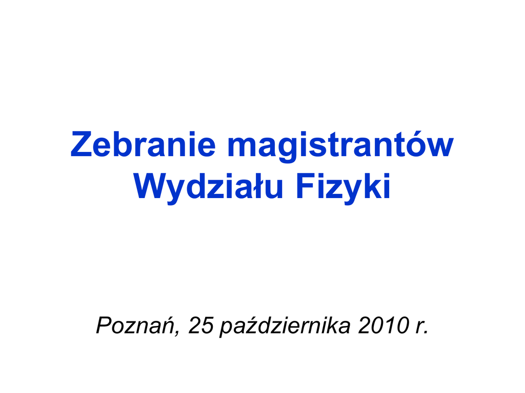 Zebranie magistrantów Wydziału Fizyki Poznań, 25 października 2010 r. Wydział Fizyki Uniwersytet im. Adama Mickiewicza w Poznaniu www.fizyka.amu.edu.pl Collegium Physicum Kampus Morasko 61-606 Poznań, ul. Umultowska 85 Struktura organizacyjna Wydziału Wydział Fizyki dziekanat, zaopatrzenie, warsztaty biblioteka Pracownie dydaktyczne Laboratoria wydziałowe 20 zakładów naukowych Instytut Instytut Akustyki Obserwat. Astronomiczne 4 zakłady naukowe Infrastruktura dydaktyczna Pracownie dydaktyczne • Pracownia Demonstracji i Popularyzacji Fizyki • Pracownia Dydaktyki Fizyki • Pracownia Fizyczna I • Pracownia Fizyczna II • Pracownia Elektroniki • Pracownia Elektroniki Cyfrowej • Pracownia Komputerowa • Pracownia Fizyki Widzenia i Optometrii Oferta dydaktyczna Studia II stopnia Akustyka Astronomia Biofizyka Fizyka Biofizyka molekularna Fizyka medyczna Optometria Fizyka teoret/dośw Informatyka stosowana Nanotechnologia Techniczne Zastosowania Internetu Reguły gry • Regulamin studiów UAM – Nowy regulamin studiów obowiązuje od 1 października 2010 r. • Uchwały Senatu UAM – Rola przedstawicieli studenckich • Uchwały Rady Wydziału Fizyki – Rola przedstawicieli studenckich • Zarządzenia Rektora UAM • Zarządzenia Dziekana Wydziału Fizyki Magister • Magister (z łac. mistrz, nauczyciel), mgr – tytuł zawodowy nadawany przez wyższe uczelnie po ukończeniu studiów drugiego stopnia, a w przypadku niektórych kierunków (farmacja, prawo, psychologia) – studiów jednolitych magisterskich oraz wcześniejszym zaliczeniu obowiązującego programu studiów, złożeniu pracy dyplomowej i zdaniu egzaminu magisterskiego. • Po ukończeniu niektórych kierunków nadawane są tytuły równorzędne tytułowi magistra: tytuł lekarza po ukończeniu studiów na kierunku lekarskim, lekarza stomatologii po stomatologii oraz lekarza weterynarii po weterynarii, które to kierunki faktycznie są studiami magisterskimi. Jest to odstępstwem od Deklaracji Bolońskiej, która stanowi, że po ukończeniu studiów magisterskich absolwent otrzymuje tytuł magistra. Jak napisać pracę magisterską? Regulacje prawne związane ze złożeniem pracy magisterskiej oraz egzaminem magisterskim reguluje Regulamin Studiów UAM (Rozdział VI) oraz mogą uściślać uchwały Rady Wydziału. Termin egzaminu magisterskiego oraz skład komisji egzaminacyjnej wyznacza Prodziekan ds. studenckich. Uwagi „techniczne” • Rozmiar pracy magisterskiej – Objętość, standardowo 60 – 120 stron znormalizowanego maszynopisu • Układ pracy: – – – – – – – Strona tytułowa (wzór) Spis streści (przejrzysty podział całego materiału) Streszczenia (w j. polskim i w j. angielskim) Wstęp Rozdziały Zakończenie Bibliografia Ustawa o prawie autorskim • Praca magisterska jako „utwór naukowy” podlega ustawowej ochronie. Prawnej ochronie podlegają także wszystkie przytaczane w pracy wyniki innych autorów. Przedmiotem prawa autorskiego jest każdy przejaw działalności twórczej o indywidualnym charakterze, ustalony w jakiejkolwiek postaci, niezależnie od wartości, przeznaczenia i sposobu wyrażenia (utwór). • Ustawa o prawach autorskich reguluje precyzyjnie pojęcia praw autorskich osobistych oraz praw autorskich majątkowych. Należy podkreślić, że ochrona przysługuje twórcy niezależnie od spełnienia jakichkolwiek formalności. UWAGA! Prace magisterskie realizujemy w zakładach naukowych! Zakład § 32 – Zakład organizuje i prowadzi pracę naukową lub dydaktyczną związaną z określoną specjalnością naukową lub dydaktyczną. – Zakład może być utworzony, gdy zatrudnionych w nim będzie co najmniej trzech nauczycieli akademickich, w tym jedna osoba mająca stopień naukowy doktora habilitowanego. Instytut Obserwatorium Astronomiczne • Dyrektor – prof. dr hab. Edwin Wnuk • Z-ca dyrektora – dr hab. Piotr Dybczyński – Brak struktury zakładowej! http://www.astro.amu.edu.pl Instytut Akustyki Dyrektor – prof. dr hab. Rufin Makarewicz Z-ca dyrektora – prof. dr hab. Aleksander Sęk http://www.ia.amu.edu.pl 4 zakłady naukowe: - Zakład Akustyki Pomieszczeń i Psychoakustyki – prof. A. Sęk - Zakład Akustyki Molekularnej – prof. A. Skumiel - Zakład Akustyki Środowiska – prof. R. Makarewicz - Zakład Elektroakustyki – dr hab. E. Skrodzka Zakłady naukowe (wydziałowe) Zakład Biofizyki Molekularnej – prof.. A. Patkowski Zakład Elektroniki Kwantowej – prof. R. Parzyński Zakład Fizyki Kwantowej – prof.. Z. Jacyna-Onyszkieicz Zakład Fizyki Makromolekularnej – prof. S. Jurga Zakład Fizyki Kryształów – prof.. B. Mróz Zakład Fizyki Komputerowej – prof.. G. Kamieniarz Zakład Fizyki Mezoskopowej – prof. J. Barnaś Zakład Kryształów Molekularnych – prof. P. Czarnecki Zakład Fizyki Matematycznej – prof. M. Błaszak Zakład Fizyki Powierzchni – prof. H. Puszkarski Zakład Fizyki Medycznej – prof.. R. Krzyminiewski Zakład Fizyki Dielektryków – prof.. M. Śliwińska-Bartkowiak Zakład Fizyki Wysokich Ciśnień – prof.. K. Hołderna-Natkaniec Zakład Informatyki Stosowanej – prof.. W. Hołubowicz Zakład Optyki – prof. Z. Błaszczak Zakład Optyki Nieliniowej – prof. R. Tanaś Zakład Radiospektroskopii – prof. J. Wasicki Zakład Stanów Elektronowych Ciała Stałego – prof. S. Robaszkiewicz Zakład Spektroskopii Jądrowego Rezon. Kwadrupolowego – prof. B. Nogaj Zakład Teorii Ciała Stałego – prof. R.Micnas Regulamin studiów UAM Rozdział IV. Ukończenie studiów • 1. Przygotowanie i złożenie pracy dyplomowej § 60. Przez pracę dyplomową rozumie się pracę licencjacką albo inżynierską oraz pracę magisterską. § 61. • 1. Pracę dyplomową student przygotowuje pod kierunkiem profesora albo doktora habilitowanego, przy czym pracę licencjacką albo inżynierską można przygotować pod kierunkiem nauczyciela akademickiego ze stopniem naukowym doktora. • 2. W szczeg