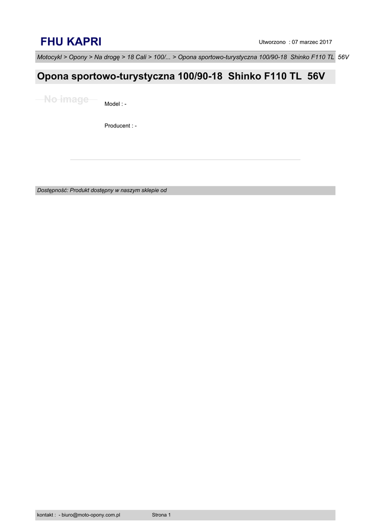 FHU KAPRI Utworzono : 07 marzec 2017 Motocykl > Opony > Na drogę > 18 Cali > 100/... > Opona sportowo-turystyczna 100/90-18 Shinko F110 TL 56V Opona sportowo-turystyczna 100/90-18 Shinko F110 TL 56V No image Model : - Producent : - Dostępność: Produkt dostępny w naszym sklepie od kontakt : - [email protected] Strona 1